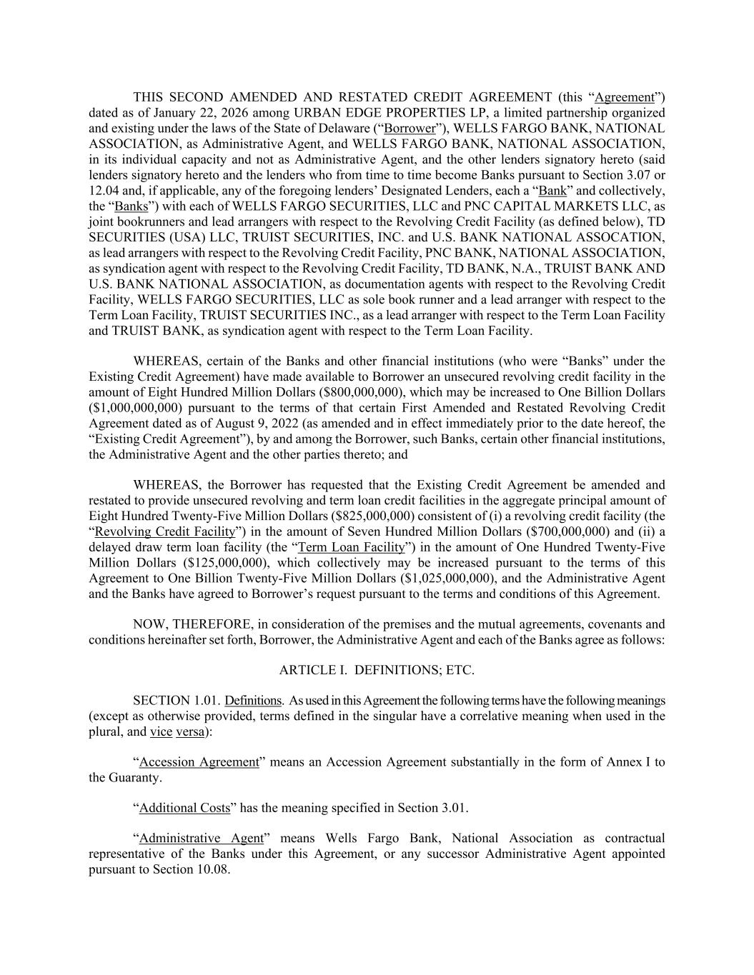 THIS SECOND AMENDED AND RESTATED CREDIT AGREEMENT (this “Agreement”) dated as of January 22, 2026 among URBAN EDGE PROPERTIES LP, a limited partnership organized and existing under the laws of the State of Delaware (“Borrower”), WELLS FARGO BANK, NATIONAL ASSOCIATION, as Administrative Agent, and WELLS FARGO BANK, NATIONAL ASSOCIATION, in its individual capacity and not as Administrative Agent, and the other lenders signatory hereto (said lenders signatory hereto and the lenders who from time to time become Banks pursuant to Section 3.07 or 12.04 and, if applicable, any of the foregoing lenders’ Designated Lenders, each a “Bank” and collectively, the “Banks”) with each of WELLS FARGO SECURITIES, LLC and PNC CAPITAL MARKETS LLC, as joint bookrunners and lead arrangers with respect to the Revolving Credit Facility (as defined below), TD SECURITIES (USA) LLC, TRUIST SECURITIES, INC. and U.S. BANK NATIONAL ASSOCATION, as lead arrangers with respect to the Revolving Credit Facility, PNC BANK, NATIONAL ASSOCIATION, as syndication agent with respect to the Revolving Credit Facility, TD BANK, N.A., TRUIST BANK AND U.S. BANK NATIONAL ASSOCIATION, as documentation agents with respect to the Revolving Credit Facility, WELLS FARGO SECURITIES, LLC as sole book runner and a lead arranger with respect to the Term Loan Facility, TRUIST SECURITIES INC., as a lead arranger with respect to the Term Loan Facility and TRUIST BANK, as syndication agent with respect to the Term Loan Facility. WHEREAS, certain of the Banks and other financial institutions (who were “Banks” under the Existing Credit Agreement) have made available to Borrower an unsecured revolving credit facility in the amount of Eight Hundred Million Dollars ($800,000,000), which may be increased to One Billion Dollars ($1,000,000,000) pursuant to the terms of that certain First Amended and Restated Revolving Credit Agreement dated as of August 9, 2022 (as amended and in effect immediately prior to the date hereof, the “Existing Credit Agreement”), by and among the Borrower, such Banks, certain other financial institutions, the Administrative Agent and the other parties thereto; and WHEREAS, the Borrower has requested that the Existing Credit Agreement be amended and restated to provide unsecured revolving and term loan credit facilities in the aggregate principal amount of Eight Hundred Twenty-Five Million Dollars ($825,000,000) consistent of (i) a revolving credit facility (the “Revolving Credit Facility”) in the amount of Seven Hundred Million Dollars ($700,000,000) and (ii) a delayed draw term loan facility (the “Term Loan Facility”) in the amount of One Hundred Twenty-Five Million Dollars ($125,000,000), which collectively may be increased pursuant to the terms of this Agreement to One Billion Twenty-Five Million Dollars ($1,025,000,000), and the Administrative Agent and the Banks have agreed to Borrower’s request pursuant to the terms and conditions of this Agreement. NOW, THEREFORE, in consideration of the premises and the mutual agreements, covenants and conditions hereinafter set forth, Borrower, the Administrative Agent and each of the Banks agree as follows: ARTICLE I. DEFINITIONS; ETC. SECTION 1.01. Definitions. As used in this Agreement the following terms have the following meanings (except as otherwise provided, terms defined in the singular have a correlative meaning when used in the plural, and vice versa): “Accession Agreement” means an Accession Agreement substantially in the form of Annex I to the Guaranty. “Additional Costs” has the meaning specified in Section 3.01. “Administrative Agent” means Wells Fargo Bank, National Association as contractual representative of the Banks under this Agreement, or any successor Administrative Agent appointed pursuant to Section 10.08.