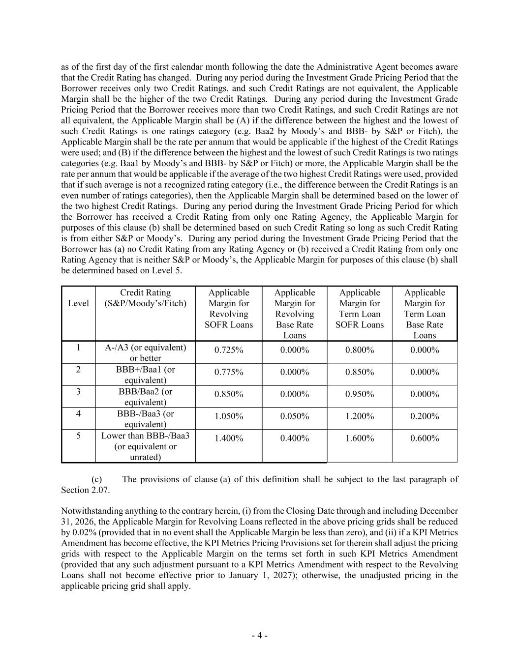 - 4 - as of the first day of the first calendar month following the date the Administrative Agent becomes aware that the Credit Rating has changed. During any period during the Investment Grade Pricing Period that the Borrower receives only two Credit Ratings, and such Credit Ratings are not equivalent, the Applicable Margin shall be the higher of the two Credit Ratings. During any period during the Investment Grade Pricing Period that the Borrower receives more than two Credit Ratings, and such Credit Ratings are not all equivalent, the Applicable Margin shall be (A) if the difference between the highest and the lowest of such Credit Ratings is one ratings category (e.g. Baa2 by Moody’s and BBB- by S&P or Fitch), the Applicable Margin shall be the rate per annum that would be applicable if the highest of the Credit Ratings were used; and (B) if the difference between the highest and the lowest of such Credit Ratings is two ratings categories (e.g. Baa1 by Moody’s and BBB- by S&P or Fitch) or more, the Applicable Margin shall be the rate per annum that would be applicable if the average of the two highest Credit Ratings were used, provided that if such average is not a recognized rating category (i.e., the difference between the Credit Ratings is an even number of ratings categories), then the Applicable Margin shall be determined based on the lower of the two highest Credit Ratings. During any period during the Investment Grade Pricing Period for which the Borrower has received a Credit Rating from only one Rating Agency, the Applicable Margin for purposes of this clause (b) shall be determined based on such Credit Rating so long as such Credit Rating is from either S&P or Moody’s. During any period during the Investment Grade Pricing Period that the Borrower has (a) no Credit Rating from any Rating Agency or (b) received a Credit Rating from only one Rating Agency that is neither S&P or Moody’s, the Applicable Margin for purposes of this clause (b) shall be determined based on Level 5. Level Credit Rating (S&P/Moody’s/Fitch) Applicable Margin for Revolving SOFR Loans Applicable Margin for Revolving Base Rate Loans Applicable Margin for Term Loan SOFR Loans Applicable Margin for Term Loan Base Rate Loans 1 A-/A3 (or equivalent) or better 0.725% 0.000% 0.800% 0.000% 2 BBB+/Baa1 (or equivalent) 0.775% 0.000% 0.850% 0.000% 3 BBB/Baa2 (or equivalent) 0.850% 0.000% 0.950% 0.000% 4 BBB-/Baa3 (or equivalent) 1.050% 0.050% 1.200% 0.200% 5 Lower than BBB-/Baa3 (or equivalent or unrated) 1.400% 0.400% 1.600% 0.600% (c) The provisions of clause (a) of this definition shall be subject to the last paragraph of Section 2.07. Notwithstanding anything to the contrary herein, (i) from the Closing Date through and including December 31, 2026, the Applicable Margin for Revolving Loans reflected in the above pricing grids shall be reduced by 0.02% (provided that in no event shall the Applicable Margin be less than zero), and (ii) if a KPI Metrics Amendment has become effective, the KPI Metrics Pricing Provisions set for therein shall adjust the pricing grids with respect to the Applicable Margin on the terms set forth in such KPI Metrics Amendment (provided that any such adjustment pursuant to a KPI Metrics Amendment with respect to the Revolving Loans shall not become effective prior to January 1, 2027); otherwise, the unadjusted pricing in the applicable pricing grid shall apply.