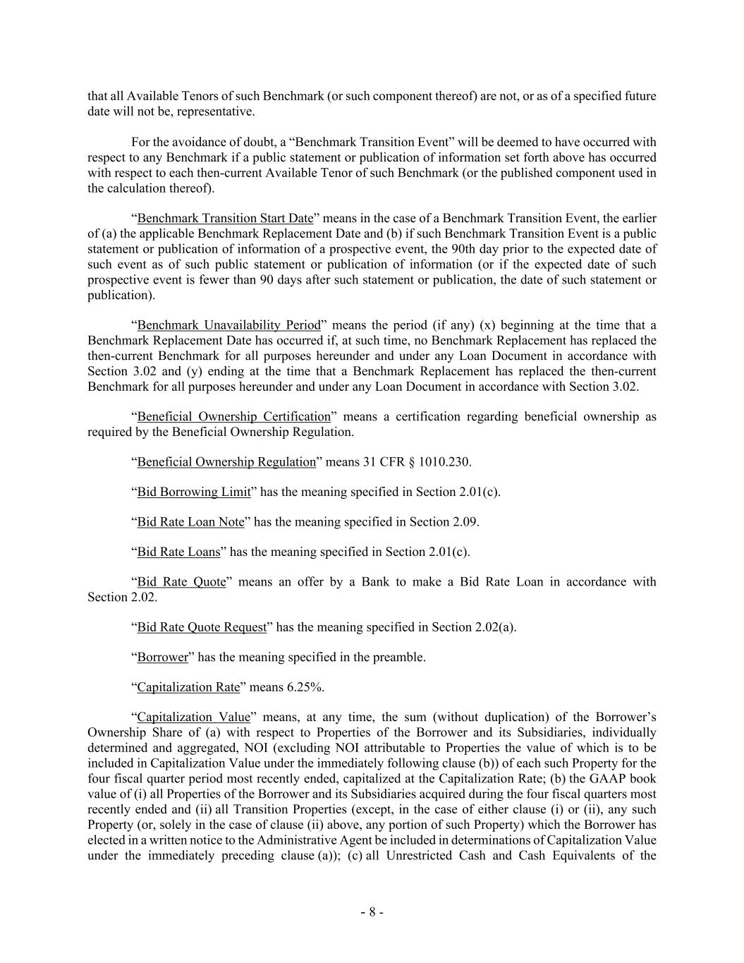 - 8 - that all Available Tenors of such Benchmark (or such component thereof) are not, or as of a specified future date will not be, representative. For the avoidance of doubt, a “Benchmark Transition Event” will be deemed to have occurred with respect to any Benchmark if a public statement or publication of information set forth above has occurred with respect to each then-current Available Tenor of such Benchmark (or the published component used in the calculation thereof). “Benchmark Transition Start Date” means in the case of a Benchmark Transition Event, the earlier of (a) the applicable Benchmark Replacement Date and (b) if such Benchmark Transition Event is a public statement or publication of information of a prospective event, the 90th day prior to the expected date of such event as of such public statement or publication of information (or if the expected date of such prospective event is fewer than 90 days after such statement or publication, the date of such statement or publication). “Benchmark Unavailability Period” means the period (if any) (x) beginning at the time that a Benchmark Replacement Date has occurred if, at such time, no Benchmark Replacement has replaced the then-current Benchmark for all purposes hereunder and under any Loan Document in accordance with Section 3.02 and (y) ending at the time that a Benchmark Replacement has replaced the then-current Benchmark for all purposes hereunder and under any Loan Document in accordance with Section 3.02. “Beneficial Ownership Certification” means a certification regarding beneficial ownership as required by the Beneficial Ownership Regulation. “Beneficial Ownership Regulation” means 31 CFR § 1010.230. “Bid Borrowing Limit” has the meaning specified in Section 2.01(c). “Bid Rate Loan Note” has the meaning specified in Section 2.09. “Bid Rate Loans” has the meaning specified in Section 2.01(c). “Bid Rate Quote” means an offer by a Bank to make a Bid Rate Loan in accordance with Section 2.02. “Bid Rate Quote Request” has the meaning specified in Section 2.02(a). “Borrower” has the meaning specified in the preamble. “Capitalization Rate” means 6.25%. “Capitalization Value” means, at any time, the sum (without duplication) of the Borrower’s Ownership Share of (a) with respect to Properties of the Borrower and its Subsidiaries, individually determined and aggregated, NOI (excluding NOI attributable to Properties the value of which is to be included in Capitalization Value under the immediately following clause (b)) of each such Property for the four fiscal quarter period most recently ended, capitalized at the Capitalization Rate; (b) the GAAP book value of (i) all Properties of the Borrower and its Subsidiaries acquired during the four fiscal quarters most recently ended and (ii) all Transition Properties (except, in the case of either clause (i) or (ii), any such Property (or, solely in the case of clause (ii) above, any portion of such Property) which the Borrower has elected in a written notice to the Administrative Agent be included in determinations of Capitalization Value under the immediately preceding clause (a)); (c) all Unrestricted Cash and Cash Equivalents of the