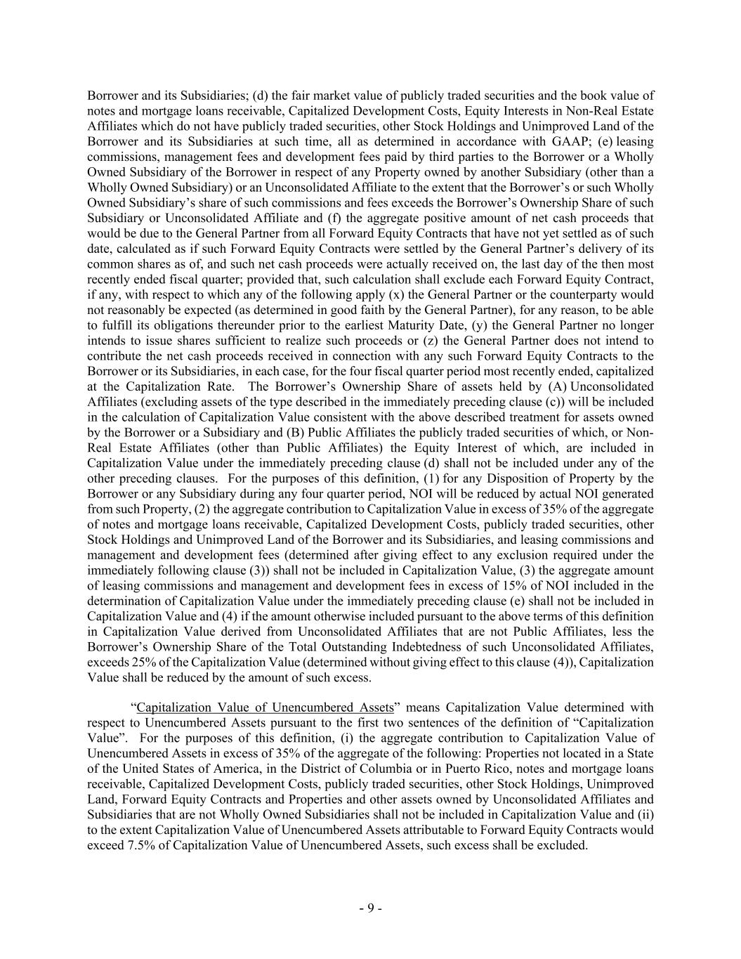 - 9 - Borrower and its Subsidiaries; (d) the fair market value of publicly traded securities and the book value of notes and mortgage loans receivable, Capitalized Development Costs, Equity Interests in Non-Real Estate Affiliates which do not have publicly traded securities, other Stock Holdings and Unimproved Land of the Borrower and its Subsidiaries at such time, all as determined in accordance with GAAP; (e) leasing commissions, management fees and development fees paid by third parties to the Borrower or a Wholly Owned Subsidiary of the Borrower in respect of any Property owned by another Subsidiary (other than a Wholly Owned Subsidiary) or an Unconsolidated Affiliate to the extent that the Borrower’s or such Wholly Owned Subsidiary’s share of such commissions and fees exceeds the Borrower’s Ownership Share of such Subsidiary or Unconsolidated Affiliate and (f) the aggregate positive amount of net cash proceeds that would be due to the General Partner from all Forward Equity Contracts that have not yet settled as of such date, calculated as if such Forward Equity Contracts were settled by the General Partner’s delivery of its common shares as of, and such net cash proceeds were actually received on, the last day of the then most recently ended fiscal quarter; provided that, such calculation shall exclude each Forward Equity Contract, if any, with respect to which any of the following apply (x) the General Partner or the counterparty would not reasonably be expected (as determined in good faith by the General Partner), for any reason, to be able to fulfill its obligations thereunder prior to the earliest Maturity Date, (y) the General Partner no longer intends to issue shares sufficient to realize such proceeds or (z) the General Partner does not intend to contribute the net cash proceeds received in connection with any such Forward Equity Contracts to the Borrower or its Subsidiaries, in each case, for the four fiscal quarter period most recently ended, capitalized at the Capitalization Rate. The Borrower’s Ownership Share of assets held by (A) Unconsolidated Affiliates (excluding assets of the type described in the immediately preceding clause (c)) will be included in the calculation of Capitalization Value consistent with the above described treatment for assets owned by the Borrower or a Subsidiary and (B) Public Affiliates the publicly traded securities of which, or Non- Real Estate Affiliates (other than Public Affiliates) the Equity Interest of which, are included in Capitalization Value under the immediately preceding clause (d) shall not be included under any of the other preceding clauses. For the purposes of this definition, (1) for any Disposition of Property by the Borrower or any Subsidiary during any four quarter period, NOI will be reduced by actual NOI generated from such Property, (2) the aggregate contribution to Capitalization Value in excess of 35% of the aggregate of notes and mortgage loans receivable, Capitalized Development Costs, publicly traded securities, other Stock Holdings and Unimproved Land of the Borrower and its Subsidiaries, and leasing commissions and management and development fees (determined after giving effect to any exclusion required under the immediately following clause (3)) shall not be included in Capitalization Value, (3) the aggregate amount of leasing commissions and management and development fees in excess of 15% of NOI included in the determination of Capitalization Value under the immediately preceding clause (e) shall not be included in Capitalization Value and (4) if the amount otherwise included pursuant to the above terms of this definition in Capitalization Value derived from Unconsolidated Affiliates that are not Public Affiliates, less the Borrower’s Ownership Share of the Total Outstanding Indebtedness of such Unconsolidated Affiliates, exceeds 25% of the Capitalization Value (determined without giving effect to this clause (4)), Capitalization Value shall be reduced by the amount of such excess. “Capitalization Value of Unencumbered Assets” means Capitalization Value determined with respect to Unencumbered Assets pursuant to the first two sentences of the definition of “Capitalization Value”. For the purposes of this definition, (i) the aggregate contribution to Capitalization Value of Unencumbered Assets in excess of 35% of the aggregate of the following: Properties not located in a State of the United States of America, in the District of Columbia or in Puerto Rico, notes and mortgage loans receivable, Capitalized Development Costs, publicly traded securities, other Stock Holdings, Unimproved Land, Forward Equity Contracts and Properties and other assets owned by Unconsolidated Affiliates and Subsidiaries that are not Wholly Owned Subsidiaries shall not be included in Capitalization Value and (ii) to the extent Capitalization Value of Unencumbered Assets attributable to Forward Equity Contracts would exceed 7.5% of Capitalization Value of Unencumbered Assets, such excess shall be excluded.
