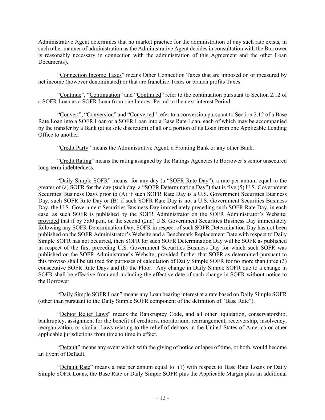 - 12 - Administrative Agent determines that no market practice for the administration of any such rate exists, in such other manner of administration as the Administrative Agent decides in consultation with the Borrower is reasonably necessary in connection with the administration of this Agreement and the other Loan Documents). “Connection Income Taxes” means Other Connection Taxes that are imposed on or measured by net income (however denominated) or that are franchise Taxes or branch profits Taxes. “Continue”, “Continuation” and “Continued” refer to the continuation pursuant to Section 2.12 of a SOFR Loan as a SOFR Loan from one Interest Period to the next interest Period. “Convert”, “Conversion” and “Converted” refer to a conversion pursuant to Section 2.12 of a Base Rate Loan into a SOFR Loan or a SOFR Loan into a Base Rate Loan, each of which may be accompanied by the transfer by a Bank (at its sole discretion) of all or a portion of its Loan from one Applicable Lending Office to another. “Credit Party” means the Administrative Agent, a Fronting Bank or any other Bank. “Credit Rating” means the rating assigned by the Ratings Agencies to Borrower’s senior unsecured long-term indebtedness. “Daily Simple SOFR” means for any day (a “SOFR Rate Day”), a rate per annum equal to the greater of (a) SOFR for the day (such day, a “SOFR Determination Day”) that is five (5) U.S. Government Securities Business Days prior to (A) if such SOFR Rate Day is a U.S. Government Securities Business Day, such SOFR Rate Day or (B) if such SOFR Rate Day is not a U.S. Government Securities Business Day, the U.S. Government Securities Business Day immediately preceding such SOFR Rate Day, in each case, as such SOFR is published by the SOFR Administrator on the SOFR Administrator’s Website; provided that if by 5:00 p.m. on the second (2nd) U.S. Government Securities Business Day immediately following any SOFR Determination Day, SOFR in respect of such SOFR Determination Day has not been published on the SOFR Administrator’s Website and a Benchmark Replacement Date with respect to Daily Simple SOFR has not occurred, then SOFR for such SOFR Determination Day will be SOFR as published in respect of the first preceding U.S. Government Securities Business Day for which such SOFR was published on the SOFR Administrator’s Website; provided further that SOFR as determined pursuant to this proviso shall be utilized for purposes of calculation of Daily Simple SOFR for no more than three (3) consecutive SOFR Rate Days and (b) the Floor. Any change in Daily Simple SOFR due to a change in SOFR shall be effective from and including the effective date of such change in SOFR without notice to the Borrower. “Daily Simple SOFR Loan” means any Loan bearing interest at a rate based on Daily Simple SOFR (other than pursuant to the Daily Simple SOFR component of the definition of “Base Rate”). “Debtor Relief Laws” means the Bankruptcy Code, and all other liquidation, conservatorship, bankruptcy, assignment for the benefit of creditors, moratorium, rearrangement, receivership, insolvency, reorganization, or similar Laws relating to the relief of debtors in the United States of America or other applicable jurisdictions from time to time in effect. “Default” means any event which with the giving of notice or lapse of time, or both, would become an Event of Default. “Default Rate” means a rate per annum equal to: (1) with respect to Base Rate Loans or Daily Simple SOFR Loans, the Base Rate or Daily Simple SOFR plus the Applicable Margin plus an additional