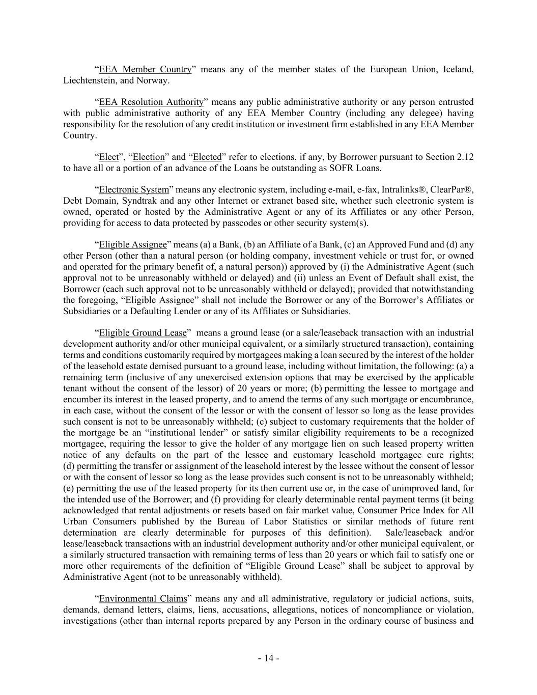 - 14 - “EEA Member Country” means any of the member states of the European Union, Iceland, Liechtenstein, and Norway. “EEA Resolution Authority” means any public administrative authority or any person entrusted with public administrative authority of any EEA Member Country (including any delegee) having responsibility for the resolution of any credit institution or investment firm established in any EEA Member Country. “Elect”, “Election” and “Elected” refer to elections, if any, by Borrower pursuant to Section 2.12 to have all or a portion of an advance of the Loans be outstanding as SOFR Loans. “Electronic System” means any electronic system, including e-mail, e-fax, Intralinks®, ClearPar®, Debt Domain, Syndtrak and any other Internet or extranet based site, whether such electronic system is owned, operated or hosted by the Administrative Agent or any of its Affiliates or any other Person, providing for access to data protected by passcodes or other security system(s). “Eligible Assignee” means (a) a Bank, (b) an Affiliate of a Bank, (c) an Approved Fund and (d) any other Person (other than a natural person (or holding company, investment vehicle or trust for, or owned and operated for the primary benefit of, a natural person)) approved by (i) the Administrative Agent (such approval not to be unreasonably withheld or delayed) and (ii) unless an Event of Default shall exist, the Borrower (each such approval not to be unreasonably withheld or delayed); provided that notwithstanding the foregoing, “Eligible Assignee” shall not include the Borrower or any of the Borrower’s Affiliates or Subsidiaries or a Defaulting Lender or any of its Affiliates or Subsidiaries. “Eligible Ground Lease” means a ground lease (or a sale/leaseback transaction with an industrial development authority and/or other municipal equivalent, or a similarly structured transaction), containing terms and conditions customarily required by mortgagees making a loan secured by the interest of the holder of the leasehold estate demised pursuant to a ground lease, including without limitation, the following: (a) a remaining term (inclusive of any unexercised extension options that may be exercised by the applicable tenant without the consent of the lessor) of 20 years or more; (b) permitting the lessee to mortgage and encumber its interest in the leased property, and to amend the terms of any such mortgage or encumbrance, in each case, without the consent of the lessor or with the consent of lessor so long as the lease provides such consent is not to be unreasonably withheld; (c) subject to customary requirements that the holder of the mortgage be an “institutional lender” or satisfy similar eligibility requirements to be a recognized mortgagee, requiring the lessor to give the holder of any mortgage lien on such leased property written notice of any defaults on the part of the lessee and customary leasehold mortgagee cure rights; (d) permitting the transfer or assignment of the leasehold interest by the lessee without the consent of lessor or with the consent of lessor so long as the lease provides such consent is not to be unreasonably withheld; (e) permitting the use of the leased property for its then current use or, in the case of unimproved land, for the intended use of the Borrower; and (f) providing for clearly determinable rental payment terms (it being acknowledged that rental adjustments or resets based on fair market value, Consumer Price Index for All Urban Consumers published by the Bureau of Labor Statistics or similar methods of future rent determination are clearly determinable for purposes of this definition). Sale/leaseback and/or lease/leaseback transactions with an industrial development authority and/or other municipal equivalent, or a similarly structured transaction with remaining terms of less than 20 years or which fail to satisfy one or more other requirements of the definition of “Eligible Ground Lease” shall be subject to approval by Administrative Agent (not to be unreasonably withheld). “Environmental Claims” means any and all administrative, regulatory or judicial actions, suits, demands, demand letters, claims, liens, accusations, allegations, notices of noncompliance or violation, investigations (other than internal reports prepared by any Person in the ordinary course of business and