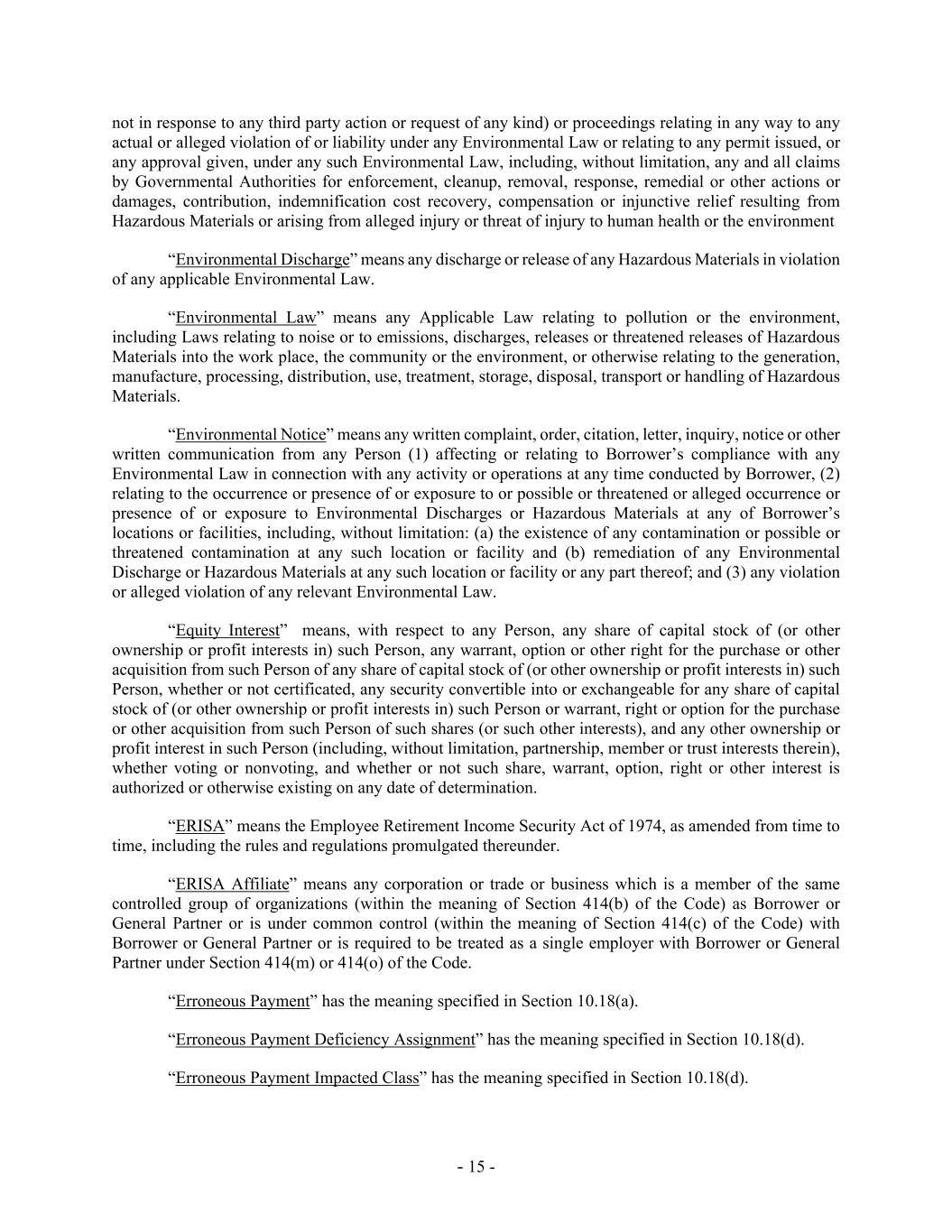 - 15 - not in response to any third party action or request of any kind) or proceedings relating in any way to any actual or alleged violation of or liability under any Environmental Law or relating to any permit issued, or any approval given, under any such Environmental Law, including, without limitation, any and all claims by Governmental Authorities for enforcement, cleanup, removal, response, remedial or other actions or damages, contribution, indemnification cost recovery, compensation or injunctive relief resulting from Hazardous Materials or arising from alleged injury or threat of injury to human health or the environment “Environmental Discharge” means any discharge or release of any Hazardous Materials in violation of any applicable Environmental Law. “Environmental Law” means any Applicable Law relating to pollution or the environment, including Laws relating to noise or to emissions, discharges, releases or threatened releases of Hazardous Materials into the work place, the community or the environment, or otherwise relating to the generation, manufacture, processing, distribution, use, treatment, storage, disposal, transport or handling of Hazardous Materials. “Environmental Notice” means any written complaint, order, citation, letter, inquiry, notice or other written communication from any Person (1) affecting or relating to Borrower’s compliance with any Environmental Law in connection with any activity or operations at any time conducted by Borrower, (2) relating to the occurrence or presence of or exposure to or possible or threatened or alleged occurrence or presence of or exposure to Environmental Discharges or Hazardous Materials at any of Borrower’s locations or facilities, including, without limitation: (a) the existence of any contamination or possible or threatened contamination at any such location or facility and (b) remediation of any Environmental Discharge or Hazardous Materials at any such location or facility or any part thereof; and (3) any violation or alleged violation of any relevant Environmental Law. “Equity Interest” means, with respect to any Person, any share of capital stock of (or other ownership or profit interests in) such Person, any warrant, option or other right for the purchase or other acquisition from such Person of any share of capital stock of (or other ownership or profit interests in) such Person, whether or not certificated, any security convertible into or exchangeable for any share of capital stock of (or other ownership or profit interests in) such Person or warrant, right or option for the purchase or other acquisition from such Person of such shares (or such other interests), and any other ownership or profit interest in such Person (including, without limitation, partnership, member or trust interests therein), whether voting or nonvoting, and whether or not such share, warrant, option, right or other interest is authorized or otherwise existing on any date of determination. “ERISA” means the Employee Retirement Income Security Act of 1974, as amended from time to time, including the rules and regulations promulgated thereunder. “ERISA Affiliate” means any corporation or trade or business which is a member of the same controlled group of organizations (within the meaning of Section 414(b) of the Code) as Borrower or General Partner or is under common control (within the meaning of Section 414(c) of the Code) with Borrower or General Partner or is required to be treated as a single employer with Borrower or General Partner under Section 414(m) or 414(o) of the Code. “Erroneous Payment” has the meaning specified in Section 10.18(a). “Erroneous Payment Deficiency Assignment” has the meaning specified in Section 10.18(d). “Erroneous Payment Impacted Class” has the meaning specified in Section 10.18(d).
