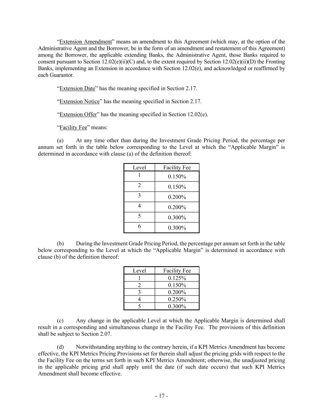 - 17 - “Extension Amendment” means an amendment to this Agreement (which may, at the option of the Administrative Agent and the Borrower, be in the form of an amendment and restatement of this Agreement) among the Borrower, the applicable extending Banks, the Administrative Agent, those Banks required to consent pursuant to Section 12.02(e)(ii)(C) and, to the extent required by Section 12.02(e)(ii)(D) the Fronting Banks, implementing an Extension in accordance with Section 12.02(e), and acknowledged or reaffirmed by each Guarantor. “Extension Date” has the meaning specified in Section 2.17. “Extension Notice” has the meaning specified in Section 2.17. “Extension Offer” has the meaning specified in Section 12.02(e). “Facility Fee” means: (a) At any time other than during the Investment Grade Pricing Period, the percentage per annum set forth in the table below corresponding to the Level at which the “Applicable Margin” is determined in accordance with clause (a) of the definition thereof: Level Facility Fee 1 0.150% 2 0.150% 3 0.200% 4 0.200% 5 0.300% 6 0.300% (b) During the Investment Grade Pricing Period, the percentage per annum set forth in the table below corresponding to the Level at which the “Applicable Margin” is determined in accordance with clause (b) of the definition thereof: Level Facility Fee 1 0.125% 2 0.150% 3 0.200% 4 0.250% 5 0.300% (c) Any change in the applicable Level at which the Applicable Margin is determined shall result in a corresponding and simultaneous change in the Facility Fee. The provisions of this definition shall be subject to Section 2.07. (d) Notwithstanding anything to the contrary herein, if a KPI Metrics Amendment has become effective, the KPI Metrics Pricing Provisions set for therein shall adjust the pricing grids with respect to the the Facility Fee on the terms set forth in such KPI Metrics Amendment; otherwise, the unadjusted pricing in the applicable pricing grid shall apply until the date (if such date occurs) that such KPI Metrics Amendment shall become effective.