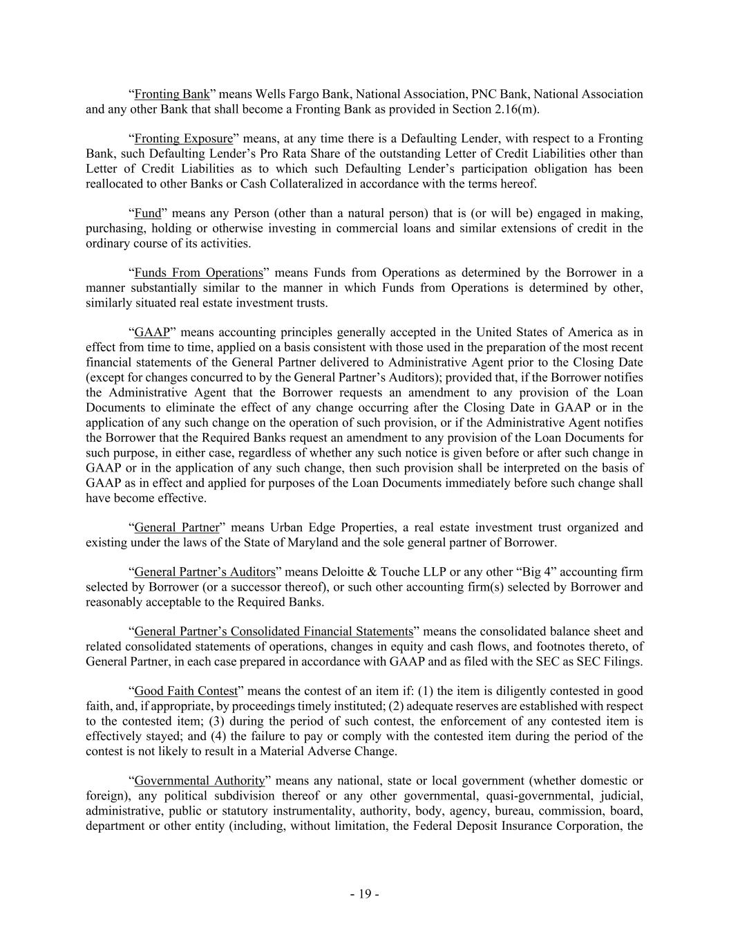 - 19 - “Fronting Bank” means Wells Fargo Bank, National Association, PNC Bank, National Association and any other Bank that shall become a Fronting Bank as provided in Section 2.16(m). “Fronting Exposure” means, at any time there is a Defaulting Lender, with respect to a Fronting Bank, such Defaulting Lender’s Pro Rata Share of the outstanding Letter of Credit Liabilities other than Letter of Credit Liabilities as to which such Defaulting Lender’s participation obligation has been reallocated to other Banks or Cash Collateralized in accordance with the terms hereof. “Fund” means any Person (other than a natural person) that is (or will be) engaged in making, purchasing, holding or otherwise investing in commercial loans and similar extensions of credit in the ordinary course of its activities. “Funds From Operations” means Funds from Operations as determined by the Borrower in a manner substantially similar to the manner in which Funds from Operations is determined by other, similarly situated real estate investment trusts. “GAAP” means accounting principles generally accepted in the United States of America as in effect from time to time, applied on a basis consistent with those used in the preparation of the most recent financial statements of the General Partner delivered to Administrative Agent prior to the Closing Date (except for changes concurred to by the General Partner’s Auditors); provided that, if the Borrower notifies the Administrative Agent that the Borrower requests an amendment to any provision of the Loan Documents to eliminate the effect of any change occurring after the Closing Date in GAAP or in the application of any such change on the operation of such provision, or if the Administrative Agent notifies the Borrower that the Required Banks request an amendment to any provision of the Loan Documents for such purpose, in either case, regardless of whether any such notice is given before or after such change in GAAP or in the application of any such change, then such provision shall be interpreted on the basis of GAAP as in effect and applied for purposes of the Loan Documents immediately before such change shall have become effective. “General Partner” means Urban Edge Properties, a real estate investment trust organized and existing under the laws of the State of Maryland and the sole general partner of Borrower. “General Partner’s Auditors” means Deloitte & Touche LLP or any other “Big 4” accounting firm selected by Borrower (or a successor thereof), or such other accounting firm(s) selected by Borrower and reasonably acceptable to the Required Banks. “General Partner’s Consolidated Financial Statements” means the consolidated balance sheet and related consolidated statements of operations, changes in equity and cash flows, and footnotes thereto, of General Partner, in each case prepared in accordance with GAAP and as filed with the SEC as SEC Filings. “Good Faith Contest” means the contest of an item if: (1) the item is diligently contested in good faith, and, if appropriate, by proceedings timely instituted; (2) adequate reserves are established with respect to the contested item; (3) during the period of such contest, the enforcement of any contested item is effectively stayed; and (4) the failure to pay or comply with the contested item during the period of the contest is not likely to result in a Material Adverse Change. “Governmental Authority” means any national, state or local government (whether domestic or foreign), any political subdivision thereof or any other governmental, quasi-governmental, judicial, administrative, public or statutory instrumentality, authority, body, agency, bureau, commission, board, department or other entity (including, without limitation, the Federal Deposit Insurance Corporation, the