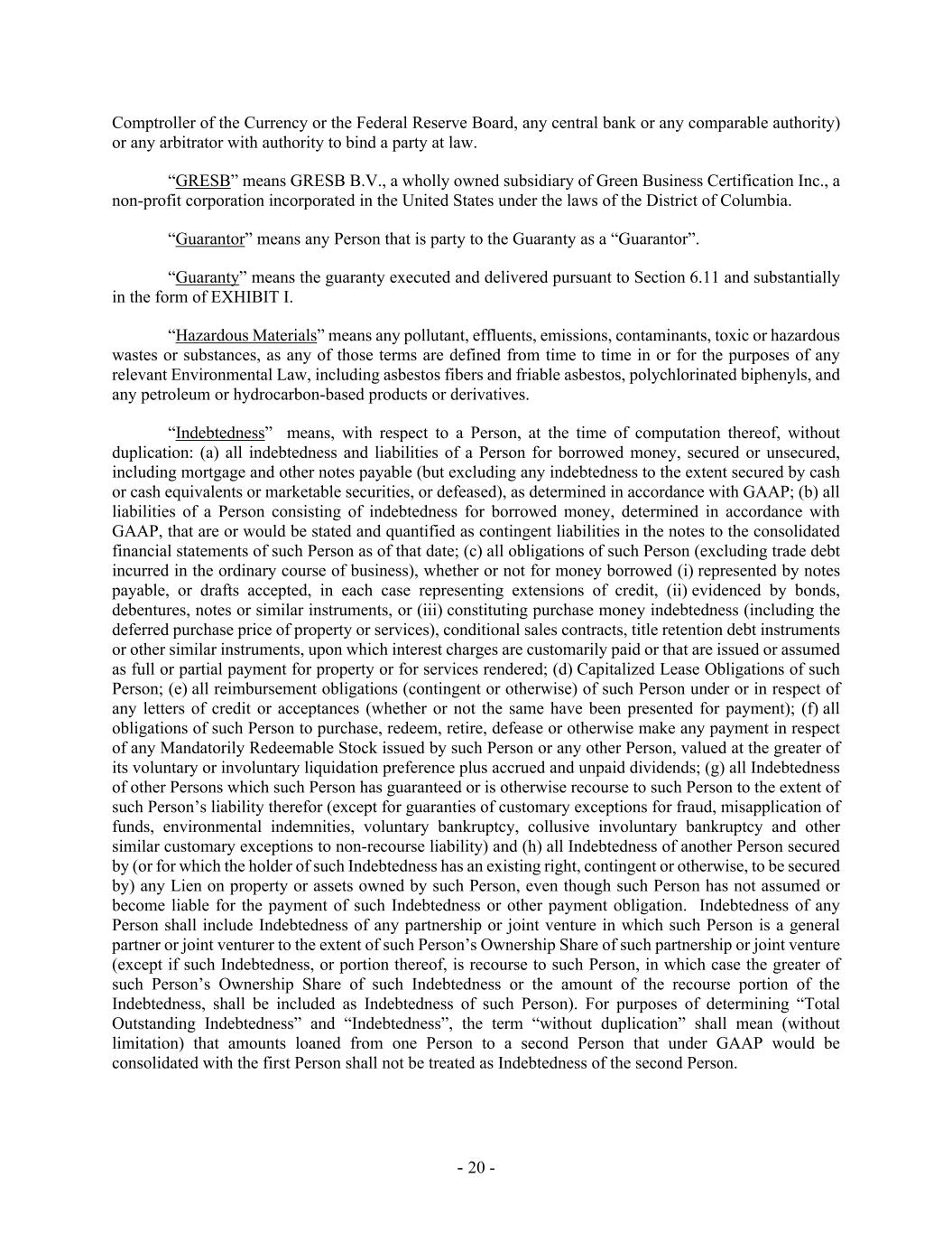 - 20 - Comptroller of the Currency or the Federal Reserve Board, any central bank or any comparable authority) or any arbitrator with authority to bind a party at law. “GRESB” means GRESB B.V., a wholly owned subsidiary of Green Business Certification Inc., a non-profit corporation incorporated in the United States under the laws of the District of Columbia. “Guarantor” means any Person that is party to the Guaranty as a “Guarantor”. “Guaranty” means the guaranty executed and delivered pursuant to Section 6.11 and substantially in the form of EXHIBIT I. “Hazardous Materials” means any pollutant, effluents, emissions, contaminants, toxic or hazardous wastes or substances, as any of those terms are defined from time to time in or for the purposes of any relevant Environmental Law, including asbestos fibers and friable asbestos, polychlorinated biphenyls, and any petroleum or hydrocarbon-based products or derivatives. “Indebtedness” means, with respect to a Person, at the time of computation thereof, without duplication: (a) all indebtedness and liabilities of a Person for borrowed money, secured or unsecured, including mortgage and other notes payable (but excluding any indebtedness to the extent secured by cash or cash equivalents or marketable securities, or defeased), as determined in accordance with GAAP; (b) all liabilities of a Person consisting of indebtedness for borrowed money, determined in accordance with GAAP, that are or would be stated and quantified as contingent liabilities in the notes to the consolidated financial statements of such Person as of that date; (c) all obligations of such Person (excluding trade debt incurred in the ordinary course of business), whether or not for money borrowed (i) represented by notes payable, or drafts accepted, in each case representing extensions of credit, (ii) evidenced by bonds, debentures, notes or similar instruments, or (iii) constituting purchase money indebtedness (including the deferred purchase price of property or services), conditional sales contracts, title retention debt instruments or other similar instruments, upon which interest charges are customarily paid or that are issued or assumed as full or partial payment for property or for services rendered; (d) Capitalized Lease Obligations of such Person; (e) all reimbursement obligations (contingent or otherwise) of such Person under or in respect of any letters of credit or acceptances (whether or not the same have been presented for payment); (f) all obligations of such Person to purchase, redeem, retire, defease or otherwise make any payment in respect of any Mandatorily Redeemable Stock issued by such Person or any other Person, valued at the greater of its voluntary or involuntary liquidation preference plus accrued and unpaid dividends; (g) all Indebtedness of other Persons which such Person has guaranteed or is otherwise recourse to such Person to the extent of such Person’s liability therefor (except for guaranties of customary exceptions for fraud, misapplication of funds, environmental indemnities, voluntary bankruptcy, collusive involuntary bankruptcy and other similar customary exceptions to non-recourse liability) and (h) all Indebtedness of another Person secured by (or for which the holder of such Indebtedness has an existing right, contingent or otherwise, to be secured by) any Lien on property or assets owned by such Person, even though such Person has not assumed or become liable for the payment of such Indebtedness or other payment obligation. Indebtedness of any Person shall include Indebtedness of any partnership or joint venture in which such Person is a general partner or joint venturer to the extent of such Person’s Ownership Share of such partnership or joint venture (except if such Indebtedness, or portion thereof, is recourse to such Person, in which case the greater of such Person’s Ownership Share of such Indebtedness or the amount of the recourse portion of the Indebtedness, shall be included as Indebtedness of such Person). For purposes of determining “Total Outstanding Indebtedness” and “Indebtedness”, the term “without duplication” shall mean (without limitation) that amounts loaned from one Person to a second Person that under GAAP would be consolidated with the first Person shall not be treated as Indebtedness of the second Person.