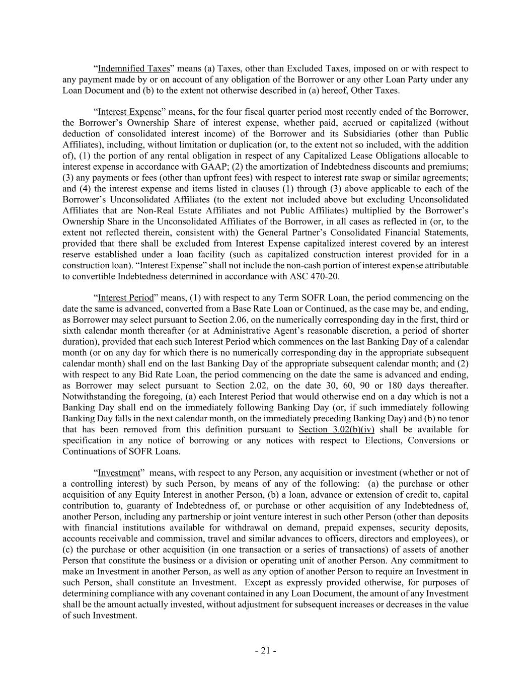 - 21 - “Indemnified Taxes” means (a) Taxes, other than Excluded Taxes, imposed on or with respect to any payment made by or on account of any obligation of the Borrower or any other Loan Party under any Loan Document and (b) to the extent not otherwise described in (a) hereof, Other Taxes. “Interest Expense” means, for the four fiscal quarter period most recently ended of the Borrower, the Borrower’s Ownership Share of interest expense, whether paid, accrued or capitalized (without deduction of consolidated interest income) of the Borrower and its Subsidiaries (other than Public Affiliates), including, without limitation or duplication (or, to the extent not so included, with the addition of), (1) the portion of any rental obligation in respect of any Capitalized Lease Obligations allocable to interest expense in accordance with GAAP; (2) the amortization of Indebtedness discounts and premiums; (3) any payments or fees (other than upfront fees) with respect to interest rate swap or similar agreements; and (4) the interest expense and items listed in clauses (1) through (3) above applicable to each of the Borrower’s Unconsolidated Affiliates (to the extent not included above but excluding Unconsolidated Affiliates that are Non-Real Estate Affiliates and not Public Affiliates) multiplied by the Borrower’s Ownership Share in the Unconsolidated Affiliates of the Borrower, in all cases as reflected in (or, to the extent not reflected therein, consistent with) the General Partner’s Consolidated Financial Statements, provided that there shall be excluded from Interest Expense capitalized interest covered by an interest reserve established under a loan facility (such as capitalized construction interest provided for in a construction loan). “Interest Expense” shall not include the non-cash portion of interest expense attributable to convertible Indebtedness determined in accordance with ASC 470-20. “Interest Period” means, (1) with respect to any Term SOFR Loan, the period commencing on the date the same is advanced, converted from a Base Rate Loan or Continued, as the case may be, and ending, as Borrower may select pursuant to Section 2.06, on the numerically corresponding day in the first, third or sixth calendar month thereafter (or at Administrative Agent’s reasonable discretion, a period of shorter duration), provided that each such Interest Period which commences on the last Banking Day of a calendar month (or on any day for which there is no numerically corresponding day in the appropriate subsequent calendar month) shall end on the last Banking Day of the appropriate subsequent calendar month; and (2) with respect to any Bid Rate Loan, the period commencing on the date the same is advanced and ending, as Borrower may select pursuant to Section 2.02, on the date 30, 60, 90 or 180 days thereafter. Notwithstanding the foregoing, (a) each Interest Period that would otherwise end on a day which is not a Banking Day shall end on the immediately following Banking Day (or, if such immediately following Banking Day falls in the next calendar month, on the immediately preceding Banking Day) and (b) no tenor that has been removed from this definition pursuant to Section 3.02(b)(iv) shall be available for specification in any notice of borrowing or any notices with respect to Elections, Conversions or Continuations of SOFR Loans. “Investment” means, with respect to any Person, any acquisition or investment (whether or not of a controlling interest) by such Person, by means of any of the following: (a) the purchase or other acquisition of any Equity Interest in another Person, (b) a loan, advance or extension of credit to, capital contribution to, guaranty of Indebtedness of, or purchase or other acquisition of any Indebtedness of, another Person, including any partnership or joint venture interest in such other Person (other than deposits with financial institutions available for withdrawal on demand, prepaid expenses, security deposits, accounts receivable and commission, travel and similar advances to officers, directors and employees), or (c) the purchase or other acquisition (in one transaction or a series of transactions) of assets of another Person that constitute the business or a division or operating unit of another Person. Any commitment to make an Investment in another Person, as well as any option of another Person to require an Investment in such Person, shall constitute an Investment. Except as expressly provided otherwise, for purposes of determining compliance with any covenant contained in any Loan Document, the amount of any Investment shall be the amount actually invested, without adjustment for subsequent increases or decreases in the value of such Investment.