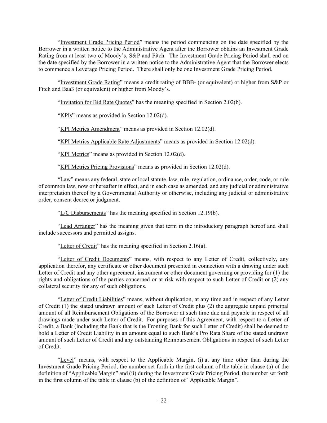 - 22 - “Investment Grade Pricing Period” means the period commencing on the date specified by the Borrower in a written notice to the Administrative Agent after the Borrower obtains an Investment Grade Rating from at least two of Moody’s, S&P and Fitch. The Investment Grade Pricing Period shall end on the date specified by the Borrower in a written notice to the Administrative Agent that the Borrower elects to commence a Leverage Pricing Period. There shall only be one Investment Grade Pricing Period. “Investment Grade Rating” means a credit rating of BBB- (or equivalent) or higher from S&P or Fitch and Baa3 (or equivalent) or higher from Moody’s. “Invitation for Bid Rate Quotes” has the meaning specified in Section 2.02(b). “KPIs” means as provided in Section 12.02(d). “KPI Metrics Amendment” means as provided in Section 12.02(d). “KPI Metrics Applicable Rate Adjustments” means as provided in Section 12.02(d). “KPI Metrics” means as provided in Section 12.02(d). “KPI Metrics Pricing Provisions” means as provided in Section 12.02(d). “Law” means any federal, state or local statute, law, rule, regulation, ordinance, order, code, or rule of common law, now or hereafter in effect, and in each case as amended, and any judicial or administrative interpretation thereof by a Governmental Authority or otherwise, including any judicial or administrative order, consent decree or judgment. “L/C Disbursements” has the meaning specified in Section 12.19(b). “Lead Arranger” has the meaning given that term in the introductory paragraph hereof and shall include successors and permitted assigns. “Letter of Credit” has the meaning specified in Section 2.16(a). “Letter of Credit Documents” means, with respect to any Letter of Credit, collectively, any application therefor, any certificate or other document presented in connection with a drawing under such Letter of Credit and any other agreement, instrument or other document governing or providing for (1) the rights and obligations of the parties concerned or at risk with respect to such Letter of Credit or (2) any collateral security for any of such obligations. “Letter of Credit Liabilities” means, without duplication, at any time and in respect of any Letter of Credit (1) the stated undrawn amount of such Letter of Credit plus (2) the aggregate unpaid principal amount of all Reimbursement Obligations of the Borrower at such time due and payable in respect of all drawings made under such Letter of Credit. For purposes of this Agreement, with respect to a Letter of Credit, a Bank (including the Bank that is the Fronting Bank for such Letter of Credit) shall be deemed to hold a Letter of Credit Liability in an amount equal to such Bank’s Pro Rata Share of the stated undrawn amount of such Letter of Credit and any outstanding Reimbursement Obligations in respect of such Letter of Credit. “Level” means, with respect to the Applicable Margin, (i) at any time other than during the Investment Grade Pricing Period, the number set forth in the first column of the table in clause (a) of the definition of “Applicable Margin” and (ii) during the Investment Grade Pricing Period, the number set forth in the first column of the table in clause (b) of the definition of “Applicable Margin”.