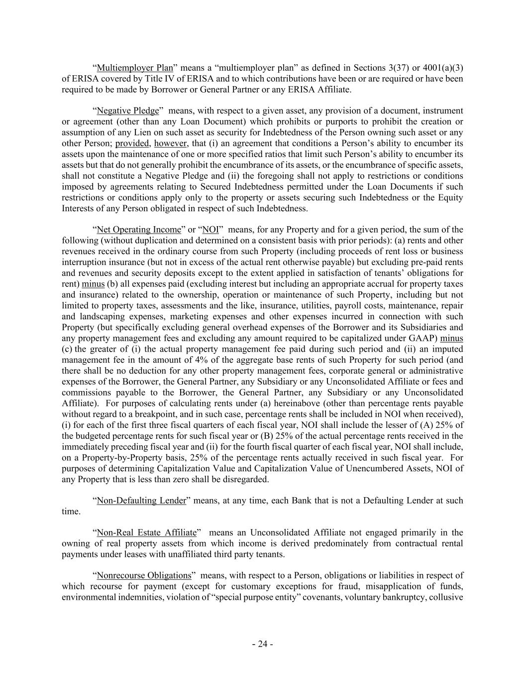 - 24 - “Multiemployer Plan” means a “multiemployer plan” as defined in Sections 3(37) or 4001(a)(3) of ERISA covered by Title IV of ERISA and to which contributions have been or are required or have been required to be made by Borrower or General Partner or any ERISA Affiliate. “Negative Pledge” means, with respect to a given asset, any provision of a document, instrument or agreement (other than any Loan Document) which prohibits or purports to prohibit the creation or assumption of any Lien on such asset as security for Indebtedness of the Person owning such asset or any other Person; provided, however, that (i) an agreement that conditions a Person’s ability to encumber its assets upon the maintenance of one or more specified ratios that limit such Person’s ability to encumber its assets but that do not generally prohibit the encumbrance of its assets, or the encumbrance of specific assets, shall not constitute a Negative Pledge and (ii) the foregoing shall not apply to restrictions or conditions imposed by agreements relating to Secured Indebtedness permitted under the Loan Documents if such restrictions or conditions apply only to the property or assets securing such Indebtedness or the Equity Interests of any Person obligated in respect of such Indebtedness. “Net Operating Income” or “NOI” means, for any Property and for a given period, the sum of the following (without duplication and determined on a consistent basis with prior periods): (a) rents and other revenues received in the ordinary course from such Property (including proceeds of rent loss or business interruption insurance (but not in excess of the actual rent otherwise payable) but excluding pre-paid rents and revenues and security deposits except to the extent applied in satisfaction of tenants’ obligations for rent) minus (b) all expenses paid (excluding interest but including an appropriate accrual for property taxes and insurance) related to the ownership, operation or maintenance of such Property, including but not limited to property taxes, assessments and the like, insurance, utilities, payroll costs, maintenance, repair and landscaping expenses, marketing expenses and other expenses incurred in connection with such Property (but specifically excluding general overhead expenses of the Borrower and its Subsidiaries and any property management fees and excluding any amount required to be capitalized under GAAP) minus (c) the greater of (i) the actual property management fee paid during such period and (ii) an imputed management fee in the amount of 4% of the aggregate base rents of such Property for such period (and there shall be no deduction for any other property management fees, corporate general or administrative expenses of the Borrower, the General Partner, any Subsidiary or any Unconsolidated Affiliate or fees and commissions payable to the Borrower, the General Partner, any Subsidiary or any Unconsolidated Affiliate). For purposes of calculating rents under (a) hereinabove (other than percentage rents payable without regard to a breakpoint, and in such case, percentage rents shall be included in NOI when received), (i) for each of the first three fiscal quarters of each fiscal year, NOI shall include the lesser of (A) 25% of the budgeted percentage rents for such fiscal year or (B) 25% of the actual percentage rents received in the immediately preceding fiscal year and (ii) for the fourth fiscal quarter of each fiscal year, NOI shall include, on a Property-by-Property basis, 25% of the percentage rents actually received in such fiscal year. For purposes of determining Capitalization Value and Capitalization Value of Unencumbered Assets, NOI of any Property that is less than zero shall be disregarded. “Non-Defaulting Lender” means, at any time, each Bank that is not a Defaulting Lender at such time. “Non-Real Estate Affiliate” means an Unconsolidated Affiliate not engaged primarily in the owning of real property assets from which income is derived predominately from contractual rental payments under leases with unaffiliated third party tenants. “Nonrecourse Obligations” means, with respect to a Person, obligations or liabilities in respect of which recourse for payment (except for customary exceptions for fraud, misapplication of funds, environmental indemnities, violation of “special purpose entity” covenants, voluntary bankruptcy, collusive
