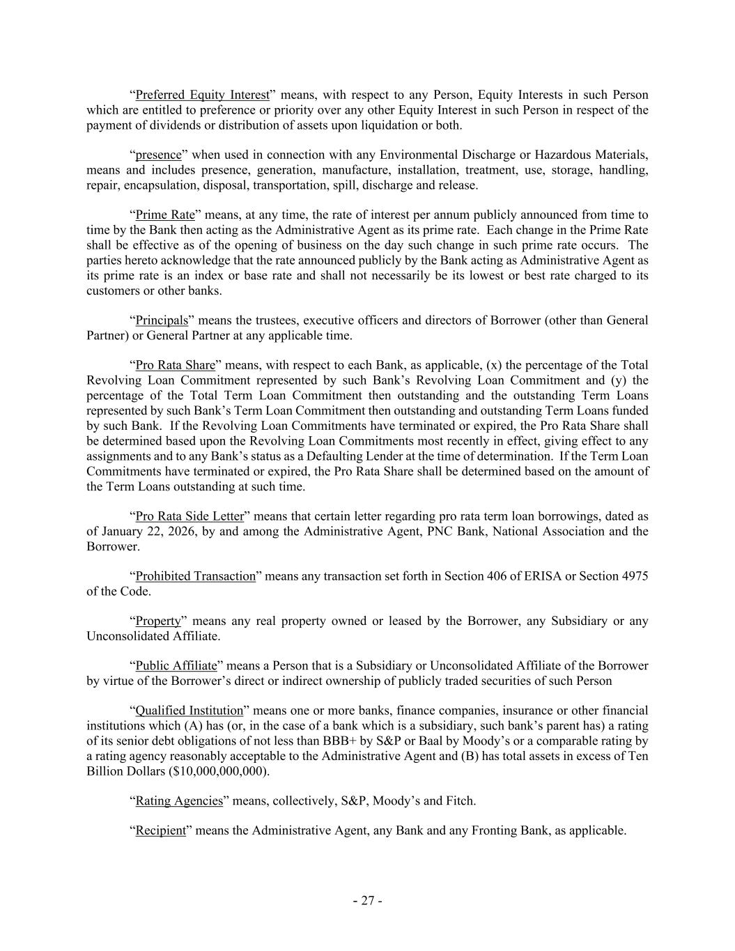 - 27 - “Preferred Equity Interest” means, with respect to any Person, Equity Interests in such Person which are entitled to preference or priority over any other Equity Interest in such Person in respect of the payment of dividends or distribution of assets upon liquidation or both. “presence” when used in connection with any Environmental Discharge or Hazardous Materials, means and includes presence, generation, manufacture, installation, treatment, use, storage, handling, repair, encapsulation, disposal, transportation, spill, discharge and release. “Prime Rate” means, at any time, the rate of interest per annum publicly announced from time to time by the Bank then acting as the Administrative Agent as its prime rate. Each change in the Prime Rate shall be effective as of the opening of business on the day such change in such prime rate occurs. The parties hereto acknowledge that the rate announced publicly by the Bank acting as Administrative Agent as its prime rate is an index or base rate and shall not necessarily be its lowest or best rate charged to its customers or other banks. “Principals” means the trustees, executive officers and directors of Borrower (other than General Partner) or General Partner at any applicable time. “Pro Rata Share” means, with respect to each Bank, as applicable, (x) the percentage of the Total Revolving Loan Commitment represented by such Bank’s Revolving Loan Commitment and (y) the percentage of the Total Term Loan Commitment then outstanding and the outstanding Term Loans represented by such Bank’s Term Loan Commitment then outstanding and outstanding Term Loans funded by such Bank. If the Revolving Loan Commitments have terminated or expired, the Pro Rata Share shall be determined based upon the Revolving Loan Commitments most recently in effect, giving effect to any assignments and to any Bank’s status as a Defaulting Lender at the time of determination. If the Term Loan Commitments have terminated or expired, the Pro Rata Share shall be determined based on the amount of the Term Loans outstanding at such time. “Pro Rata Side Letter” means that certain letter regarding pro rata term loan borrowings, dated as of January 22, 2026, by and among the Administrative Agent, PNC Bank, National Association and the Borrower. “Prohibited Transaction” means any transaction set forth in Section 406 of ERISA or Section 4975 of the Code. “Property” means any real property owned or leased by the Borrower, any Subsidiary or any Unconsolidated Affiliate. “Public Affiliate” means a Person that is a Subsidiary or Unconsolidated Affiliate of the Borrower by virtue of the Borrower’s direct or indirect ownership of publicly traded securities of such Person “Qualified Institution” means one or more banks, finance companies, insurance or other financial institutions which (A) has (or, in the case of a bank which is a subsidiary, such bank’s parent has) a rating of its senior debt obligations of not less than BBB+ by S&P or Baal by Moody’s or a comparable rating by a rating agency reasonably acceptable to the Administrative Agent and (B) has total assets in excess of Ten Billion Dollars ($10,000,000,000). “Rating Agencies” means, collectively, S&P, Moody’s and Fitch. “Recipient” means the Administrative Agent, any Bank and any Fronting Bank, as applicable.