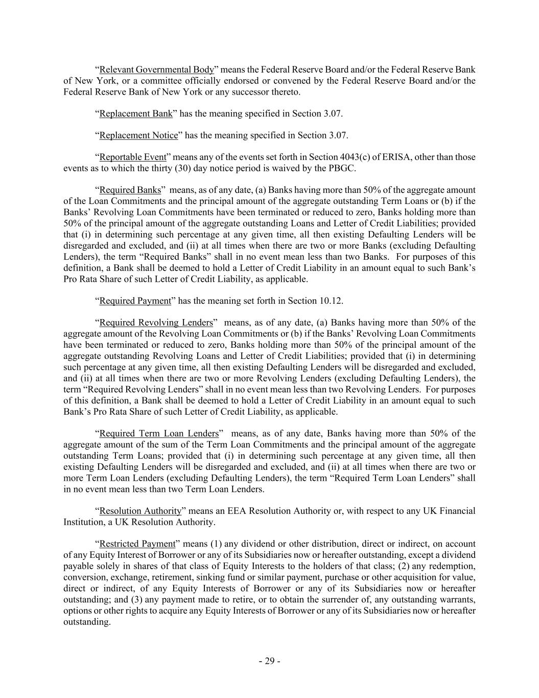 - 29 - “Relevant Governmental Body” means the Federal Reserve Board and/or the Federal Reserve Bank of New York, or a committee officially endorsed or convened by the Federal Reserve Board and/or the Federal Reserve Bank of New York or any successor thereto. “Replacement Bank” has the meaning specified in Section 3.07. “Replacement Notice” has the meaning specified in Section 3.07. “Reportable Event” means any of the events set forth in Section 4043(c) of ERISA, other than those events as to which the thirty (30) day notice period is waived by the PBGC. “Required Banks” means, as of any date, (a) Banks having more than 50% of the aggregate amount of the Loan Commitments and the principal amount of the aggregate outstanding Term Loans or (b) if the Banks’ Revolving Loan Commitments have been terminated or reduced to zero, Banks holding more than 50% of the principal amount of the aggregate outstanding Loans and Letter of Credit Liabilities; provided that (i) in determining such percentage at any given time, all then existing Defaulting Lenders will be disregarded and excluded, and (ii) at all times when there are two or more Banks (excluding Defaulting Lenders), the term “Required Banks” shall in no event mean less than two Banks. For purposes of this definition, a Bank shall be deemed to hold a Letter of Credit Liability in an amount equal to such Bank’s Pro Rata Share of such Letter of Credit Liability, as applicable. “Required Payment” has the meaning set forth in Section 10.12. “Required Revolving Lenders” means, as of any date, (a) Banks having more than 50% of the aggregate amount of the Revolving Loan Commitments or (b) if the Banks’ Revolving Loan Commitments have been terminated or reduced to zero, Banks holding more than 50% of the principal amount of the aggregate outstanding Revolving Loans and Letter of Credit Liabilities; provided that (i) in determining such percentage at any given time, all then existing Defaulting Lenders will be disregarded and excluded, and (ii) at all times when there are two or more Revolving Lenders (excluding Defaulting Lenders), the term “Required Revolving Lenders” shall in no event mean less than two Revolving Lenders. For purposes of this definition, a Bank shall be deemed to hold a Letter of Credit Liability in an amount equal to such Bank’s Pro Rata Share of such Letter of Credit Liability, as applicable. “Required Term Loan Lenders” means, as of any date, Banks having more than 50% of the aggregate amount of the sum of the Term Loan Commitments and the principal amount of the aggregate outstanding Term Loans; provided that (i) in determining such percentage at any given time, all then existing Defaulting Lenders will be disregarded and excluded, and (ii) at all times when there are two or more Term Loan Lenders (excluding Defaulting Lenders), the term “Required Term Loan Lenders” shall in no event mean less than two Term Loan Lenders. “Resolution Authority” means an EEA Resolution Authority or, with respect to any UK Financial Institution, a UK Resolution Authority. “Restricted Payment” means (1) any dividend or other distribution, direct or indirect, on account of any Equity Interest of Borrower or any of its Subsidiaries now or hereafter outstanding, except a dividend payable solely in shares of that class of Equity Interests to the holders of that class; (2) any redemption, conversion, exchange, retirement, sinking fund or similar payment, purchase or other acquisition for value, direct or indirect, of any Equity Interests of Borrower or any of its Subsidiaries now or hereafter outstanding; and (3) any payment made to retire, or to obtain the surrender of, any outstanding warrants, options or other rights to acquire any Equity Interests of Borrower or any of its Subsidiaries now or hereafter outstanding.