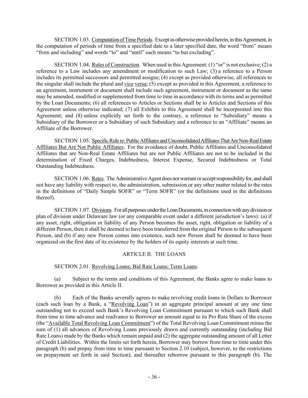 - 36 - SECTION 1.03. Computation of Time Periods. Except as otherwise provided herein, in this Agreement, in the computation of periods of time from a specified date to a later specified date, the word “from” means “from and including” and words “to” and “until” each means “to but excluding”. SECTION 1.04. Rules of Construction. When used in this Agreement: (1) “or” is not exclusive; (2) a reference to a Law includes any amendment or modification to such Law; (3) a reference to a Person includes its permitted successors and permitted assigns; (4) except as provided otherwise, all references to the singular shall include the plural and vice versa; (5) except as provided in this Agreement, a reference to an agreement, instrument or document shall include such agreement, instrument or document as the same may be amended, modified or supplemented from time to time in accordance with its terms and as permitted by the Loan Documents; (6) all references to Articles or Sections shall be to Articles and Sections of this Agreement unless otherwise indicated; (7) all Exhibits to this Agreement shall be incorporated into this Agreement; and (8) unless explicitly set forth to the contrary, a reference to “Subsidiary” means a Subsidiary of the Borrower or a Subsidiary of such Subsidiary and a reference to an “Affiliate” means an Affiliate of the Borrower. SECTION 1.05. Specific Rule re: Public Affiliates and Unconsolidated Affiliates That Are Non-Real Estate Affiliates But Are Not Public Affiliates. For the avoidance of doubt, Public Affiliates and Unconsolidated Affiliates that are Non-Real Estate Affiliates but are not Public Affiliates are not to be included in the determination of Fixed Charges, Indebtedness, Interest Expense, Secured Indebtedness or Total Outstanding Indebtedness. SECTION 1.06. Rates. The Administrative Agent does not warrant or accept responsibility for, and shall not have any liability with respect to, the administration, submission or any other matter related to the rates in the definitions of “Daily Simple SOFR” or “Term SOFR” (or the definitions used in the definitions thereof). SECTION 1.07. Divisions. For all purposes under the Loan Documents, in connection with any division or plan of division under Delaware law (or any comparable event under a different jurisdiction’s laws): (a) if any asset, right, obligation or liability of any Person becomes the asset, right, obligation or liability of a different Person, then it shall be deemed to have been transferred from the original Person to the subsequent Person, and (b) if any new Person comes into existence, such new Person shall be deemed to have been organized on the first date of its existence by the holders of its equity interests at such time. ARTICLE II. THE LOANS SECTION 2.01. Revolving Loans; Bid Rate Loans; Term Loans. (a) Subject to the terms and conditions of this Agreement, the Banks agree to make loans to Borrower as provided in this Article II. (b) Each of the Banks severally agrees to make revolving credit loans in Dollars to Borrower (each such loan by a Bank, a “Revolving Loan”) in an aggregate principal amount at any one time outstanding not to exceed such Bank’s Revolving Loan Commitment pursuant to which such Bank shall from time to time advance and readvance to Borrower an amount equal to its Pro Rata Share of the excess (the “Available Total Revolving Loan Commitment”) of the Total Revolving Loan Commitment minus the sum of (1) all advances of Revolving Loans previously drawn and currently outstanding (including Bid Rate Loans) made by the Banks which remain unpaid and (2) the aggregate outstanding amount of all Letter of Credit Liabilities. Within the limits set forth herein, Borrower may borrow from time to time under this paragraph (b) and prepay from time to time pursuant to Section 2.10 (subject, however, to the restrictions on prepayment set forth in said Section), and thereafter reborrow pursuant to this paragraph (b). The
