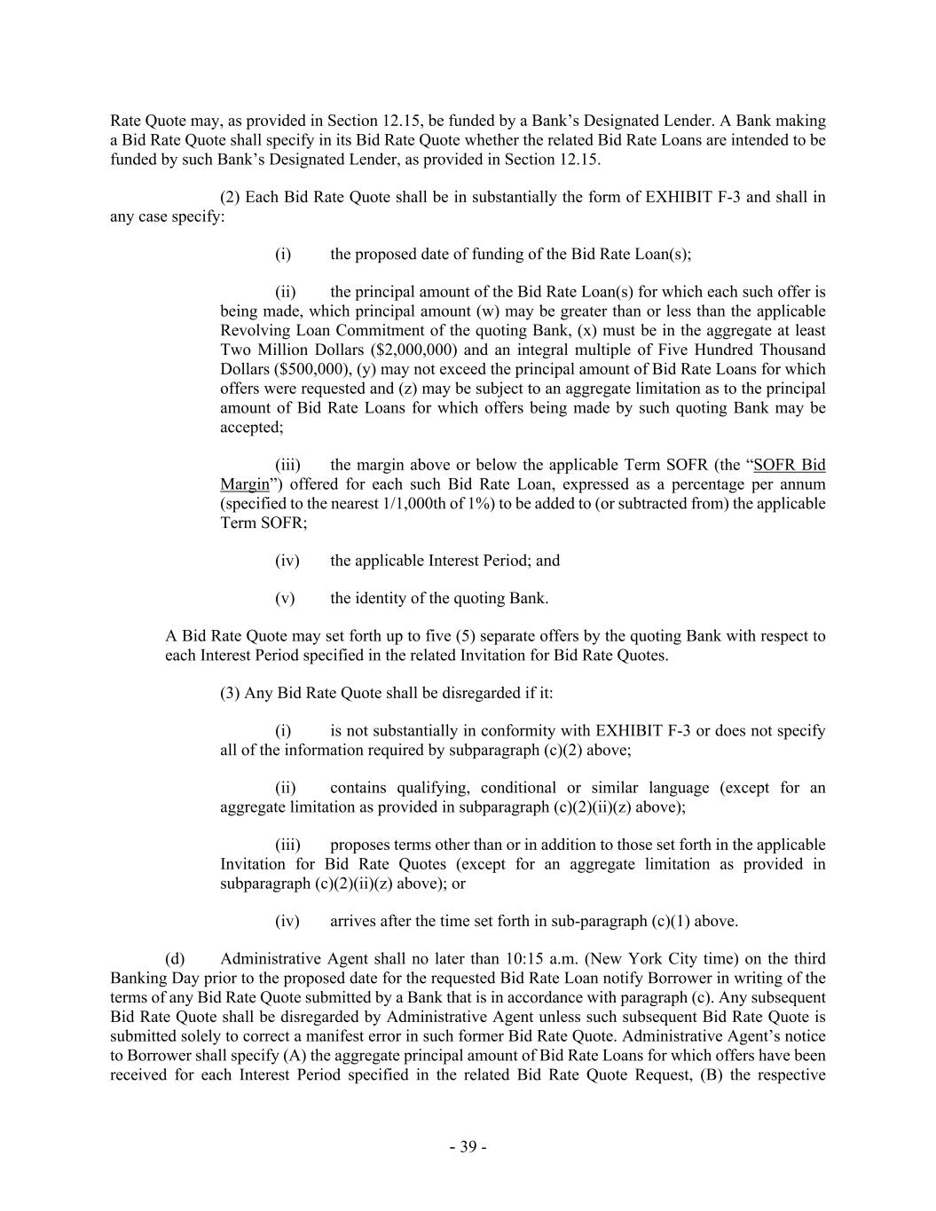 - 39 - Rate Quote may, as provided in Section 12.15, be funded by a Bank’s Designated Lender. A Bank making a Bid Rate Quote shall specify in its Bid Rate Quote whether the related Bid Rate Loans are intended to be funded by such Bank’s Designated Lender, as provided in Section 12.15. (2) Each Bid Rate Quote shall be in substantially the form of EXHIBIT F-3 and shall in any case specify: (i) the proposed date of funding of the Bid Rate Loan(s); (ii) the principal amount of the Bid Rate Loan(s) for which each such offer is being made, which principal amount (w) may be greater than or less than the applicable Revolving Loan Commitment of the quoting Bank, (x) must be in the aggregate at least Two Million Dollars ($2,000,000) and an integral multiple of Five Hundred Thousand Dollars ($500,000), (y) may not exceed the principal amount of Bid Rate Loans for which offers were requested and (z) may be subject to an aggregate limitation as to the principal amount of Bid Rate Loans for which offers being made by such quoting Bank may be accepted; (iii) the margin above or below the applicable Term SOFR (the “SOFR Bid Margin”) offered for each such Bid Rate Loan, expressed as a percentage per annum (specified to the nearest 1/1,000th of 1%) to be added to (or subtracted from) the applicable Term SOFR; (iv) the applicable Interest Period; and (v) the identity of the quoting Bank. A Bid Rate Quote may set forth up to five (5) separate offers by the quoting Bank with respect to each Interest Period specified in the related Invitation for Bid Rate Quotes. (3) Any Bid Rate Quote shall be disregarded if it: (i) is not substantially in conformity with EXHIBIT F-3 or does not specify all of the information required by subparagraph (c)(2) above; (ii) contains qualifying, conditional or similar language (except for an aggregate limitation as provided in subparagraph (c)(2)(ii)(z) above); (iii) proposes terms other than or in addition to those set forth in the applicable Invitation for Bid Rate Quotes (except for an aggregate limitation as provided in subparagraph (c)(2)(ii)(z) above); or (iv) arrives after the time set forth in sub-paragraph (c)(1) above. (d) Administrative Agent shall no later than 10:15 a.m. (New York City time) on the third Banking Day prior to the proposed date for the requested Bid Rate Loan notify Borrower in writing of the terms of any Bid Rate Quote submitted by a Bank that is in accordance with paragraph (c). Any subsequent Bid Rate Quote shall be disregarded by Administrative Agent unless such subsequent Bid Rate Quote is submitted solely to correct a manifest error in such former Bid Rate Quote. Administrative Agent’s notice to Borrower shall specify (A) the aggregate principal amount of Bid Rate Loans for which offers have been received for each Interest Period specified in the related Bid Rate Quote Request, (B) the respective