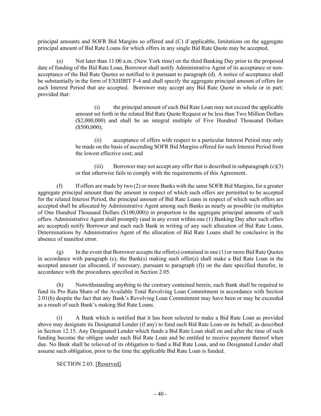 - 40 - principal amounts and SOFR Bid Margins so offered and (C) if applicable, limitations on the aggregate principal amount of Bid Rate Loans for which offers in any single Bid Rate Quote may be accepted. (e) Not later than 11:00 a.m. (New York time) on the third Banking Day prior to the proposed date of funding of the Bid Rate Loan, Borrower shall notify Administrative Agent of its acceptance or non- acceptance of the Bid Rate Quotes so notified to it pursuant to paragraph (d). A notice of acceptance shall be substantially in the form of EXHIBIT F-4 and shall specify the aggregate principal amount of offers for each Interest Period that are accepted. Borrower may accept any Bid Rate Quote in whole or in part; provided that: (i) the principal amount of each Bid Rate Loan may not exceed the applicable amount set forth in the related Bid Rate Quote Request or be less than Two Million Dollars ($2,000,000) and shall be an integral multiple of Five Hundred Thousand Dollars ($500,000); (ii) acceptance of offers with respect to a particular Interest Period may only be made on the basis of ascending SOFR Bid Margins offered for such Interest Period from the lowest effective cost; and (iii) Borrower may not accept any offer that is described in subparagraph (c)(3) or that otherwise fails to comply with the requirements of this Agreement. (f) If offers are made by two (2) or more Banks with the same SOFR Bid Margins, for a greater aggregate principal amount than the amount in respect of which such offers are permitted to be accepted for the related Interest Period, the principal amount of Bid Rate Loans in respect of which such offers are accepted shall be allocated by Administrative Agent among such Banks as nearly as possible (in multiples of One Hundred Thousand Dollars ($100,000)) in proportion to the aggregate principal amounts of such offers. Administrative Agent shall promptly (and in any event within one (1) Banking Day after such offers are accepted) notify Borrower and each such Bank in writing of any such allocation of Bid Rate Loans. Determinations by Administrative Agent of the allocation of Bid Rate Loans shall be conclusive in the absence of manifest error. (g) In the event that Borrower accepts the offer(s) contained in one (1) or more Bid Rate Quotes in accordance with paragraph (e), the Bank(s) making such offer(s) shall make a Bid Rate Loan in the accepted amount (as allocated, if necessary, pursuant to paragraph (f)) on the date specified therefor, in accordance with the procedures specified in Section 2.05. (h) Notwithstanding anything to the contrary contained herein, each Bank shall be required to fund its Pro Rata Share of the Available Total Revolving Loan Commitment in accordance with Section 2.01(b) despite the fact that any Bank’s Revolving Loan Commitment may have been or may be exceeded as a result of such Bank’s making Bid Rate Loans. (i) A Bank which is notified that it has been selected to make a Bid Rate Loan as provided above may designate its Designated Lender (if any) to fund such Bid Rate Loan on its behalf, as described in Section 12.15. Any Designated Lender which funds a Bid Rate Loan shall on and after the time of such funding become the obligee under such Bid Rate Loan and be entitled to receive payment thereof when due. No Bank shall be relieved of its obligation to fund a Bid Rate Loan, and no Designated Lender shall assume such obligation, prior to the time the applicable Bid Rate Loan is funded. SECTION 2.03. [Reserved].
