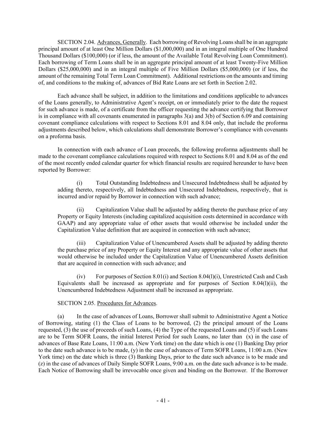 - 41 - SECTION 2.04. Advances, Generally. Each borrowing of Revolving Loans shall be in an aggregate principal amount of at least One Million Dollars ($1,000,000) and in an integral multiple of One Hundred Thousand Dollars ($100,000) (or if less, the amount of the Available Total Revolving Loan Commitment). Each borrowing of Term Loans shall be in an aggregate principal amount of at least Twenty-Five Million Dollars ($25,000,000) and in an integral multiple of Five Million Dollars ($5,000,000) (or if less, the amount of the remaining Total Term Loan Commitment). Additional restrictions on the amounts and timing of, and conditions to the making of, advances of Bid Rate Loans are set forth in Section 2.02. Each advance shall be subject, in addition to the limitations and conditions applicable to advances of the Loans generally, to Administrative Agent’s receipt, on or immediately prior to the date the request for such advance is made, of a certificate from the officer requesting the advance certifying that Borrower is in compliance with all covenants enumerated in paragraphs 3(a) and 3(b) of Section 6.09 and containing covenant compliance calculations with respect to Sections 8.01 and 8.04 only, that include the proforma adjustments described below, which calculations shall demonstrate Borrower’s compliance with covenants on a proforma basis. In connection with each advance of Loan proceeds, the following proforma adjustments shall be made to the covenant compliance calculations required with respect to Sections 8.01 and 8.04 as of the end of the most recently ended calendar quarter for which financial results are required hereunder to have been reported by Borrower: (i) Total Outstanding Indebtedness and Unsecured Indebtedness shall be adjusted by adding thereto, respectively, all Indebtedness and Unsecured Indebtedness, respectively, that is incurred and/or repaid by Borrower in connection with such advance; (ii) Capitalization Value shall be adjusted by adding thereto the purchase price of any Property or Equity Interests (including capitalized acquisition costs determined in accordance with GAAP) and any appropriate value of other assets that would otherwise be included under the Capitalization Value definition that are acquired in connection with such advance; (iii) Capitalization Value of Unencumbered Assets shall be adjusted by adding thereto the purchase price of any Property or Equity Interest and any appropriate value of other assets that would otherwise be included under the Capitalization Value of Unencumbered Assets definition that are acquired in connection with such advance; and (iv) For purposes of Section 8.01(i) and Section 8.04(l)(i), Unrestricted Cash and Cash Equivalents shall be increased as appropriate and for purposes of Section 8.04(l)(ii), the Unencumbered Indebtedness Adjustment shall be increased as appropriate. SECTION 2.05. Procedures for Advances. (a) In the case of advances of Loans, Borrower shall submit to Administrative Agent a Notice of Borrowing, stating (1) the Class of Loans to be borrowed, (2) the principal amount of the Loans requested, (3) the use of proceeds of such Loans, (4) the Type of the requested Loans and (5) if such Loans are to be Term SOFR Loans, the initial Interest Period for such Loans, no later than (x) in the case of advances of Base Rate Loans, 11:00 a.m. (New York time) on the date which is one (1) Banking Day prior to the date such advance is to be made, (y) in the case of advances of Term SOFR Loans, 11:00 a.m. (New York time) on the date which is three (3) Banking Days, prior to the date such advance is to be made and (z) in the case of advances of Daily Simple SOFR Loans, 9:00 a.m. on the date such advance is to be made. Each Notice of Borrowing shall be irrevocable once given and binding on the Borrower. If the Borrower
