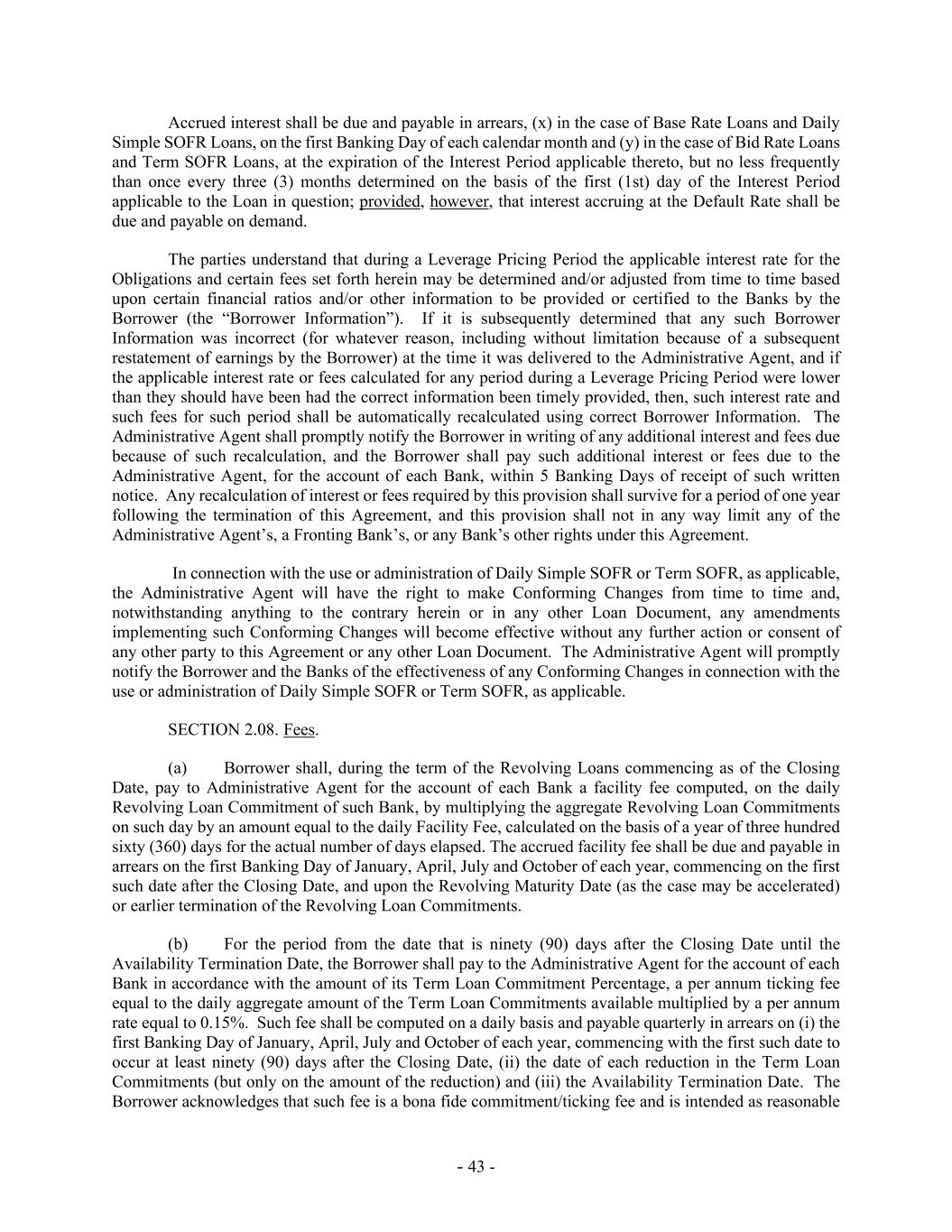 - 43 - Accrued interest shall be due and payable in arrears, (x) in the case of Base Rate Loans and Daily Simple SOFR Loans, on the first Banking Day of each calendar month and (y) in the case of Bid Rate Loans and Term SOFR Loans, at the expiration of the Interest Period applicable thereto, but no less frequently than once every three (3) months determined on the basis of the first (1st) day of the Interest Period applicable to the Loan in question; provided, however, that interest accruing at the Default Rate shall be due and payable on demand. The parties understand that during a Leverage Pricing Period the applicable interest rate for the Obligations and certain fees set forth herein may be determined and/or adjusted from time to time based upon certain financial ratios and/or other information to be provided or certified to the Banks by the Borrower (the “Borrower Information”). If it is subsequently determined that any such Borrower Information was incorrect (for whatever reason, including without limitation because of a subsequent restatement of earnings by the Borrower) at the time it was delivered to the Administrative Agent, and if the applicable interest rate or fees calculated for any period during a Leverage Pricing Period were lower than they should have been had the correct information been timely provided, then, such interest rate and such fees for such period shall be automatically recalculated using correct Borrower Information. The Administrative Agent shall promptly notify the Borrower in writing of any additional interest and fees due because of such recalculation, and the Borrower shall pay such additional interest or fees due to the Administrative Agent, for the account of each Bank, within 5 Banking Days of receipt of such written notice. Any recalculation of interest or fees required by this provision shall survive for a period of one year following the termination of this Agreement, and this provision shall not in any way limit any of the Administrative Agent’s, a Fronting Bank’s, or any Bank’s other rights under this Agreement. In connection with the use or administration of Daily Simple SOFR or Term SOFR, as applicable, the Administrative Agent will have the right to make Conforming Changes from time to time and, notwithstanding anything to the contrary herein or in any other Loan Document, any amendments implementing such Conforming Changes will become effective without any further action or consent of any other party to this Agreement or any other Loan Document. The Administrative Agent will promptly notify the Borrower and the Banks of the effectiveness of any Conforming Changes in connection with the use or administration of Daily Simple SOFR or Term SOFR, as applicable. SECTION 2.08. Fees. (a) Borrower shall, during the term of the Revolving Loans commencing as of the Closing Date, pay to Administrative Agent for the account of each Bank a facility fee computed, on the daily Revolving Loan Commitment of such Bank, by multiplying the aggregate Revolving Loan Commitments on such day by an amount equal to the daily Facility Fee, calculated on the basis of a year of three hundred sixty (360) days for the actual number of days elapsed. The accrued facility fee shall be due and payable in arrears on the first Banking Day of January, April, July and October of each year, commencing on the first such date after the Closing Date, and upon the Revolving Maturity Date (as the case may be accelerated) or earlier termination of the Revolving Loan Commitments. (b) For the period from the date that is ninety (90) days after the Closing Date until the Availability Termination Date, the Borrower shall pay to the Administrative Agent for the account of each Bank in accordance with the amount of its Term Loan Commitment Percentage, a per annum ticking fee equal to the daily aggregate amount of the Term Loan Commitments available multiplied by a per annum rate equal to 0.15%. Such fee shall be computed on a daily basis and payable quarterly in arrears on (i) the first Banking Day of January, April, July and October of each year, commencing with the first such date to occur at least ninety (90) days after the Closing Date, (ii) the date of each reduction in the Term Loan Commitments (but only on the amount of the reduction) and (iii) the Availability Termination Date. The Borrower acknowledges that such fee is a bona fide commitment/ticking fee and is intended as reasonable
