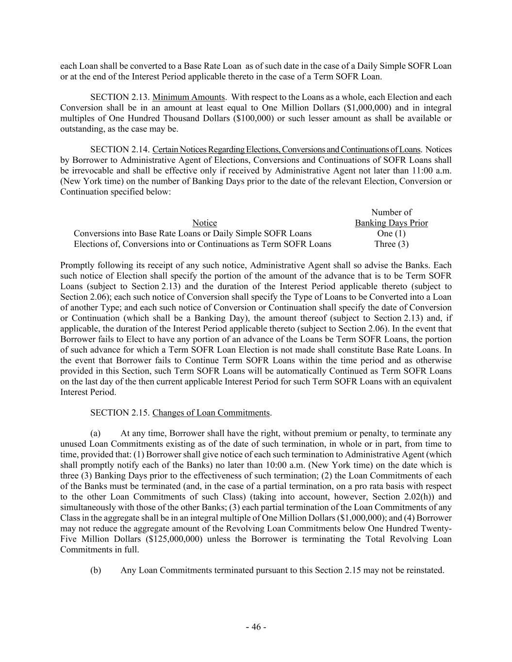 - 46 - each Loan shall be converted to a Base Rate Loan as of such date in the case of a Daily Simple SOFR Loan or at the end of the Interest Period applicable thereto in the case of a Term SOFR Loan. SECTION 2.13. Minimum Amounts. With respect to the Loans as a whole, each Election and each Conversion shall be in an amount at least equal to One Million Dollars ($1,000,000) and in integral multiples of One Hundred Thousand Dollars ($100,000) or such lesser amount as shall be available or outstanding, as the case may be. SECTION 2.14. Certain Notices Regarding Elections, Conversions and Continuations of Loans. Notices by Borrower to Administrative Agent of Elections, Conversions and Continuations of SOFR Loans shall be irrevocable and shall be effective only if received by Administrative Agent not later than 11:00 a.m. (New York time) on the number of Banking Days prior to the date of the relevant Election, Conversion or Continuation specified below: Notice Number of Banking Days Prior Conversions into Base Rate Loans or Daily Simple SOFR Loans One (1) Elections of, Conversions into or Continuations as Term SOFR Loans Three (3) Promptly following its receipt of any such notice, Administrative Agent shall so advise the Banks. Each such notice of Election shall specify the portion of the amount of the advance that is to be Term SOFR Loans (subject to Section 2.13) and the duration of the Interest Period applicable thereto (subject to Section 2.06); each such notice of Conversion shall specify the Type of Loans to be Converted into a Loan of another Type; and each such notice of Conversion or Continuation shall specify the date of Conversion or Continuation (which shall be a Banking Day), the amount thereof (subject to Section 2.13) and, if applicable, the duration of the Interest Period applicable thereto (subject to Section 2.06). In the event that Borrower fails to Elect to have any portion of an advance of the Loans be Term SOFR Loans, the portion of such advance for which a Term SOFR Loan Election is not made shall constitute Base Rate Loans. In the event that Borrower fails to Continue Term SOFR Loans within the time period and as otherwise provided in this Section, such Term SOFR Loans will be automatically Continued as Term SOFR Loans on the last day of the then current applicable Interest Period for such Term SOFR Loans with an equivalent Interest Period. SECTION 2.15. Changes of Loan Commitments. (a) At any time, Borrower shall have the right, without premium or penalty, to terminate any unused Loan Commitments existing as of the date of such termination, in whole or in part, from time to time, provided that: (1) Borrower shall give notice of each such termination to Administrative Agent (which shall promptly notify each of the Banks) no later than 10:00 a.m. (New York time) on the date which is three (3) Banking Days prior to the effectiveness of such termination; (2) the Loan Commitments of each of the Banks must be terminated (and, in the case of a partial termination, on a pro rata basis with respect to the other Loan Commitments of such Class) (taking into account, however, Section 2.02(h)) and simultaneously with those of the other Banks; (3) each partial termination of the Loan Commitments of any Class in the aggregate shall be in an integral multiple of One Million Dollars ($1,000,000); and (4) Borrower may not reduce the aggregate amount of the Revolving Loan Commitments below One Hundred Twenty- Five Million Dollars ($125,000,000) unless the Borrower is terminating the Total Revolving Loan Commitments in full. (b) Any Loan Commitments terminated pursuant to this Section 2.15 may not be reinstated.