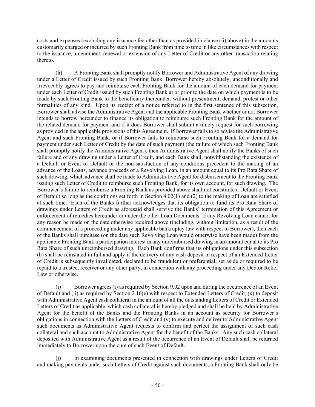- 50 - costs and expenses (excluding any issuance fee other than as provided in clause (ii) above) in the amounts customarily charged or incurred by such Fronting Bank from time to time in like circumstances with respect to the issuance, amendment, renewal or extension of any Letter of Credit or any other transaction relating thereto. (h) A Fronting Bank shall promptly notify Borrower and Administrative Agent of any drawing under a Letter of Credit issued by such Fronting Bank. Borrower hereby absolutely, unconditionally and irrevocably agrees to pay and reimburse each Fronting Bank for the amount of each demand for payment under each Letter of Credit issued by such Fronting Bank at or prior to the date on which payment is to be made by such Fronting Bank to the beneficiary thereunder, without presentment, demand, protest or other formalities of any kind. Upon its receipt of a notice referred to in the first sentence of this subsection, Borrower shall advise the Administrative Agent and the applicable Fronting Bank whether or not Borrower intends to borrow hereunder to finance its obligation to reimburse such Fronting Bank for the amount of the related demand for payment and if it does Borrower shall submit a timely request for such borrowing as provided in the applicable provisions of this Agreement. If Borrower fails to so advise the Administrative Agent and such Fronting Bank, or if Borrower fails to reimburse such Fronting Bank for a demand for payment under such Letter of Credit by the date of such payment (the failure of which such Fronting Bank shall promptly notify the Administrative Agent), then Administrative Agent shall notify the Banks of such failure and of any drawing under a Letter of Credit, and each Bank shall, notwithstanding the existence of a Default or Event of Default or the non-satisfaction of any conditions precedent to the making of an advance of the Loans, advance proceeds of a Revolving Loan, in an amount equal to its Pro Rata Share of such drawing, which advance shall be made to Administrative Agent for disbursement to the Fronting Bank issuing such Letter of Credit to reimburse such Fronting Bank, for its own account, for such drawing. The Borrower’s failure to reimburse a Fronting Bank as provided above shall not constitute a Default or Event of Default so long as the conditions set forth in Section 4.02(1) and (2) to the making of Loan are satisfied at such time. Each of the Banks further acknowledges that its obligation to fund its Pro Rata Share of drawings under Letters of Credit as aforesaid shall survive the Banks’ termination of this Agreement or enforcement of remedies hereunder or under the other Loan Documents. If any Revolving Loan cannot for any reason be made on the date otherwise required above (including, without limitation, as a result of the commencement of a proceeding under any applicable bankruptcy law with respect to Borrower), then each of the Banks shall purchase (on the date such Revolving Loan would otherwise have been made) from the applicable Fronting Bank a participation interest in any unreimbursed drawing in an amount equal to its Pro Rata Share of such unreimbursed drawing. Each Bank confirms that its obligations under this subsection (h) shall be reinstated in full and apply if the delivery of any cash deposit in respect of an Extended Letter of Credit is subsequently invalidated, declared to be fraudulent or preferential, set aside or required to be repaid to a trustee, receiver or any other party, in connection with any proceeding under any Debtor Relief Law or otherwise. (i) Borrower agrees (i) as required by Section 9.02 upon and during the occurrence of an Event of Default and (ii) as required by Section 2.16(e) with respect to Extended Letters of Credit, (x) to deposit with Administrative Agent cash collateral in the amount of all the outstanding Letters of Credit or Extended Letters of Credit as applicable, which cash collateral is hereby pledged and shall be held by Administrative Agent for the benefit of the Banks and the Fronting Banks in an account as security for Borrower’s obligations in connection with the Letters of Credit and (y) to execute and deliver to Administrative Agent such documents as Administrative Agent requests to confirm and perfect the assignment of such cash collateral and such account to Administrative Agent for the benefit of the Banks. Any such cash collateral deposited with Administrative Agent as a result of the occurrence of an Event of Default shall be returned immediately to Borrower upon the cure of such Event of Default. (j) In examining documents presented in connection with drawings under Letters of Credit and making payments under such Letters of Credit against such documents, a Fronting Bank shall only be