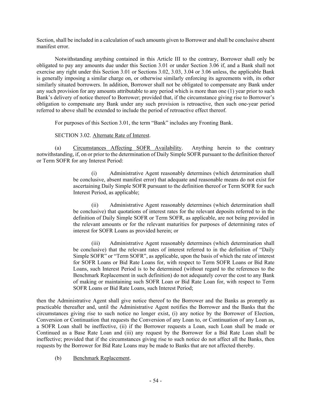 - 54 - Section, shall be included in a calculation of such amounts given to Borrower and shall be conclusive absent manifest error. Notwithstanding anything contained in this Article III to the contrary, Borrower shall only be obligated to pay any amounts due under this Section 3.01 or under Section 3.06 if, and a Bank shall not exercise any right under this Section 3.01 or Sections 3.02, 3.03, 3.04 or 3.06 unless, the applicable Bank is generally imposing a similar charge on, or otherwise similarly enforcing its agreements with, its other similarly situated borrowers. In addition, Borrower shall not be obligated to compensate any Bank under any such provision for any amounts attributable to any period which is more than one (1) year prior to such Bank’s delivery of notice thereof to Borrower; provided that, if the circumstance giving rise to Borrower’s obligation to compensate any Bank under any such provision is retroactive, then such one-year period referred to above shall be extended to include the period of retroactive effect thereof. For purposes of this Section 3.01, the term “Bank” includes any Fronting Bank. SECTION 3.02. Alternate Rate of Interest. (a) Circumstances Affecting SOFR Availability. Anything herein to the contrary notwithstanding, if, on or prior to the determination of Daily Simple SOFR pursuant to the definition thereof or Term SOFR for any Interest Period: (i) Administrative Agent reasonably determines (which determination shall be conclusive, absent manifest error) that adequate and reasonable means do not exist for ascertaining Daily Simple SOFR pursuant to the definition thereof or Term SOFR for such Interest Period, as applicable; (ii) Administrative Agent reasonably determines (which determination shall be conclusive) that quotations of interest rates for the relevant deposits referred to in the definition of Daily Simple SOFR or Term SOFR, as applicable, are not being provided in the relevant amounts or for the relevant maturities for purposes of determining rates of interest for SOFR Loans as provided herein; or (iii) Administrative Agent reasonably determines (which determination shall be conclusive) that the relevant rates of interest referred to in the definition of “Daily Simple SOFR” or “Term SOFR”, as applicable, upon the basis of which the rate of interest for SOFR Loans or Bid Rate Loans for, with respect to Term SOFR Loans or Bid Rate Loans, such Interest Period is to be determined (without regard to the references to the Benchmark Replacement in such definition) do not adequately cover the cost to any Bank of making or maintaining such SOFR Loan or Bid Rate Loan for, with respect to Term SOFR Loans or Bid Rate Loans, such Interest Period; then the Administrative Agent shall give notice thereof to the Borrower and the Banks as promptly as practicable thereafter and, until the Administrative Agent notifies the Borrower and the Banks that the circumstances giving rise to such notice no longer exist, (i) any notice by the Borrower of Election, Conversion or Continuation that requests the Conversion of any Loan to, or Continuation of any Loan as, a SOFR Loan shall be ineffective, (ii) if the Borrower requests a Loan, such Loan shall be made or Continued as a Base Rate Loan and (iii) any request by the Borrower for a Bid Rate Loan shall be ineffective; provided that if the circumstances giving rise to such notice do not affect all the Banks, then requests by the Borrower for Bid Rate Loans may be made to Banks that are not affected thereby. (b) Benchmark Replacement.