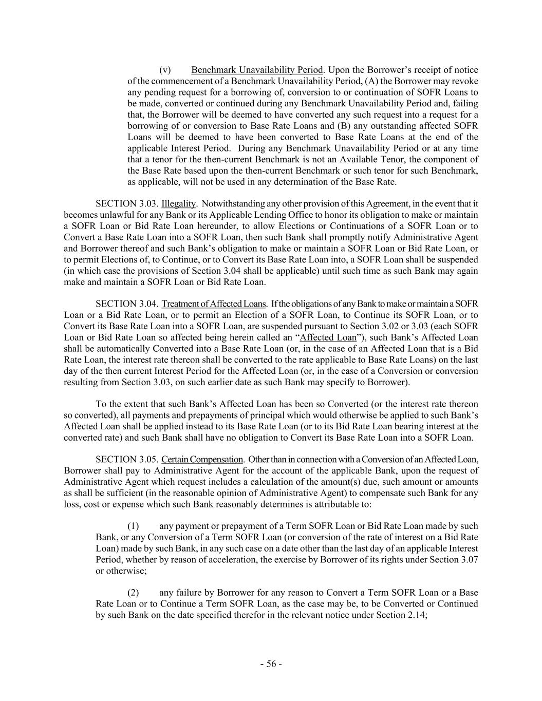 - 56 - (v) Benchmark Unavailability Period. Upon the Borrower’s receipt of notice of the commencement of a Benchmark Unavailability Period, (A) the Borrower may revoke any pending request for a borrowing of, conversion to or continuation of SOFR Loans to be made, converted or continued during any Benchmark Unavailability Period and, failing that, the Borrower will be deemed to have converted any such request into a request for a borrowing of or conversion to Base Rate Loans and (B) any outstanding affected SOFR Loans will be deemed to have been converted to Base Rate Loans at the end of the applicable Interest Period. During any Benchmark Unavailability Period or at any time that a tenor for the then-current Benchmark is not an Available Tenor, the component of the Base Rate based upon the then-current Benchmark or such tenor for such Benchmark, as applicable, will not be used in any determination of the Base Rate. SECTION 3.03. Illegality. Notwithstanding any other provision of this Agreement, in the event that it becomes unlawful for any Bank or its Applicable Lending Office to honor its obligation to make or maintain a SOFR Loan or Bid Rate Loan hereunder, to allow Elections or Continuations of a SOFR Loan or to Convert a Base Rate Loan into a SOFR Loan, then such Bank shall promptly notify Administrative Agent and Borrower thereof and such Bank’s obligation to make or maintain a SOFR Loan or Bid Rate Loan, or to permit Elections of, to Continue, or to Convert its Base Rate Loan into, a SOFR Loan shall be suspended (in which case the provisions of Section 3.04 shall be applicable) until such time as such Bank may again make and maintain a SOFR Loan or Bid Rate Loan. SECTION 3.04. Treatment of Affected Loans. If the obligations of any Bank to make or maintain a SOFR Loan or a Bid Rate Loan, or to permit an Election of a SOFR Loan, to Continue its SOFR Loan, or to Convert its Base Rate Loan into a SOFR Loan, are suspended pursuant to Section 3.02 or 3.03 (each SOFR Loan or Bid Rate Loan so affected being herein called an “Affected Loan”), such Bank’s Affected Loan shall be automatically Converted into a Base Rate Loan (or, in the case of an Affected Loan that is a Bid Rate Loan, the interest rate thereon shall be converted to the rate applicable to Base Rate Loans) on the last day of the then current Interest Period for the Affected Loan (or, in the case of a Conversion or conversion resulting from Section 3.03, on such earlier date as such Bank may specify to Borrower). To the extent that such Bank’s Affected Loan has been so Converted (or the interest rate thereon so converted), all payments and prepayments of principal which would otherwise be applied to such Bank’s Affected Loan shall be applied instead to its Base Rate Loan (or to its Bid Rate Loan bearing interest at the converted rate) and such Bank shall have no obligation to Convert its Base Rate Loan into a SOFR Loan. SECTION 3.05. Certain Compensation. Other than in connection with a Conversion of an Affected Loan, Borrower shall pay to Administrative Agent for the account of the applicable Bank, upon the request of Administrative Agent which request includes a calculation of the amount(s) due, such amount or amounts as shall be sufficient (in the reasonable opinion of Administrative Agent) to compensate such Bank for any loss, cost or expense which such Bank reasonably determines is attributable to: (1) any payment or prepayment of a Term SOFR Loan or Bid Rate Loan made by such Bank, or any Conversion of a Term SOFR Loan (or conversion of the rate of interest on a Bid Rate Loan) made by such Bank, in any such case on a date other than the last day of an applicable Interest Period, whether by reason of acceleration, the exercise by Borrower of its rights under Section 3.07 or otherwise; (2) any failure by Borrower for any reason to Convert a Term SOFR Loan or a Base Rate Loan or to Continue a Term SOFR Loan, as the case may be, to be Converted or Continued by such Bank on the date specified therefor in the relevant notice under Section 2.14;