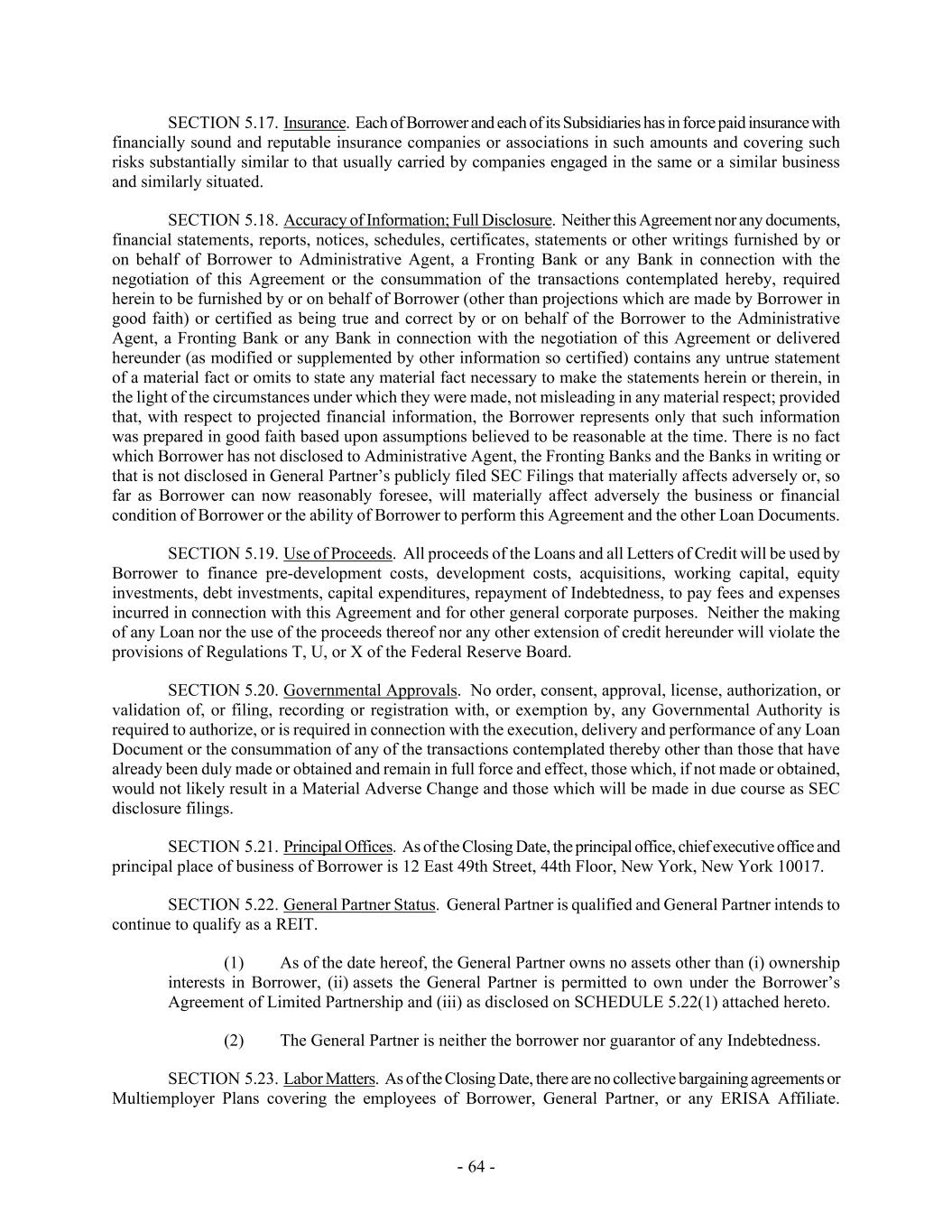- 64 - SECTION 5.17. Insurance. Each of Borrower and each of its Subsidiaries has in force paid insurance with financially sound and reputable insurance companies or associations in such amounts and covering such risks substantially similar to that usually carried by companies engaged in the same or a similar business and similarly situated. SECTION 5.18. Accuracy of Information; Full Disclosure. Neither this Agreement nor any documents, financial statements, reports, notices, schedules, certificates, statements or other writings furnished by or on behalf of Borrower to Administrative Agent, a Fronting Bank or any Bank in connection with the negotiation of this Agreement or the consummation of the transactions contemplated hereby, required herein to be furnished by or on behalf of Borrower (other than projections which are made by Borrower in good faith) or certified as being true and correct by or on behalf of the Borrower to the Administrative Agent, a Fronting Bank or any Bank in connection with the negotiation of this Agreement or delivered hereunder (as modified or supplemented by other information so certified) contains any untrue statement of a material fact or omits to state any material fact necessary to make the statements herein or therein, in the light of the circumstances under which they were made, not misleading in any material respect; provided that, with respect to projected financial information, the Borrower represents only that such information was prepared in good faith based upon assumptions believed to be reasonable at the time. There is no fact which Borrower has not disclosed to Administrative Agent, the Fronting Banks and the Banks in writing or that is not disclosed in General Partner’s publicly filed SEC Filings that materially affects adversely or, so far as Borrower can now reasonably foresee, will materially affect adversely the business or financial condition of Borrower or the ability of Borrower to perform this Agreement and the other Loan Documents. SECTION 5.19. Use of Proceeds. All proceeds of the Loans and all Letters of Credit will be used by Borrower to finance pre-development costs, development costs, acquisitions, working capital, equity investments, debt investments, capital expenditures, repayment of Indebtedness, to pay fees and expenses incurred in connection with this Agreement and for other general corporate purposes. Neither the making of any Loan nor the use of the proceeds thereof nor any other extension of credit hereunder will violate the provisions of Regulations T, U, or X of the Federal Reserve Board. SECTION 5.20. Governmental Approvals. No order, consent, approval, license, authorization, or validation of, or filing, recording or registration with, or exemption by, any Governmental Authority is required to authorize, or is required in connection with the execution, delivery and performance of any Loan Document or the consummation of any of the transactions contemplated thereby other than those that have already been duly made or obtained and remain in full force and effect, those which, if not made or obtained, would not likely result in a Material Adverse Change and those which will be made in due course as SEC disclosure filings. SECTION 5.21. Principal Offices. As of the Closing Date, the principal office, chief executive office and principal place of business of Borrower is 12 East 49th Street, 44th Floor, New York, New York 10017. SECTION 5.22. General Partner Status. General Partner is qualified and General Partner intends to continue to qualify as a REIT. (1) As of the date hereof, the General Partner owns no assets other than (i) ownership interests in Borrower, (ii) assets the General Partner is permitted to own under the Borrower’s Agreement of Limited Partnership and (iii) as disclosed on SCHEDULE 5.22(1) attached hereto. (2) The General Partner is neither the borrower nor guarantor of any Indebtedness. SECTION 5.23. Labor Matters. As of the Closing Date, there are no collective bargaining agreements or Multiemployer Plans covering the employees of Borrower, General Partner, or any ERISA Affiliate.
