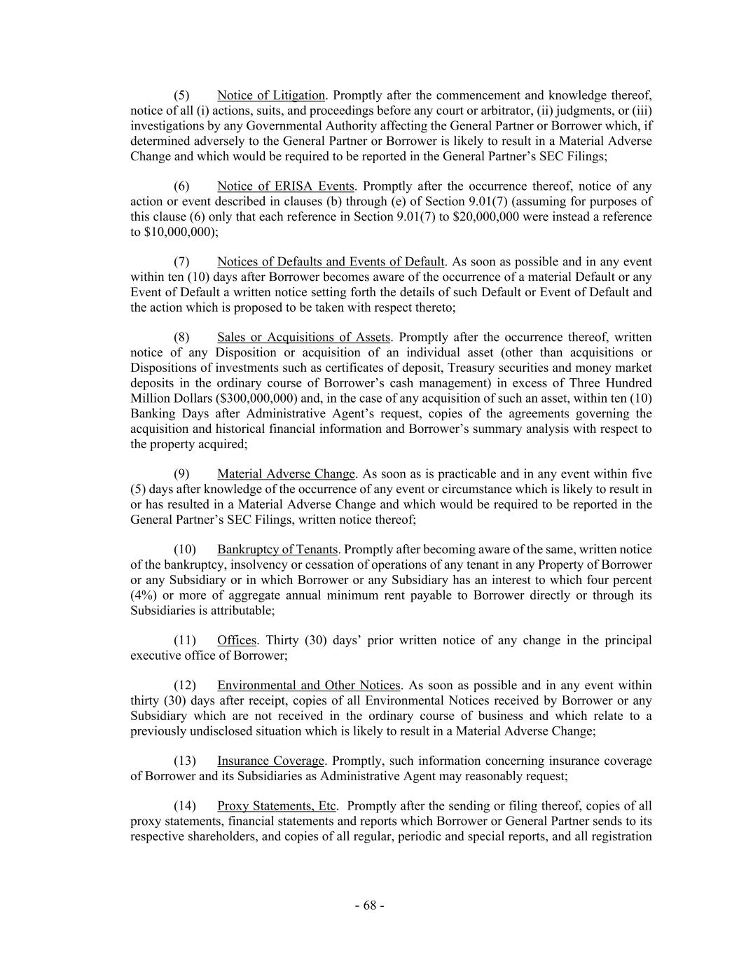 - 68 - (5) Notice of Litigation. Promptly after the commencement and knowledge thereof, notice of all (i) actions, suits, and proceedings before any court or arbitrator, (ii) judgments, or (iii) investigations by any Governmental Authority affecting the General Partner or Borrower which, if determined adversely to the General Partner or Borrower is likely to result in a Material Adverse Change and which would be required to be reported in the General Partner’s SEC Filings; (6) Notice of ERISA Events. Promptly after the occurrence thereof, notice of any action or event described in clauses (b) through (e) of Section 9.01(7) (assuming for purposes of this clause (6) only that each reference in Section 9.01(7) to $20,000,000 were instead a reference to $10,000,000); (7) Notices of Defaults and Events of Default. As soon as possible and in any event within ten (10) days after Borrower becomes aware of the occurrence of a material Default or any Event of Default a written notice setting forth the details of such Default or Event of Default and the action which is proposed to be taken with respect thereto; (8) Sales or Acquisitions of Assets. Promptly after the occurrence thereof, written notice of any Disposition or acquisition of an individual asset (other than acquisitions or Dispositions of investments such as certificates of deposit, Treasury securities and money market deposits in the ordinary course of Borrower’s cash management) in excess of Three Hundred Million Dollars ($300,000,000) and, in the case of any acquisition of such an asset, within ten (10) Banking Days after Administrative Agent’s request, copies of the agreements governing the acquisition and historical financial information and Borrower’s summary analysis with respect to the property acquired; (9) Material Adverse Change. As soon as is practicable and in any event within five (5) days after knowledge of the occurrence of any event or circumstance which is likely to result in or has resulted in a Material Adverse Change and which would be required to be reported in the General Partner’s SEC Filings, written notice thereof; (10) Bankruptcy of Tenants. Promptly after becoming aware of the same, written notice of the bankruptcy, insolvency or cessation of operations of any tenant in any Property of Borrower or any Subsidiary or in which Borrower or any Subsidiary has an interest to which four percent (4%) or more of aggregate annual minimum rent payable to Borrower directly or through its Subsidiaries is attributable; (11) Offices. Thirty (30) days’ prior written notice of any change in the principal executive office of Borrower; (12) Environmental and Other Notices. As soon as possible and in any event within thirty (30) days after receipt, copies of all Environmental Notices received by Borrower or any Subsidiary which are not received in the ordinary course of business and which relate to a previously undisclosed situation which is likely to result in a Material Adverse Change; (13) Insurance Coverage. Promptly, such information concerning insurance coverage of Borrower and its Subsidiaries as Administrative Agent may reasonably request; (14) Proxy Statements, Etc. Promptly after the sending or filing thereof, copies of all proxy statements, financial statements and reports which Borrower or General Partner sends to its respective shareholders, and copies of all regular, periodic and special reports, and all registration