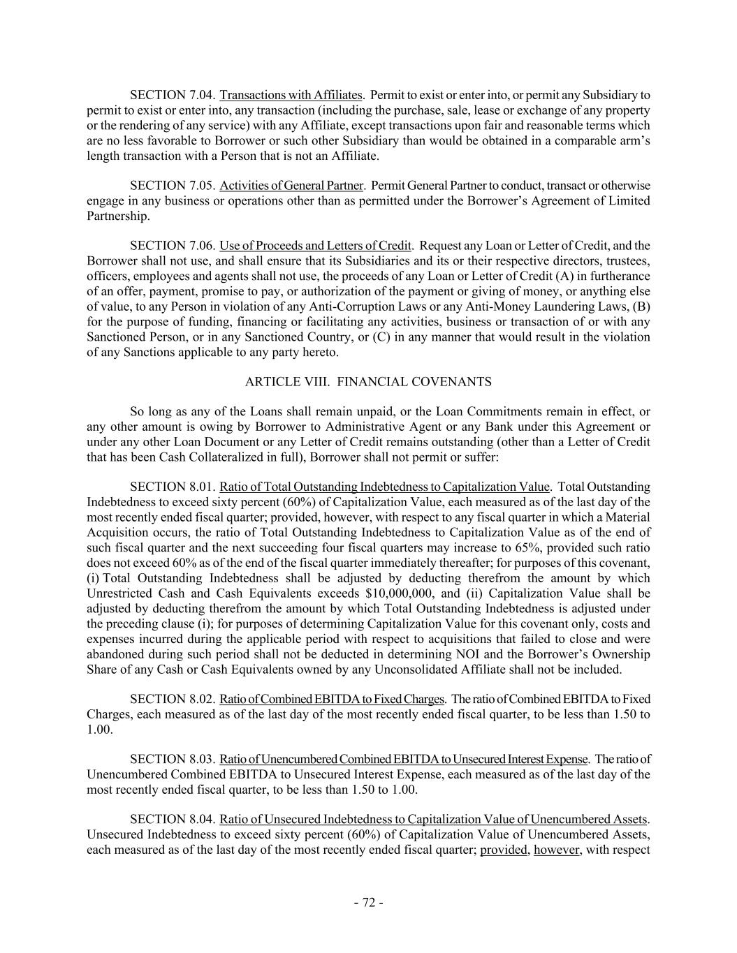 - 72 - SECTION 7.04. Transactions with Affiliates. Permit to exist or enter into, or permit any Subsidiary to permit to exist or enter into, any transaction (including the purchase, sale, lease or exchange of any property or the rendering of any service) with any Affiliate, except transactions upon fair and reasonable terms which are no less favorable to Borrower or such other Subsidiary than would be obtained in a comparable arm’s length transaction with a Person that is not an Affiliate. SECTION 7.05. Activities of General Partner. Permit General Partner to conduct, transact or otherwise engage in any business or operations other than as permitted under the Borrower’s Agreement of Limited Partnership. SECTION 7.06. Use of Proceeds and Letters of Credit. Request any Loan or Letter of Credit, and the Borrower shall not use, and shall ensure that its Subsidiaries and its or their respective directors, trustees, officers, employees and agents shall not use, the proceeds of any Loan or Letter of Credit (A) in furtherance of an offer, payment, promise to pay, or authorization of the payment or giving of money, or anything else of value, to any Person in violation of any Anti-Corruption Laws or any Anti-Money Laundering Laws, (B) for the purpose of funding, financing or facilitating any activities, business or transaction of or with any Sanctioned Person, or in any Sanctioned Country, or (C) in any manner that would result in the violation of any Sanctions applicable to any party hereto. ARTICLE VIII. FINANCIAL COVENANTS So long as any of the Loans shall remain unpaid, or the Loan Commitments remain in effect, or any other amount is owing by Borrower to Administrative Agent or any Bank under this Agreement or under any other Loan Document or any Letter of Credit remains outstanding (other than a Letter of Credit that has been Cash Collateralized in full), Borrower shall not permit or suffer: SECTION 8.01. Ratio of Total Outstanding Indebtedness to Capitalization Value. Total Outstanding Indebtedness to exceed sixty percent (60%) of Capitalization Value, each measured as of the last day of the most recently ended fiscal quarter; provided, however, with respect to any fiscal quarter in which a Material Acquisition occurs, the ratio of Total Outstanding Indebtedness to Capitalization Value as of the end of such fiscal quarter and the next succeeding four fiscal quarters may increase to 65%, provided such ratio does not exceed 60% as of the end of the fiscal quarter immediately thereafter; for purposes of this covenant, (i) Total Outstanding Indebtedness shall be adjusted by deducting therefrom the amount by which Unrestricted Cash and Cash Equivalents exceeds $10,000,000, and (ii) Capitalization Value shall be adjusted by deducting therefrom the amount by which Total Outstanding Indebtedness is adjusted under the preceding clause (i); for purposes of determining Capitalization Value for this covenant only, costs and expenses incurred during the applicable period with respect to acquisitions that failed to close and were abandoned during such period shall not be deducted in determining NOI and the Borrower’s Ownership Share of any Cash or Cash Equivalents owned by any Unconsolidated Affiliate shall not be included. SECTION 8.02. Ratio of Combined EBITDA to Fixed Charges. The ratio of Combined EBITDA to Fixed Charges, each measured as of the last day of the most recently ended fiscal quarter, to be less than 1.50 to 1.00. SECTION 8.03. Ratio of Unencumbered Combined EBITDA to Unsecured Interest Expense. The ratio of Unencumbered Combined EBITDA to Unsecured Interest Expense, each measured as of the last day of the most recently ended fiscal quarter, to be less than 1.50 to 1.00. SECTION 8.04. Ratio of Unsecured Indebtedness to Capitalization Value of Unencumbered Assets. Unsecured Indebtedness to exceed sixty percent (60%) of Capitalization Value of Unencumbered Assets, each measured as of the last day of the most recently ended fiscal quarter; provided, however, with respect