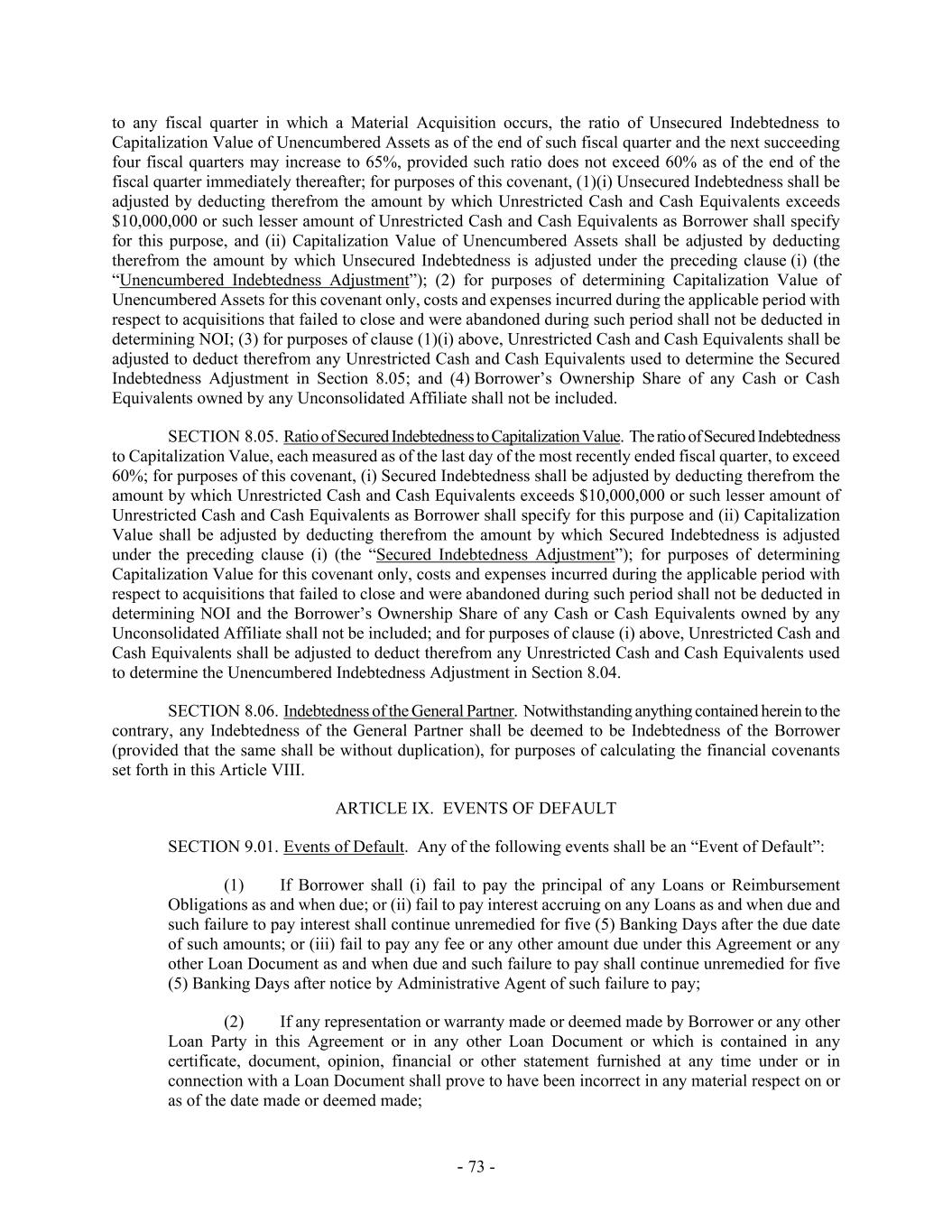 - 73 - to any fiscal quarter in which a Material Acquisition occurs, the ratio of Unsecured Indebtedness to Capitalization Value of Unencumbered Assets as of the end of such fiscal quarter and the next succeeding four fiscal quarters may increase to 65%, provided such ratio does not exceed 60% as of the end of the fiscal quarter immediately thereafter; for purposes of this covenant, (1)(i) Unsecured Indebtedness shall be adjusted by deducting therefrom the amount by which Unrestricted Cash and Cash Equivalents exceeds $10,000,000 or such lesser amount of Unrestricted Cash and Cash Equivalents as Borrower shall specify for this purpose, and (ii) Capitalization Value of Unencumbered Assets shall be adjusted by deducting therefrom the amount by which Unsecured Indebtedness is adjusted under the preceding clause (i) (the “Unencumbered Indebtedness Adjustment”); (2) for purposes of determining Capitalization Value of Unencumbered Assets for this covenant only, costs and expenses incurred during the applicable period with respect to acquisitions that failed to close and were abandoned during such period shall not be deducted in determining NOI; (3) for purposes of clause (1)(i) above, Unrestricted Cash and Cash Equivalents shall be adjusted to deduct therefrom any Unrestricted Cash and Cash Equivalents used to determine the Secured Indebtedness Adjustment in Section 8.05; and (4) Borrower’s Ownership Share of any Cash or Cash Equivalents owned by any Unconsolidated Affiliate shall not be included. SECTION 8.05. Ratio of Secured Indebtedness to Capitalization Value. The ratio of Secured Indebtedness to Capitalization Value, each measured as of the last day of the most recently ended fiscal quarter, to exceed 60%; for purposes of this covenant, (i) Secured Indebtedness shall be adjusted by deducting therefrom the amount by which Unrestricted Cash and Cash Equivalents exceeds $10,000,000 or such lesser amount of Unrestricted Cash and Cash Equivalents as Borrower shall specify for this purpose and (ii) Capitalization Value shall be adjusted by deducting therefrom the amount by which Secured Indebtedness is adjusted under the preceding clause (i) (the “Secured Indebtedness Adjustment”); for purposes of determining Capitalization Value for this covenant only, costs and expenses incurred during the applicable period with respect to acquisitions that failed to close and were abandoned during such period shall not be deducted in determining NOI and the Borrower’s Ownership Share of any Cash or Cash Equivalents owned by any Unconsolidated Affiliate shall not be included; and for purposes of clause (i) above, Unrestricted Cash and Cash Equivalents shall be adjusted to deduct therefrom any Unrestricted Cash and Cash Equivalents used to determine the Unencumbered Indebtedness Adjustment in Section 8.04. SECTION 8.06. Indebtedness of the General Partner. Notwithstanding anything contained herein to the contrary, any Indebtedness of the General Partner shall be deemed to be Indebtedness of the Borrower (provided that the same shall be without duplication), for purposes of calculating the financial covenants set forth in this Article VIII. ARTICLE IX. EVENTS OF DEFAULT SECTION 9.01. Events of Default. Any of the following events shall be an “Event of Default”: (1) If Borrower shall (i) fail to pay the principal of any Loans or Reimbursement Obligations as and when due; or (ii) fail to pay interest accruing on any Loans as and when due and such failure to pay interest shall continue unremedied for five (5) Banking Days after the due date of such amounts; or (iii) fail to pay any fee or any other amount due under this Agreement or any other Loan Document as and when due and such failure to pay shall continue unremedied for five (5) Banking Days after notice by Administrative Agent of such failure to pay; (2) If any representation or warranty made or deemed made by Borrower or any other Loan Party in this Agreement or in any other Loan Document or which is contained in any certificate, document, opinion, financial or other statement furnished at any time under or in connection with a Loan Document shall prove to have been incorrect in any material respect on or as of the date made or deemed made;