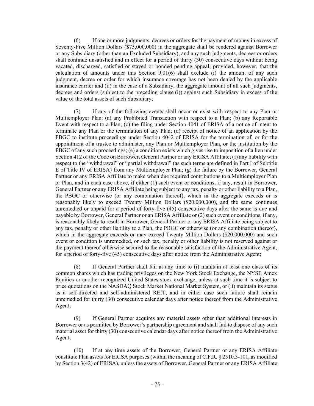 - 75 - (6) If one or more judgments, decrees or orders for the payment of money in excess of Seventy-Five Million Dollars ($75,000,000) in the aggregate shall be rendered against Borrower or any Subsidiary (other than an Excluded Subsidiary), and any such judgments, decrees or orders shall continue unsatisfied and in effect for a period of thirty (30) consecutive days without being vacated, discharged, satisfied or stayed or bonded pending appeal; provided, however, that the calculation of amounts under this Section 9.01(6) shall exclude (i) the amount of any such judgment, decree or order for which insurance coverage has not been denied by the applicable insurance carrier and (ii) in the case of a Subsidiary, the aggregate amount of all such judgments, decrees and orders (subject to the preceding clause (i)) against such Subsidiary in excess of the value of the total assets of such Subsidiary; (7) If any of the following events shall occur or exist with respect to any Plan or Multiemployer Plan: (a) any Prohibited Transaction with respect to a Plan; (b) any Reportable Event with respect to a Plan; (c) the filing under Section 4041 of ERISA of a notice of intent to terminate any Plan or the termination of any Plan; (d) receipt of notice of an application by the PBGC to institute proceedings under Section 4042 of ERISA for the termination of, or for the appointment of a trustee to administer, any Plan or Multiemployer Plan, or the institution by the PBGC of any such proceedings; (e) a condition exists which gives rise to imposition of a lien under Section 412 of the Code on Borrower, General Partner or any ERISA Affiliate; (f) any liability with respect to the “withdrawal” or “partial withdrawal” (as such terms are defined in Part I of Subtitle E of Title IV of ERISA) from any Multiemployer Plan; (g) the failure by the Borrower, General Partner or any ERISA Affiliate to make when due required contributions to a Multiemployer Plan or Plan, and in each case above, if either (1) such event or conditions, if any, result in Borrower, General Partner or any ERISA Affiliate being subject to any tax, penalty or other liability to a Plan, the PBGC or otherwise (or any combination thereof), which in the aggregate exceeds or is reasonably likely to exceed Twenty Million Dollars ($20,000,000), and the same continues unremedied or unpaid for a period of forty-five (45) consecutive days after the same is due and payable by Borrower, General Partner or an ERISA Affiliate or (2) such event or conditions, if any, is reasonably likely to result in Borrower, General Partner or any ERISA Affiliate being subject to any tax, penalty or other liability to a Plan, the PBGC or otherwise (or any combination thereof), which in the aggregate exceeds or may exceed Twenty Million Dollars ($20,000,000) and such event or condition is unremedied, or such tax, penalty or other liability is not reserved against or the payment thereof otherwise secured to the reasonable satisfaction of the Administrative Agent, for a period of forty-five (45) consecutive days after notice from the Administrative Agent; (8) If General Partner shall fail at any time to (i) maintain at least one class of its common shares which has trading privileges on the New York Stock Exchange, the NYSE Amex Equities or another recognized United States stock exchange, unless at such time it is subject to price quotations on the NASDAQ Stock Market National Market System, or (ii) maintain its status as a self-directed and self-administered REIT, and in either case such failure shall remain unremedied for thirty (30) consecutive calendar days after notice thereof from the Administrative Agent; (9) If General Partner acquires any material assets other than additional interests in Borrower or as permitted by Borrower’s partnership agreement and shall fail to dispose of any such material asset for thirty (30) consecutive calendar days after notice thereof from the Administrative Agent; (10) If at any time assets of the Borrower, General Partner or any ERISA Affiliate constitute Plan assets for ERISA purposes (within the meaning of C.F.R. § 2510.3-101, as modified by Section 3(42) of ERISA), unless the assets of Borrower, General Partner or any ERISA Affiliate