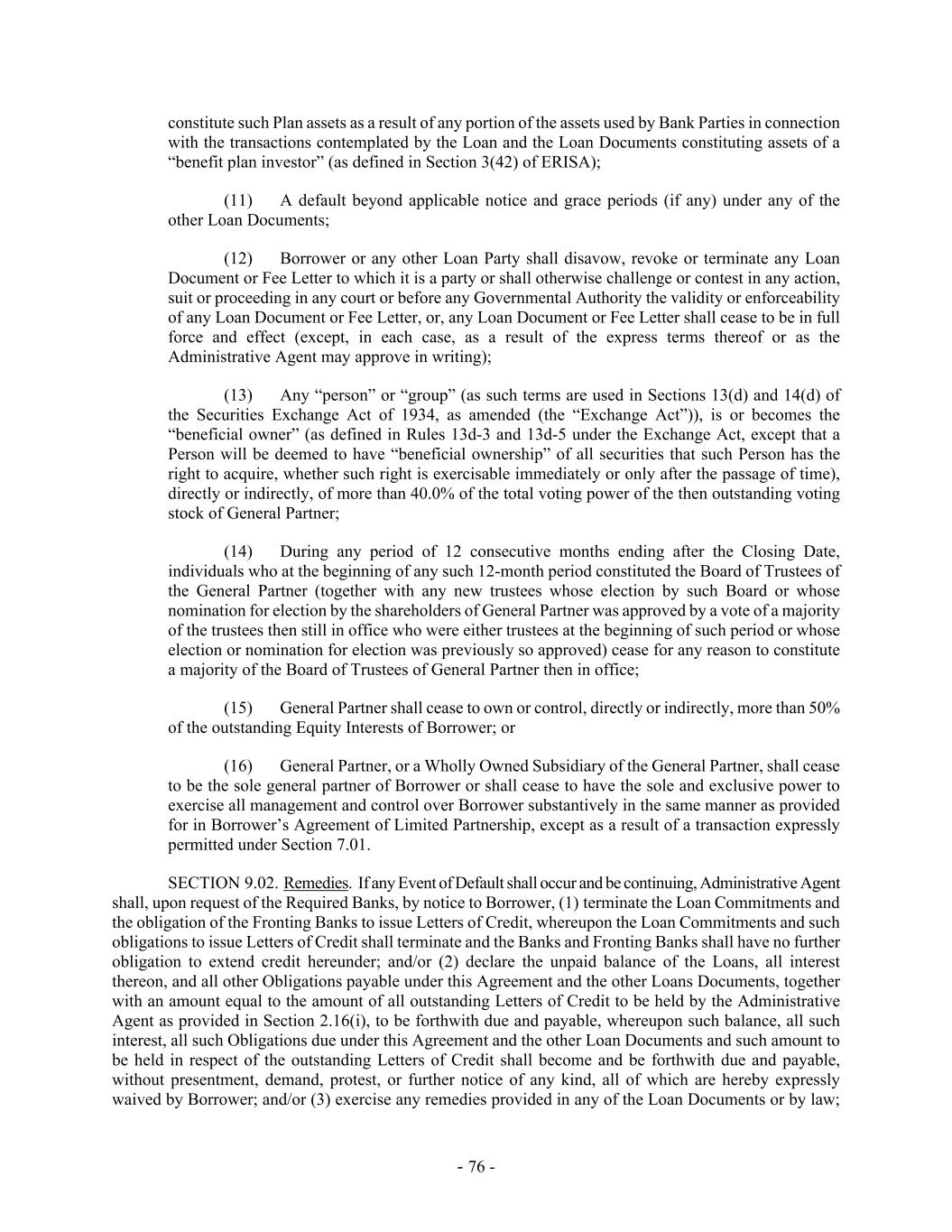 - 76 - constitute such Plan assets as a result of any portion of the assets used by Bank Parties in connection with the transactions contemplated by the Loan and the Loan Documents constituting assets of a “benefit plan investor” (as defined in Section 3(42) of ERISA); (11) A default beyond applicable notice and grace periods (if any) under any of the other Loan Documents; (12) Borrower or any other Loan Party shall disavow, revoke or terminate any Loan Document or Fee Letter to which it is a party or shall otherwise challenge or contest in any action, suit or proceeding in any court or before any Governmental Authority the validity or enforceability of any Loan Document or Fee Letter, or, any Loan Document or Fee Letter shall cease to be in full force and effect (except, in each case, as a result of the express terms thereof or as the Administrative Agent may approve in writing); (13) Any “person” or “group” (as such terms are used in Sections 13(d) and 14(d) of the Securities Exchange Act of 1934, as amended (the “Exchange Act”)), is or becomes the “beneficial owner” (as defined in Rules 13d-3 and 13d-5 under the Exchange Act, except that a Person will be deemed to have “beneficial ownership” of all securities that such Person has the right to acquire, whether such right is exercisable immediately or only after the passage of time), directly or indirectly, of more than 40.0% of the total voting power of the then outstanding voting stock of General Partner; (14) During any period of 12 consecutive months ending after the Closing Date, individuals who at the beginning of any such 12-month period constituted the Board of Trustees of the General Partner (together with any new trustees whose election by such Board or whose nomination for election by the shareholders of General Partner was approved by a vote of a majority of the trustees then still in office who were either trustees at the beginning of such period or whose election or nomination for election was previously so approved) cease for any reason to constitute a majority of the Board of Trustees of General Partner then in office; (15) General Partner shall cease to own or control, directly or indirectly, more than 50% of the outstanding Equity Interests of Borrower; or (16) General Partner, or a Wholly Owned Subsidiary of the General Partner, shall cease to be the sole general partner of Borrower or shall cease to have the sole and exclusive power to exercise all management and control over Borrower substantively in the same manner as provided for in Borrower’s Agreement of Limited Partnership, except as a result of a transaction expressly permitted under Section 7.01. SECTION 9.02. Remedies. If any Event of Default shall occur and be continuing, Administrative Agent shall, upon request of the Required Banks, by notice to Borrower, (1) terminate the Loan Commitments and the obligation of the Fronting Banks to issue Letters of Credit, whereupon the Loan Commitments and such obligations to issue Letters of Credit shall terminate and the Banks and Fronting Banks shall have no further obligation to extend credit hereunder; and/or (2) declare the unpaid balance of the Loans, all interest thereon, and all other Obligations payable under this Agreement and the other Loans Documents, together with an amount equal to the amount of all outstanding Letters of Credit to be held by the Administrative Agent as provided in Section 2.16(i), to be forthwith due and payable, whereupon such balance, all such interest, all such Obligations due under this Agreement and the other Loan Documents and such amount to be held in respect of the outstanding Letters of Credit shall become and be forthwith due and payable, without presentment, demand, protest, or further notice of any kind, all of which are hereby expressly waived by Borrower; and/or (3) exercise any remedies provided in any of the Loan Documents or by law;