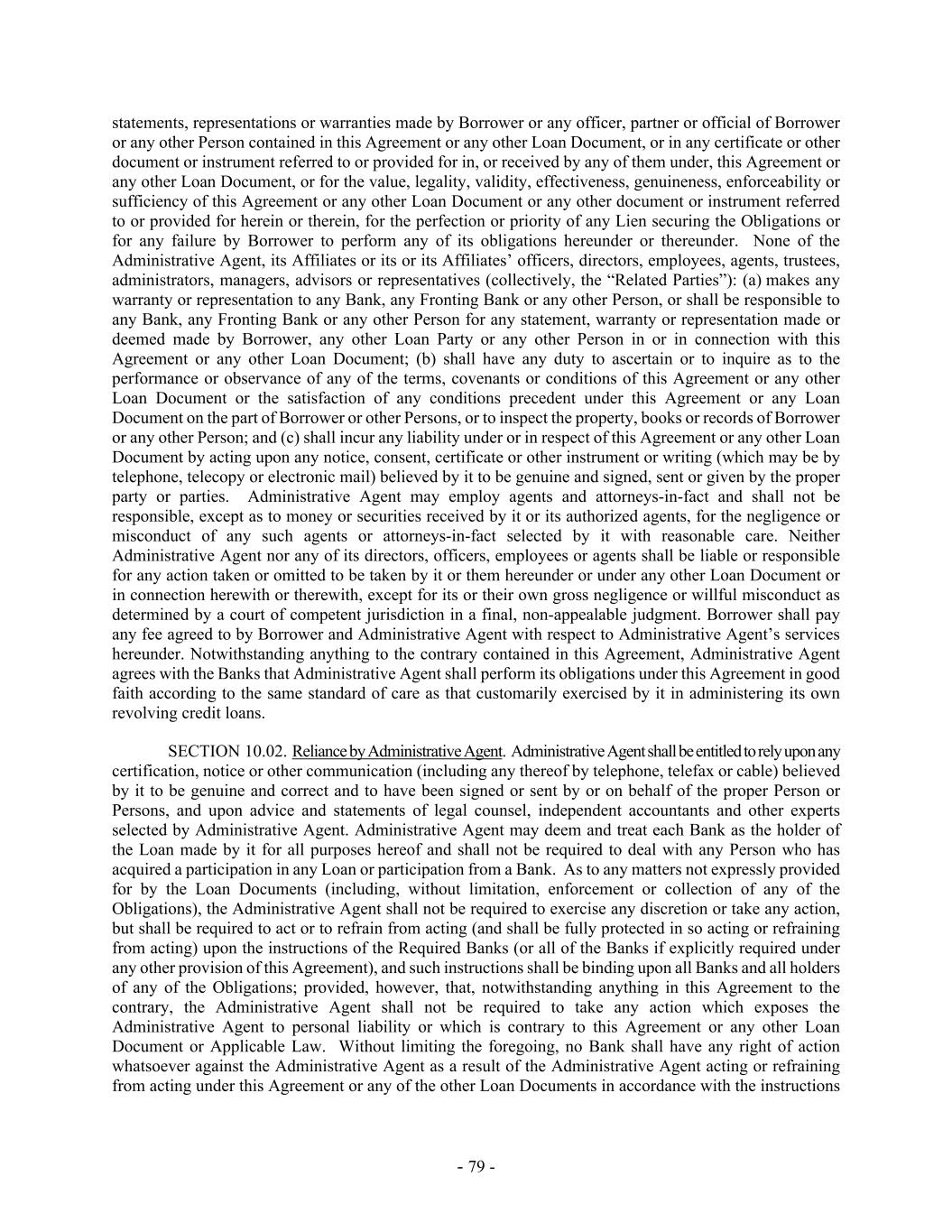 - 79 - statements, representations or warranties made by Borrower or any officer, partner or official of Borrower or any other Person contained in this Agreement or any other Loan Document, or in any certificate or other document or instrument referred to or provided for in, or received by any of them under, this Agreement or any other Loan Document, or for the value, legality, validity, effectiveness, genuineness, enforceability or sufficiency of this Agreement or any other Loan Document or any other document or instrument referred to or provided for herein or therein, for the perfection or priority of any Lien securing the Obligations or for any failure by Borrower to perform any of its obligations hereunder or thereunder. None of the Administrative Agent, its Affiliates or its or its Affiliates’ officers, directors, employees, agents, trustees, administrators, managers, advisors or representatives (collectively, the “Related Parties”): (a) makes any warranty or representation to any Bank, any Fronting Bank or any other Person, or shall be responsible to any Bank, any Fronting Bank or any other Person for any statement, warranty or representation made or deemed made by Borrower, any other Loan Party or any other Person in or in connection with this Agreement or any other Loan Document; (b) shall have any duty to ascertain or to inquire as to the performance or observance of any of the terms, covenants or conditions of this Agreement or any other Loan Document or the satisfaction of any conditions precedent under this Agreement or any Loan Document on the part of Borrower or other Persons, or to inspect the property, books or records of Borrower or any other Person; and (c) shall incur any liability under or in respect of this Agreement or any other Loan Document by acting upon any notice, consent, certificate or other instrument or writing (which may be by telephone, telecopy or electronic mail) believed by it to be genuine and signed, sent or given by the proper party or parties. Administrative Agent may employ agents and attorneys-in-fact and shall not be responsible, except as to money or securities received by it or its authorized agents, for the negligence or misconduct of any such agents or attorneys-in-fact selected by it with reasonable care. Neither Administrative Agent nor any of its directors, officers, employees or agents shall be liable or responsible for any action taken or omitted to be taken by it or them hereunder or under any other Loan Document or in connection herewith or therewith, except for its or their own gross negligence or willful misconduct as determined by a court of competent jurisdiction in a final, non-appealable judgment. Borrower shall pay any fee agreed to by Borrower and Administrative Agent with respect to Administrative Agent’s services hereunder. Notwithstanding anything to the contrary contained in this Agreement, Administrative Agent agrees with the Banks that Administrative Agent shall perform its obligations under this Agreement in good faith according to the same standard of care as that customarily exercised by it in administering its own revolving credit loans. SECTION 10.02. Reliance by Administrative Agent. Administrative Agent shall be entitled to rely upon any certification, notice or other communication (including any thereof by telephone, telefax or cable) believed by it to be genuine and correct and to have been signed or sent by or on behalf of the proper Person or Persons, and upon advice and statements of legal counsel, independent accountants and other experts selected by Administrative Agent. Administrative Agent may deem and treat each Bank as the holder of the Loan made by it for all purposes hereof and shall not be required to deal with any Person who has acquired a participation in any Loan or participation from a Bank. As to any matters not expressly provided for by the Loan Documents (including, without limitation, enforcement or collection of any of the Obligations), the Administrative Agent shall not be required to exercise any discretion or take any action, but shall be required to act or to refrain from acting (and shall be fully protected in so acting or refraining from acting) upon the instructions of the Required Banks (or all of the Banks if explicitly required under any other provision of this Agreement), and such instructions shall be binding upon all Banks and all holders of any of the Obligations; provided, however, that, notwithstanding anything in this Agreement to the contrary, the Administrative Agent shall not be required to take any action which exposes the Administrative Agent to personal liability or which is contrary to this Agreement or any other Loan Document or Applicable Law. Without limiting the foregoing, no Bank shall have any right of action whatsoever against the Administrative Agent as a result of the Administrative Agent acting or refraining from acting under this Agreement or any of the other Loan Documents in accordance with the instructions