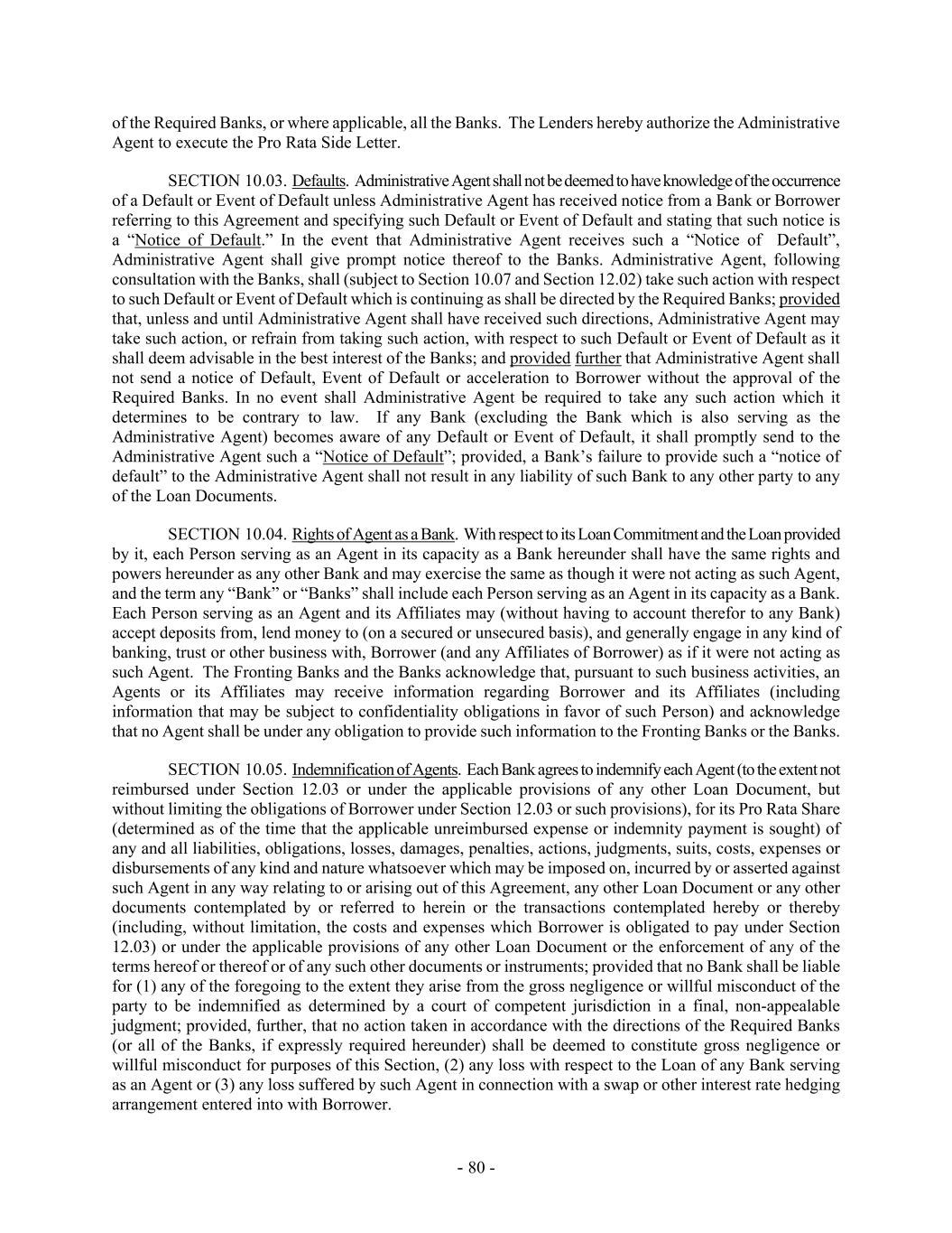 - 80 - of the Required Banks, or where applicable, all the Banks. The Lenders hereby authorize the Administrative Agent to execute the Pro Rata Side Letter. SECTION 10.03. Defaults. Administrative Agent shall not be deemed to have knowledge of the occurrence of a Default or Event of Default unless Administrative Agent has received notice from a Bank or Borrower referring to this Agreement and specifying such Default or Event of Default and stating that such notice is a “Notice of Default.” In the event that Administrative Agent receives such a “Notice of Default”, Administrative Agent shall give prompt notice thereof to the Banks. Administrative Agent, following consultation with the Banks, shall (subject to Section 10.07 and Section 12.02) take such action with respect to such Default or Event of Default which is continuing as shall be directed by the Required Banks; provided that, unless and until Administrative Agent shall have received such directions, Administrative Agent may take such action, or refrain from taking such action, with respect to such Default or Event of Default as it shall deem advisable in the best interest of the Banks; and provided further that Administrative Agent shall not send a notice of Default, Event of Default or acceleration to Borrower without the approval of the Required Banks. In no event shall Administrative Agent be required to take any such action which it determines to be contrary to law. If any Bank (excluding the Bank which is also serving as the Administrative Agent) becomes aware of any Default or Event of Default, it shall promptly send to the Administrative Agent such a “Notice of Default”; provided, a Bank’s failure to provide such a “notice of default” to the Administrative Agent shall not result in any liability of such Bank to any other party to any of the Loan Documents. SECTION 10.04. Rights of Agent as a Bank. With respect to its Loan Commitment and the Loan provided by it, each Person serving as an Agent in its capacity as a Bank hereunder shall have the same rights and powers hereunder as any other Bank and may exercise the same as though it were not acting as such Agent, and the term any “Bank” or “Banks” shall include each Person serving as an Agent in its capacity as a Bank. Each Person serving as an Agent and its Affiliates may (without having to account therefor to any Bank) accept deposits from, lend money to (on a secured or unsecured basis), and generally engage in any kind of banking, trust or other business with, Borrower (and any Affiliates of Borrower) as if it were not acting as such Agent. The Fronting Banks and the Banks acknowledge that, pursuant to such business activities, an Agents or its Affiliates may receive information regarding Borrower and its Affiliates (including information that may be subject to confidentiality obligations in favor of such Person) and acknowledge that no Agent shall be under any obligation to provide such information to the Fronting Banks or the Banks. SECTION 10.05. Indemnification of Agents. Each Bank agrees to indemnify each Agent (to the extent not reimbursed under Section 12.03 or under the applicable provisions of any other Loan Document, but without limiting the obligations of Borrower under Section 12.03 or such provisions), for its Pro Rata Share (determined as of the time that the applicable unreimbursed expense or indemnity payment is sought) of any and all liabilities, obligations, losses, damages, penalties, actions, judgments, suits, costs, expenses or disbursements of any kind and nature whatsoever which may be imposed on, incurred by or asserted against such Agent in any way relating to or arising out of this Agreement, any other Loan Document or any other documents contemplated by or referred to herein or the transactions contemplated hereby or thereby (including, without limitation, the costs and expenses which Borrower is obligated to pay under Section 12.03) or under the applicable provisions of any other Loan Document or the enforcement of any of the terms hereof or thereof or of any such other documents or instruments; provided that no Bank shall be liable for (1) any of the foregoing to the extent they arise from the gross negligence or willful misconduct of the party to be indemnified as determined by a court of competent jurisdiction in a final, non-appealable judgment; provided, further, that no action taken in accordance with the directions of the Required Banks (or all of the Banks, if expressly required hereunder) shall be deemed to constitute gross negligence or willful misconduct for purposes of this Section, (2) any loss with respect to the Loan of any Bank serving as an Agent or (3) any loss suffered by such Agent in connection with a swap or other interest rate hedging arrangement entered into with Borrower.