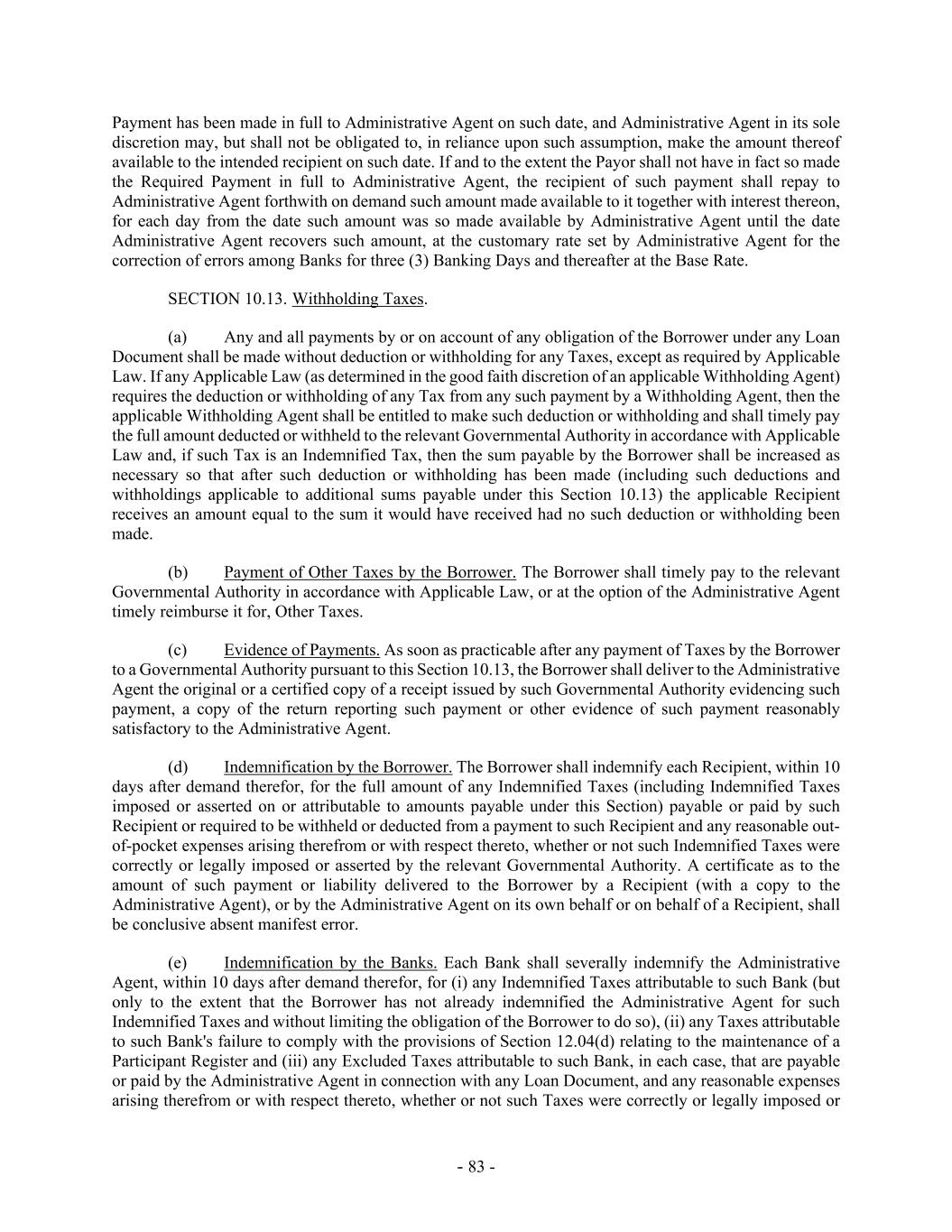 - 83 - Payment has been made in full to Administrative Agent on such date, and Administrative Agent in its sole discretion may, but shall not be obligated to, in reliance upon such assumption, make the amount thereof available to the intended recipient on such date. If and to the extent the Payor shall not have in fact so made the Required Payment in full to Administrative Agent, the recipient of such payment shall repay to Administrative Agent forthwith on demand such amount made available to it together with interest thereon, for each day from the date such amount was so made available by Administrative Agent until the date Administrative Agent recovers such amount, at the customary rate set by Administrative Agent for the correction of errors among Banks for three (3) Banking Days and thereafter at the Base Rate. SECTION 10.13. Withholding Taxes. (a) Any and all payments by or on account of any obligation of the Borrower under any Loan Document shall be made without deduction or withholding for any Taxes, except as required by Applicable Law. If any Applicable Law (as determined in the good faith discretion of an applicable Withholding Agent) requires the deduction or withholding of any Tax from any such payment by a Withholding Agent, then the applicable Withholding Agent shall be entitled to make such deduction or withholding and shall timely pay the full amount deducted or withheld to the relevant Governmental Authority in accordance with Applicable Law and, if such Tax is an Indemnified Tax, then the sum payable by the Borrower shall be increased as necessary so that after such deduction or withholding has been made (including such deductions and withholdings applicable to additional sums payable under this Section 10.13) the applicable Recipient receives an amount equal to the sum it would have received had no such deduction or withholding been made. (b) Payment of Other Taxes by the Borrower. The Borrower shall timely pay to the relevant Governmental Authority in accordance with Applicable Law, or at the option of the Administrative Agent timely reimburse it for, Other Taxes. (c) Evidence of Payments. As soon as practicable after any payment of Taxes by the Borrower to a Governmental Authority pursuant to this Section 10.13, the Borrower shall deliver to the Administrative Agent the original or a certified copy of a receipt issued by such Governmental Authority evidencing such payment, a copy of the return reporting such payment or other evidence of such payment reasonably satisfactory to the Administrative Agent. (d) Indemnification by the Borrower. The Borrower shall indemnify each Recipient, within 10 days after demand therefor, for the full amount of any Indemnified Taxes (including Indemnified Taxes imposed or asserted on or attributable to amounts payable under this Section) payable or paid by such Recipient or required to be withheld or deducted from a payment to such Recipient and any reasonable out- of-pocket expenses arising therefrom or with respect thereto, whether or not such Indemnified Taxes were correctly or legally imposed or asserted by the relevant Governmental Authority. A certificate as to the amount of such payment or liability delivered to the Borrower by a Recipient (with a copy to the Administrative Agent), or by the Administrative Agent on its own behalf or on behalf of a Recipient, shall be conclusive absent manifest error. (e) Indemnification by the Banks. Each Bank shall severally indemnify the Administrative Agent, within 10 days after demand therefor, for (i) any Indemnified Taxes attributable to such Bank (but only to the extent that the Borrower has not already indemnified the Administrative Agent for such Indemnified Taxes and without limiting the obligation of the Borrower to do so), (ii) any Taxes attributable to such Bank's failure to comply with the provisions of Section 12.04(d) relating to the maintenance of a Participant Register and (iii) any Excluded Taxes attributable to such Bank, in each case, that are payable or paid by the Administrative Agent in connection with any Loan Document, and any reasonable expenses arising therefrom or with respect thereto, whether or not such Taxes were correctly or legally imposed or