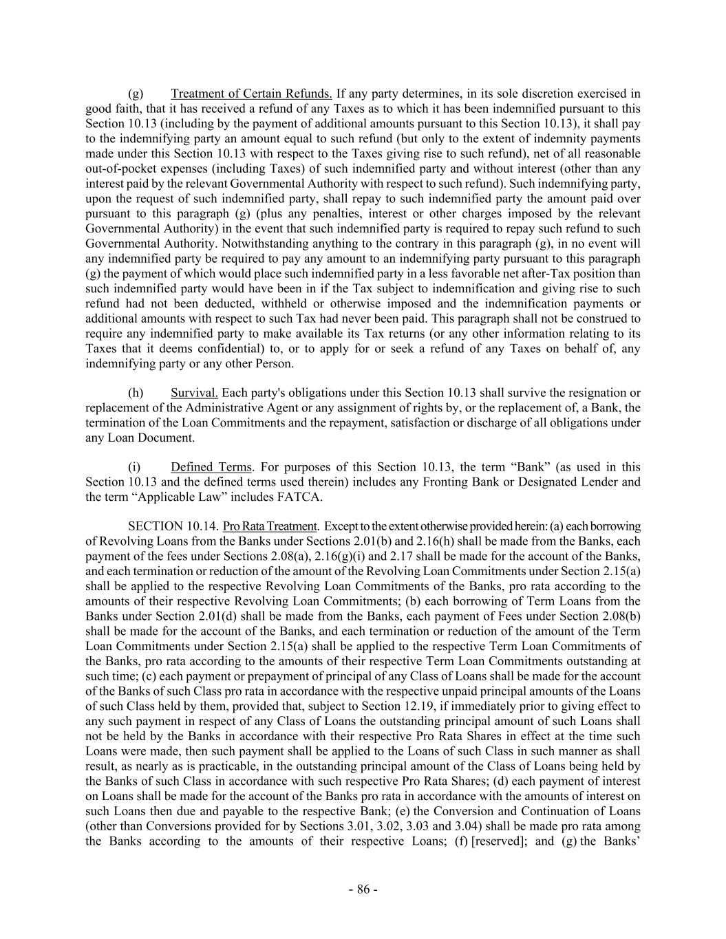- 86 - (g) Treatment of Certain Refunds. If any party determines, in its sole discretion exercised in good faith, that it has received a refund of any Taxes as to which it has been indemnified pursuant to this Section 10.13 (including by the payment of additional amounts pursuant to this Section 10.13), it shall pay to the indemnifying party an amount equal to such refund (but only to the extent of indemnity payments made under this Section 10.13 with respect to the Taxes giving rise to such refund), net of all reasonable out-of-pocket expenses (including Taxes) of such indemnified party and without interest (other than any interest paid by the relevant Governmental Authority with respect to such refund). Such indemnifying party, upon the request of such indemnified party, shall repay to such indemnified party the amount paid over pursuant to this paragraph (g) (plus any penalties, interest or other charges imposed by the relevant Governmental Authority) in the event that such indemnified party is required to repay such refund to such Governmental Authority. Notwithstanding anything to the contrary in this paragraph (g), in no event will any indemnified party be required to pay any amount to an indemnifying party pursuant to this paragraph (g) the payment of which would place such indemnified party in a less favorable net after-Tax position than such indemnified party would have been in if the Tax subject to indemnification and giving rise to such refund had not been deducted, withheld or otherwise imposed and the indemnification payments or additional amounts with respect to such Tax had never been paid. This paragraph shall not be construed to require any indemnified party to make available its Tax returns (or any other information relating to its Taxes that it deems confidential) to, or to apply for or seek a refund of any Taxes on behalf of, any indemnifying party or any other Person. (h) Survival. Each party's obligations under this Section 10.13 shall survive the resignation or replacement of the Administrative Agent or any assignment of rights by, or the replacement of, a Bank, the termination of the Loan Commitments and the repayment, satisfaction or discharge of all obligations under any Loan Document. (i) Defined Terms. For purposes of this Section 10.13, the term “Bank” (as used in this Section 10.13 and the defined terms used therein) includes any Fronting Bank or Designated Lender and the term “Applicable Law” includes FATCA. SECTION 10.14. Pro Rata Treatment. Except to the extent otherwise provided herein: (a) each borrowing of Revolving Loans from the Banks under Sections 2.01(b) and 2.16(h) shall be made from the Banks, each payment of the fees under Sections 2.08(a), 2.16(g)(i) and 2.17 shall be made for the account of the Banks, and each termination or reduction of the amount of the Revolving Loan Commitments under Section 2.15(a) shall be applied to the respective Revolving Loan Commitments of the Banks, pro rata according to the amounts of their respective Revolving Loan Commitments; (b) each borrowing of Term Loans from the Banks under Section 2.01(d) shall be made from the Banks, each payment of Fees under Section 2.08(b) shall be made for the account of the Banks, and each termination or reduction of the amount of the Term Loan Commitments under Section 2.15(a) shall be applied to the respective Term Loan Commitments of the Banks, pro rata according to the amounts of their respective Term Loan Commitments outstanding at such time; (c) each payment or prepayment of principal of any Class of Loans shall be made for the account of the Banks of such Class pro rata in accordance with the respective unpaid principal amounts of the Loans of such Class held by them, provided that, subject to Section 12.19, if immediately prior to giving effect to any such payment in respect of any Class of Loans the outstanding principal amount of such Loans shall not be held by the Banks in accordance with their respective Pro Rata Shares in effect at the time such Loans were made, then such payment shall be applied to the Loans of such Class in such manner as shall result, as nearly as is practicable, in the outstanding principal amount of the Class of Loans being held by the Banks of such Class in accordance with such respective Pro Rata Shares; (d) each payment of interest on Loans shall be made for the account of the Banks pro rata in accordance with the amounts of interest on such Loans then due and payable to the respective Bank; (e) the Conversion and Continuation of Loans (other than Conversions provided for by Sections 3.01, 3.02, 3.03 and 3.04) shall be made pro rata among the Banks according to the amounts of their respective Loans; (f) [reserved]; and (g) the Banks’