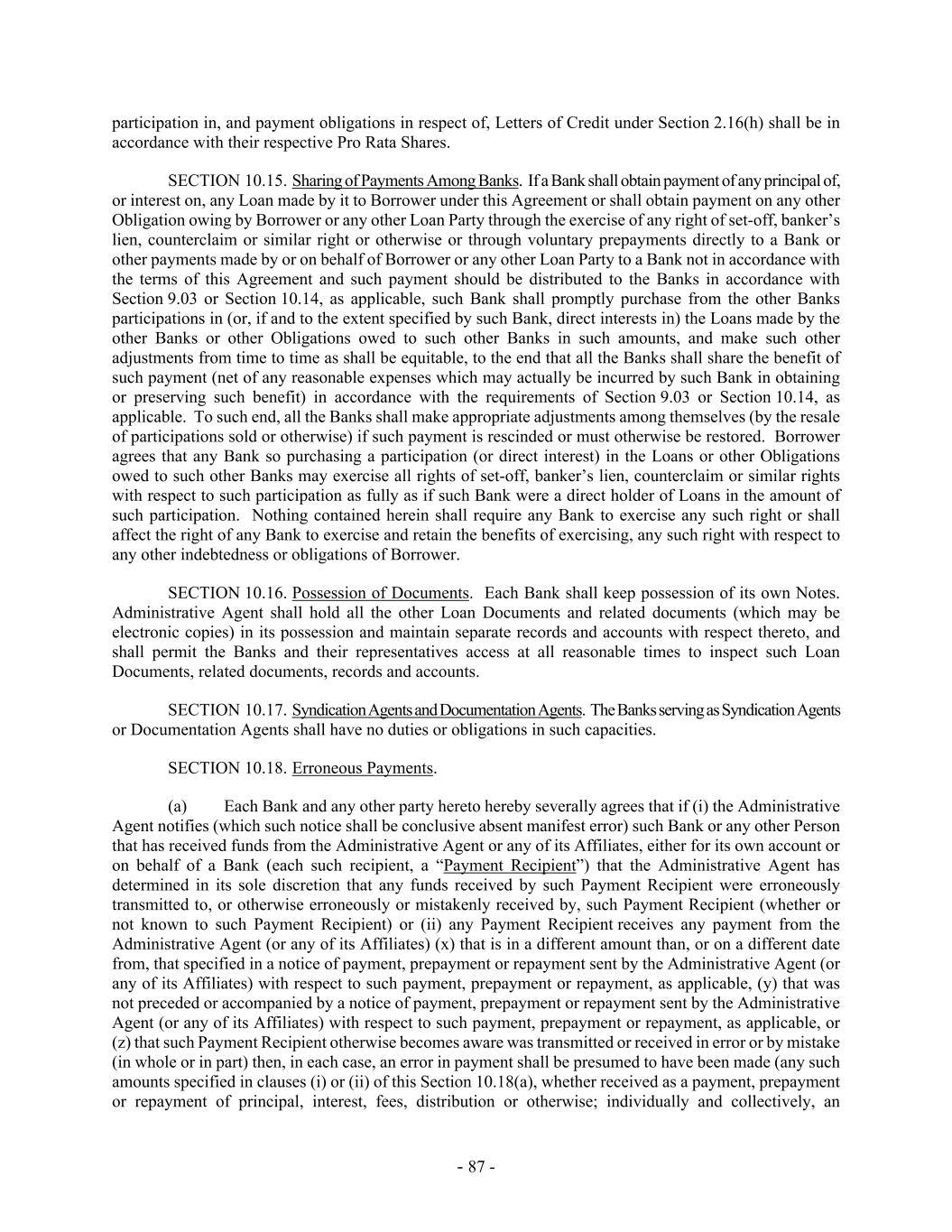 - 87 - participation in, and payment obligations in respect of, Letters of Credit under Section 2.16(h) shall be in accordance with their respective Pro Rata Shares. SECTION 10.15. Sharing of Payments Among Banks. If a Bank shall obtain payment of any principal of, or interest on, any Loan made by it to Borrower under this Agreement or shall obtain payment on any other Obligation owing by Borrower or any other Loan Party through the exercise of any right of set-off, banker’s lien, counterclaim or similar right or otherwise or through voluntary prepayments directly to a Bank or other payments made by or on behalf of Borrower or any other Loan Party to a Bank not in accordance with the terms of this Agreement and such payment should be distributed to the Banks in accordance with Section 9.03 or Section 10.14, as applicable, such Bank shall promptly purchase from the other Banks participations in (or, if and to the extent specified by such Bank, direct interests in) the Loans made by the other Banks or other Obligations owed to such other Banks in such amounts, and make such other adjustments from time to time as shall be equitable, to the end that all the Banks shall share the benefit of such payment (net of any reasonable expenses which may actually be incurred by such Bank in obtaining or preserving such benefit) in accordance with the requirements of Section 9.03 or Section 10.14, as applicable. To such end, all the Banks shall make appropriate adjustments among themselves (by the resale of participations sold or otherwise) if such payment is rescinded or must otherwise be restored. Borrower agrees that any Bank so purchasing a participation (or direct interest) in the Loans or other Obligations owed to such other Banks may exercise all rights of set-off, banker’s lien, counterclaim or similar rights with respect to such participation as fully as if such Bank were a direct holder of Loans in the amount of such participation. Nothing contained herein shall require any Bank to exercise any such right or shall affect the right of any Bank to exercise and retain the benefits of exercising, any such right with respect to any other indebtedness or obligations of Borrower. SECTION 10.16. Possession of Documents. Each Bank shall keep possession of its own Notes. Administrative Agent shall hold all the other Loan Documents and related documents (which may be electronic copies) in its possession and maintain separate records and accounts with respect thereto, and shall permit the Banks and their representatives access at all reasonable times to inspect such Loan Documents, related documents, records and accounts. SECTION 10.17. Syndication Agents and Documentation Agents. The Banks serving as Syndication Agents or Documentation Agents shall have no duties or obligations in such capacities. SECTION 10.18. Erroneous Payments. (a) Each Bank and any other party hereto hereby severally agrees that if (i) the Administrative Agent notifies (which such notice shall be conclusive absent manifest error) such Bank or any other Person that has received funds from the Administrative Agent or any of its Affiliates, either for its own account or on behalf of a Bank (each such recipient, a “Payment Recipient”) that the Administrative Agent has determined in its sole discretion that any funds received by such Payment Recipient were erroneously transmitted to, or otherwise erroneously or mistakenly received by, such Payment Recipient (whether or not known to such Payment Recipient) or (ii) any Payment Recipient receives any payment from the Administrative Agent (or any of its Affiliates) (x) that is in a different amount than, or on a different date from, that specified in a notice of payment, prepayment or repayment sent by the Administrative Agent (or any of its Affiliates) with respect to such payment, prepayment or repayment, as applicable, (y) that was not preceded or accompanied by a notice of payment, prepayment or repayment sent by the Administrative Agent (or any of its Affiliates) with respect to such payment, prepayment or repayment, as applicable, or (z) that such Payment Recipient otherwise becomes aware was transmitted or received in error or by mistake (in whole or in part) then, in each case, an error in payment shall be presumed to have been made (any such amounts specified in clauses (i) or (ii) of this Section 10.18(a), whether received as a payment, prepayment or repayment of principal, interest, fees, distribution or otherwise; individually and collectively, an