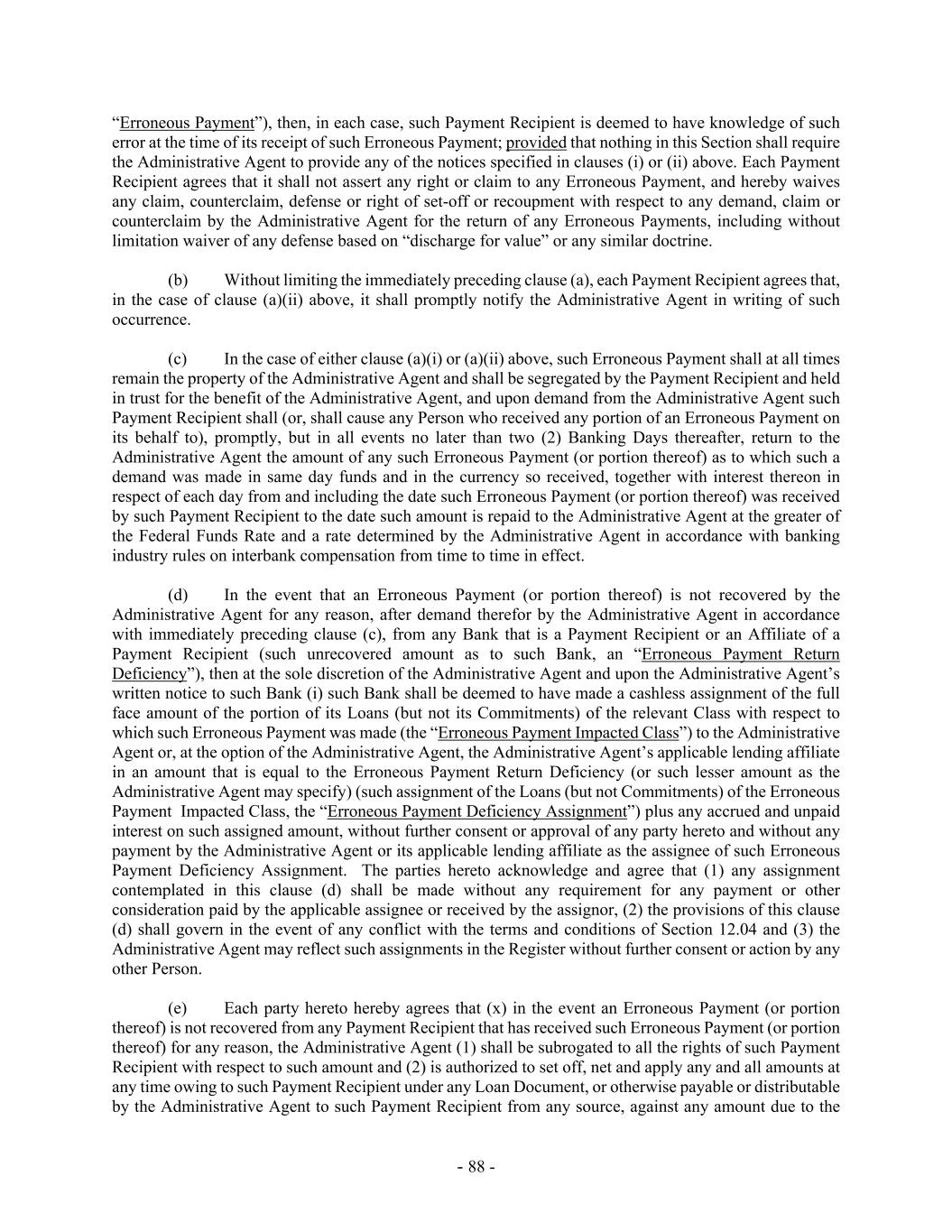 - 88 - “Erroneous Payment”), then, in each case, such Payment Recipient is deemed to have knowledge of such error at the time of its receipt of such Erroneous Payment; provided that nothing in this Section shall require the Administrative Agent to provide any of the notices specified in clauses (i) or (ii) above. Each Payment Recipient agrees that it shall not assert any right or claim to any Erroneous Payment, and hereby waives any claim, counterclaim, defense or right of set-off or recoupment with respect to any demand, claim or counterclaim by the Administrative Agent for the return of any Erroneous Payments, including without limitation waiver of any defense based on “discharge for value” or any similar doctrine. (b) Without limiting the immediately preceding clause (a), each Payment Recipient agrees that, in the case of clause (a)(ii) above, it shall promptly notify the Administrative Agent in writing of such occurrence. (c) In the case of either clause (a)(i) or (a)(ii) above, such Erroneous Payment shall at all times remain the property of the Administrative Agent and shall be segregated by the Payment Recipient and held in trust for the benefit of the Administrative Agent, and upon demand from the Administrative Agent such Payment Recipient shall (or, shall cause any Person who received any portion of an Erroneous Payment on its behalf to), promptly, but in all events no later than two (2) Banking Days thereafter, return to the Administrative Agent the amount of any such Erroneous Payment (or portion thereof) as to which such a demand was made in same day funds and in the currency so received, together with interest thereon in respect of each day from and including the date such Erroneous Payment (or portion thereof) was received by such Payment Recipient to the date such amount is repaid to the Administrative Agent at the greater of the Federal Funds Rate and a rate determined by the Administrative Agent in accordance with banking industry rules on interbank compensation from time to time in effect. (d) In the event that an Erroneous Payment (or portion thereof) is not recovered by the Administrative Agent for any reason, after demand therefor by the Administrative Agent in accordance with immediately preceding clause (c), from any Bank that is a Payment Recipient or an Affiliate of a Payment Recipient (such unrecovered amount as to such Bank, an “Erroneous Payment Return Deficiency”), then at the sole discretion of the Administrative Agent and upon the Administrative Agent’s written notice to such Bank (i) such Bank shall be deemed to have made a cashless assignment of the full face amount of the portion of its Loans (but not its Commitments) of the relevant Class with respect to which such Erroneous Payment was made (the “Erroneous Payment Impacted Class”) to the Administrative Agent or, at the option of the Administrative Agent, the Administrative Agent’s applicable lending affiliate in an amount that is equal to the Erroneous Payment Return Deficiency (or such lesser amount as the Administrative Agent may specify) (such assignment of the Loans (but not Commitments) of the Erroneous Payment Impacted Class, the “Erroneous Payment Deficiency Assignment”) plus any accrued and unpaid interest on such assigned amount, without further consent or approval of any party hereto and without any payment by the Administrative Agent or its applicable lending affiliate as the assignee of such Erroneous Payment Deficiency Assignment. The parties hereto acknowledge and agree that (1) any assignment contemplated in this clause (d) shall be made without any requirement for any payment or other consideration paid by the applicable assignee or received by the assignor, (2) the provisions of this clause (d) shall govern in the event of any conflict with the terms and conditions of Section 12.04 and (3) the Administrative Agent may reflect such assignments in the Register without further consent or action by any other Person. (e) Each party hereto hereby agrees that (x) in the event an Erroneous Payment (or portion thereof) is not recovered from any Payment Recipient that has received such Erroneous Payment (or portion thereof) for any reason, the Administrative Agent (1) shall be subrogated to all the rights of such Payment Recipient with respect to such amount and (2) is authorized to set off, net and apply any and all amounts at any time owing to such Payment Recipient under any Loan Document, or otherwise payable or distributable by the Administrative Agent to such Payment Recipient from any source, against any amount due to the
