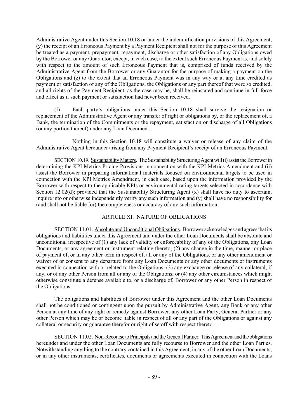 - 89 - Administrative Agent under this Section 10.18 or under the indemnification provisions of this Agreement, (y) the receipt of an Erroneous Payment by a Payment Recipient shall not for the purpose of this Agreement be treated as a payment, prepayment, repayment, discharge or other satisfaction of any Obligations owed by the Borrower or any Guarantor, except, in each case, to the extent such Erroneous Payment is, and solely with respect to the amount of such Erroneous Payment that is, comprised of funds received by the Administrative Agent from the Borrower or any Guarantor for the purpose of making a payment on the Obligations and (z) to the extent that an Erroneous Payment was in any way or at any time credited as payment or satisfaction of any of the Obligations, the Obligations or any part thereof that were so credited, and all rights of the Payment Recipient, as the case may be, shall be reinstated and continue in full force and effect as if such payment or satisfaction had never been received. (f) Each party’s obligations under this Section 10.18 shall survive the resignation or replacement of the Administrative Agent or any transfer of right or obligations by, or the replacement of, a Bank, the termination of the Commitments or the repayment, satisfaction or discharge of all Obligations (or any portion thereof) under any Loan Document. Nothing in this Section 10.18 will constitute a waiver or release of any claim of the Administrative Agent hereunder arising from any Payment Recipient’s receipt of an Erroneous Payment. SECTION 10.19. Sustainability Matters. The Sustainability Structuring Agent will (i) assist the Borrower in determining the KPI Metrics Pricing Provisions in connection with the KPI Metrics Amendment and (ii) assist the Borrower in preparing informational materials focused on environmental targets to be used in connection with the KPI Metrics Amendment, in each case, based upon the information provided by the Borrower with respect to the applicable KPIs or environmental rating targets selected in accordance with Section 12.02(d); provided that the Sustainability Structuring Agent (x) shall have no duty to ascertain, inquire into or otherwise independently verify any such information and (y) shall have no responsibility for (and shall not be liable for) the completeness or accuracy of any such information. ARTICLE XI. NATURE OF OBLIGATIONS SECTION 11.01. Absolute and Unconditional Obligations. Borrower acknowledges and agrees that its obligations and liabilities under this Agreement and under the other Loan Documents shall be absolute and unconditional irrespective of (1) any lack of validity or enforceability of any of the Obligations, any Loan Documents, or any agreement or instrument relating thereto; (2) any change in the time, manner or place of payment of, or in any other term in respect of, all or any of the Obligations, or any other amendment or waiver of or consent to any departure from any Loan Documents or any other documents or instruments executed in connection with or related to the Obligations; (3) any exchange or release of any collateral, if any, or of any other Person from all or any of the Obligations; or (4) any other circumstances which might otherwise constitute a defense available to, or a discharge of, Borrower or any other Person in respect of the Obligations. The obligations and liabilities of Borrower under this Agreement and the other Loan Documents shall not be conditioned or contingent upon the pursuit by Administrative Agent, any Bank or any other Person at any time of any right or remedy against Borrower, any other Loan Party, General Partner or any other Person which may be or become liable in respect of all or any part of the Obligations or against any collateral or security or guarantee therefor or right of setoff with respect thereto. SECTION 11.02. Non-Recourse to Principals and the General Partner. This Agreement and the obligations hereunder and under the other Loan Documents are fully recourse to Borrower and the other Loan Parties. Notwithstanding anything to the contrary contained in this Agreement, in any of the other Loan Documents, or in any other instruments, certificates, documents or agreements executed in connection with the Loans