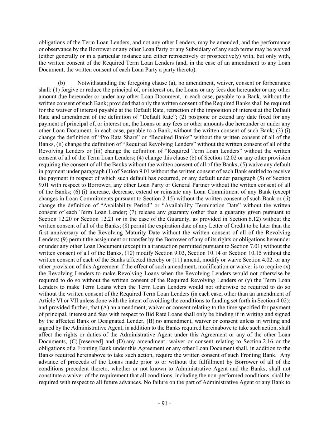 - 91 - obligations of the Term Loan Lenders, and not any other Lenders, may be amended, and the performance or observance by the Borrower or any other Loan Party or any Subsidiary of any such terms may be waived (either generally or in a particular instance and either retroactively or prospectively) with, but only with, the written consent of the Required Term Loan Lenders (and, in the case of an amendment to any Loan Document, the written consent of each Loan Party a party thereto). (b) Notwithstanding the foregoing clause (a), no amendment, waiver, consent or forbearance shall: (1) forgive or reduce the principal of, or interest on, the Loans or any fees due hereunder or any other amount due hereunder or under any other Loan Document, in each case, payable to a Bank, without the written consent of such Bank; provided that only the written consent of the Required Banks shall be required for the waiver of interest payable at the Default Rate, retraction of the imposition of interest at the Default Rate and amendment of the definition of “Default Rate”; (2) postpone or extend any date fixed for any payment of principal of, or interest on, the Loans or any fees or other amounts due hereunder or under any other Loan Document, in each case, payable to a Bank, without the written consent of such Bank; (3) (i) change the definition of “Pro Rata Share” or “Required Banks” without the written consent of all of the Banks, (ii) change the definition of “Required Revolving Lenders” without the written consent of all of the Revolving Lenders or (iii) change the definition of “Required Term Loan Lenders” without the written consent of all of the Term Loan Lenders; (4) change this clause (b) of Section 12.02 or any other provision requiring the consent of all the Banks without the written consent of all of the Banks; (5) waive any default in payment under paragraph (1) of Section 9.01 without the written consent of each Bank entitled to receive the payment in respect of which such default has occurred, or any default under paragraph (5) of Section 9.01 with respect to Borrower, any other Loan Party or General Partner without the written consent of all of the Banks; (6) (i) increase, decrease, extend or reinstate any Loan Commitment of any Bank (except changes in Loan Commitments pursuant to Section 2.15) without the written consent of such Bank or (ii) change the definition of “Availability Period” or “Availability Termination Date” without the written consent of each Term Loan Lender; (7) release any guaranty (other than a guaranty given pursuant to Section 12.20 or Section 12.21 or in the case of the Guaranty, as provided in Section 6.12) without the written consent of all of the Banks; (8) permit the expiration date of any Letter of Credit to be later than the first anniversary of the Revolving Maturity Date without the written consent of all of the Revolving Lenders; (9) permit the assignment or transfer by the Borrower of any of its rights or obligations hereunder or under any other Loan Document (except in a transaction permitted pursuant to Section 7.01) without the written consent of all of the Banks, (10) modify Section 9.03, Section 10.14 or Section 10.15 without the written consent of each of the Banks affected thereby or (11) amend, modify or waive Section 4.02. or any other provision of this Agreement if the effect of such amendment, modification or waiver is to require (x) the Revolving Lenders to make Revolving Loans when the Revolving Lenders would not otherwise be required to do so without the written consent of the Required Revolving Lenders or (y) the Term Loan Lenders to make Term Loans when the Term Loan Lenders would not otherwise be required to do so without the written consent of the Required Term Loan Lenders (in each case, other than an amendment of Article VI or VII unless done with the intent of avoiding the conditions to funding set forth in Section 4.02); and provided further, that (A) an amendment, waiver or consent relating to the time specified for payment of principal, interest and fees with respect to Bid Rate Loans shall only be binding if in writing and signed by the affected Bank or Designated Lender, (B) no amendment, waiver or consent unless in writing and signed by the Administrative Agent, in addition to the Banks required hereinabove to take such action, shall affect the rights or duties of the Administrative Agent under this Agreement or any of the other Loan Documents, (C) [reserved] and (D) any amendment, waiver or consent relating to Section 2.16 or the obligations of a Fronting Bank under this Agreement or any other Loan Document shall, in addition to the Banks required hereinabove to take such action, require the written consent of such Fronting Bank. Any advance of proceeds of the Loans made prior to or without the fulfillment by Borrower of all of the conditions precedent thereto, whether or not known to Administrative Agent and the Banks, shall not constitute a waiver of the requirement that all conditions, including the non-performed conditions, shall be required with respect to all future advances. No failure on the part of Administrative Agent or any Bank to