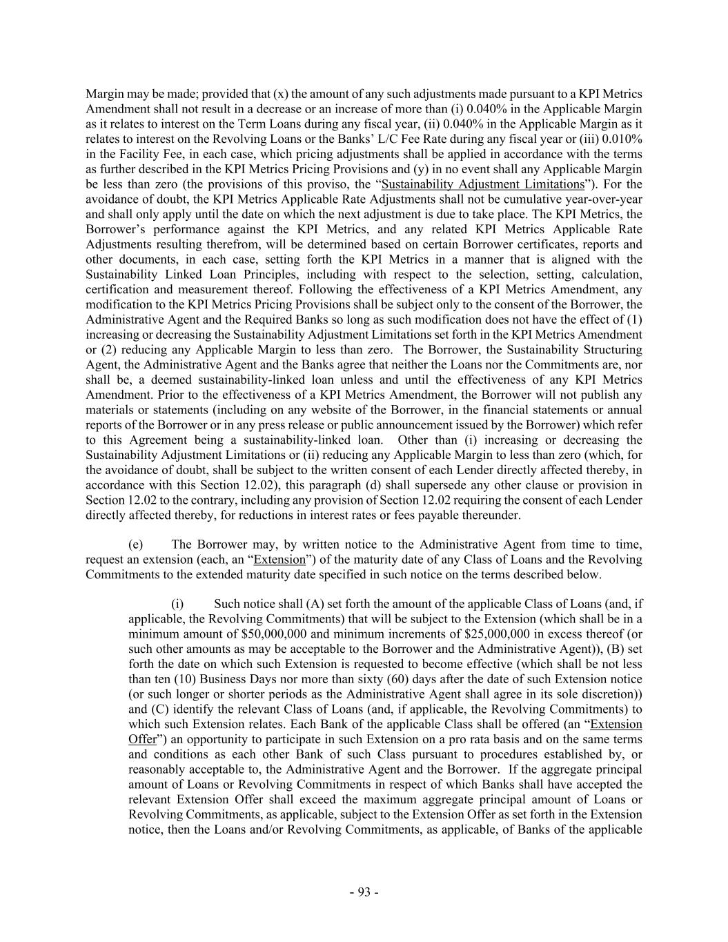 - 93 - Margin may be made; provided that (x) the amount of any such adjustments made pursuant to a KPI Metrics Amendment shall not result in a decrease or an increase of more than (i) 0.040% in the Applicable Margin as it relates to interest on the Term Loans during any fiscal year, (ii) 0.040% in the Applicable Margin as it relates to interest on the Revolving Loans or the Banks’ L/C Fee Rate during any fiscal year or (iii) 0.010% in the Facility Fee, in each case, which pricing adjustments shall be applied in accordance with the terms as further described in the KPI Metrics Pricing Provisions and (y) in no event shall any Applicable Margin be less than zero (the provisions of this proviso, the “Sustainability Adjustment Limitations”). For the avoidance of doubt, the KPI Metrics Applicable Rate Adjustments shall not be cumulative year-over-year and shall only apply until the date on which the next adjustment is due to take place. The KPI Metrics, the Borrower’s performance against the KPI Metrics, and any related KPI Metrics Applicable Rate Adjustments resulting therefrom, will be determined based on certain Borrower certificates, reports and other documents, in each case, setting forth the KPI Metrics in a manner that is aligned with the Sustainability Linked Loan Principles, including with respect to the selection, setting, calculation, certification and measurement thereof. Following the effectiveness of a KPI Metrics Amendment, any modification to the KPI Metrics Pricing Provisions shall be subject only to the consent of the Borrower, the Administrative Agent and the Required Banks so long as such modification does not have the effect of (1) increasing or decreasing the Sustainability Adjustment Limitations set forth in the KPI Metrics Amendment or (2) reducing any Applicable Margin to less than zero. The Borrower, the Sustainability Structuring Agent, the Administrative Agent and the Banks agree that neither the Loans nor the Commitments are, nor shall be, a deemed sustainability-linked loan unless and until the effectiveness of any KPI Metrics Amendment. Prior to the effectiveness of a KPI Metrics Amendment, the Borrower will not publish any materials or statements (including on any website of the Borrower, in the financial statements or annual reports of the Borrower or in any press release or public announcement issued by the Borrower) which refer to this Agreement being a sustainability-linked loan. Other than (i) increasing or decreasing the Sustainability Adjustment Limitations or (ii) reducing any Applicable Margin to less than zero (which, for the avoidance of doubt, shall be subject to the written consent of each Lender directly affected thereby, in accordance with this Section 12.02), this paragraph (d) shall supersede any other clause or provision in Section 12.02 to the contrary, including any provision of Section 12.02 requiring the consent of each Lender directly affected thereby, for reductions in interest rates or fees payable thereunder. (e) The Borrower may, by written notice to the Administrative Agent from time to time, request an extension (each, an “Extension”) of the maturity date of any Class of Loans and the Revolving Commitments to the extended maturity date specified in such notice on the terms described below. (i) Such notice shall (A) set forth the amount of the applicable Class of Loans (and, if applicable, the Revolving Commitments) that will be subject to the Extension (which shall be in a minimum amount of $50,000,000 and minimum increments of $25,000,000 in excess thereof (or such other amounts as may be acceptable to the Borrower and the Administrative Agent)), (B) set forth the date on which such Extension is requested to become effective (which shall be not less than ten (10) Business Days nor more than sixty (60) days after the date of such Extension notice (or such longer or shorter periods as the Administrative Agent shall agree in its sole discretion)) and (C) identify the relevant Class of Loans (and, if applicable, the Revolving Commitments) to which such Extension relates. Each Bank of the applicable Class shall be offered (an “Extension Offer”) an opportunity to participate in such Extension on a pro rata basis and on the same terms and conditions as each other Bank of such Class pursuant to procedures established by, or reasonably acceptable to, the Administrative Agent and the Borrower. If the aggregate principal amount of Loans or Revolving Commitments in respect of which Banks shall have accepted the relevant Extension Offer shall exceed the maximum aggregate principal amount of Loans or Revolving Commitments, as applicable, subject to the Extension Offer as set forth in the Extension notice, then the Loans and/or Revolving Commitments, as applicable, of Banks of the applicable