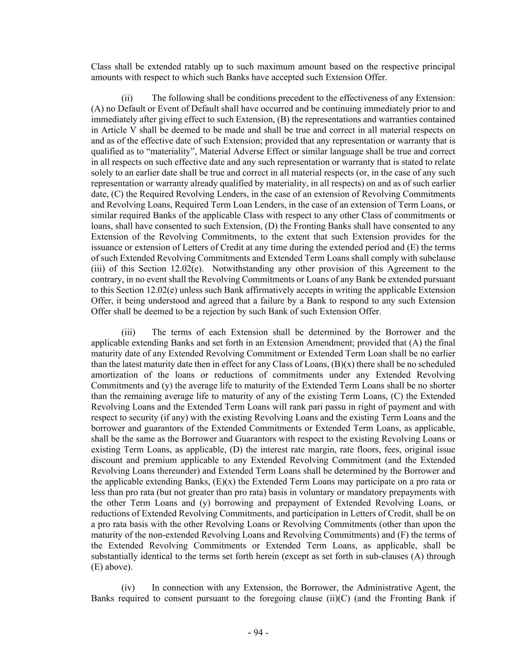 - 94 - Class shall be extended ratably up to such maximum amount based on the respective principal amounts with respect to which such Banks have accepted such Extension Offer. (ii) The following shall be conditions precedent to the effectiveness of any Extension: (A) no Default or Event of Default shall have occurred and be continuing immediately prior to and immediately after giving effect to such Extension, (B) the representations and warranties contained in Article V shall be deemed to be made and shall be true and correct in all material respects on and as of the effective date of such Extension; provided that any representation or warranty that is qualified as to “materiality”, Material Adverse Effect or similar language shall be true and correct in all respects on such effective date and any such representation or warranty that is stated to relate solely to an earlier date shall be true and correct in all material respects (or, in the case of any such representation or warranty already qualified by materiality, in all respects) on and as of such earlier date, (C) the Required Revolving Lenders, in the case of an extension of Revolving Commitments and Revolving Loans, Required Term Loan Lenders, in the case of an extension of Term Loans, or similar required Banks of the applicable Class with respect to any other Class of commitments or loans, shall have consented to such Extension, (D) the Fronting Banks shall have consented to any Extension of the Revolving Commitments, to the extent that such Extension provides for the issuance or extension of Letters of Credit at any time during the extended period and (E) the terms of such Extended Revolving Commitments and Extended Term Loans shall comply with subclause (iii) of this Section 12.02(e). Notwithstanding any other provision of this Agreement to the contrary, in no event shall the Revolving Commitments or Loans of any Bank be extended pursuant to this Section 12.02(e) unless such Bank affirmatively accepts in writing the applicable Extension Offer, it being understood and agreed that a failure by a Bank to respond to any such Extension Offer shall be deemed to be a rejection by such Bank of such Extension Offer. (iii) The terms of each Extension shall be determined by the Borrower and the applicable extending Banks and set forth in an Extension Amendment; provided that (A) the final maturity date of any Extended Revolving Commitment or Extended Term Loan shall be no earlier than the latest maturity date then in effect for any Class of Loans, (B)(x) there shall be no scheduled amortization of the loans or reductions of commitments under any Extended Revolving Commitments and (y) the average life to maturity of the Extended Term Loans shall be no shorter than the remaining average life to maturity of any of the existing Term Loans, (C) the Extended Revolving Loans and the Extended Term Loans will rank pari passu in right of payment and with respect to security (if any) with the existing Revolving Loans and the existing Term Loans and the borrower and guarantors of the Extended Commitments or Extended Term Loans, as applicable, shall be the same as the Borrower and Guarantors with respect to the existing Revolving Loans or existing Term Loans, as applicable, (D) the interest rate margin, rate floors, fees, original issue discount and premium applicable to any Extended Revolving Commitment (and the Extended Revolving Loans thereunder) and Extended Term Loans shall be determined by the Borrower and the applicable extending Banks, (E)(x) the Extended Term Loans may participate on a pro rata or less than pro rata (but not greater than pro rata) basis in voluntary or mandatory prepayments with the other Term Loans and (y) borrowing and prepayment of Extended Revolving Loans, or reductions of Extended Revolving Commitments, and participation in Letters of Credit, shall be on a pro rata basis with the other Revolving Loans or Revolving Commitments (other than upon the maturity of the non-extended Revolving Loans and Revolving Commitments) and (F) the terms of the Extended Revolving Commitments or Extended Term Loans, as applicable, shall be substantially identical to the terms set forth herein (except as set forth in sub-clauses (A) through (E) above). (iv) In connection with any Extension, the Borrower, the Administrative Agent, the Banks required to consent pursuant to the foregoing clause (ii)(C) (and the Fronting Bank if