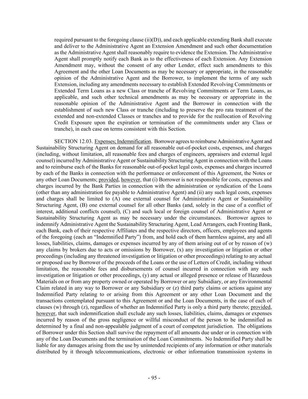 - 95 - required pursuant to the foregoing clause (ii)(D)), and each applicable extending Bank shall execute and deliver to the Administrative Agent an Extension Amendment and such other documentation as the Administrative Agent shall reasonably require to evidence the Extension. The Administrative Agent shall promptly notify each Bank as to the effectiveness of each Extension. Any Extension Amendment may, without the consent of any other Lender, effect such amendments to this Agreement and the other Loan Documents as may be necessary or appropriate, in the reasonable opinion of the Administrative Agent and the Borrower, to implement the terms of any such Extension, including any amendments necessary to establish Extended Revolving Commitments or Extended Term Loans as a new Class or tranche of Revolving Commitments or Term Loans, as applicable, and such other technical amendments as may be necessary or appropriate in the reasonable opinion of the Administrative Agent and the Borrower in connection with the establishment of such new Class or tranche (including to preserve the pro rata treatment of the extended and non-extended Classes or tranches and to provide for the reallocation of Revolving Credit Exposure upon the expiration or termination of the commitments under any Class or tranche), in each case on terms consistent with this Section. SECTION 12.03. Expenses; Indemnification. Borrower agrees to reimburse Administrative Agent and Sustainability Structuring Agent on demand for all reasonable out-of-pocket costs, expenses, and charges (including, without limitation, all reasonable fees and charges of engineers, appraisers and external legal counsel) incurred by Administrative Agent or Sustainability Structuring Agent in connection with the Loans and to reimburse each of the Banks for reasonable out-of-pocket legal costs, expenses and charges incurred by each of the Banks in connection with the performance or enforcement of this Agreement, the Notes or any other Loan Documents; provided, however, that (i) Borrower is not responsible for costs, expenses and charges incurred by the Bank Parties in connection with the administration or syndication of the Loans (other than any administration fee payable to Administrative Agent) and (ii) any such legal costs, expenses and charges shall be limited to (A) one external counsel for Administrative Agent or Sustainability Structuring Agent, (B) one external counsel for all other Banks (and, solely in the case of a conflict of interest, additional conflicts counsel), (C) and such local or foreign counsel of Administrative Agent or Sustainability Structuring Agent as may be necessary under the circumstances. Borrower agrees to indemnify Administrative Agent the Sustainability Structuring Agent, Lead Arrangers, each Fronting Bank, each Bank, each of their respective Affiliates and the respective directors, officers, employees and agents of the foregoing (each an “Indemnified Party”) from, and hold each of them harmless against, any and all losses, liabilities, claims, damages or expenses incurred by any of them arising out of or by reason of (w) any claims by brokers due to acts or omissions by Borrower, (x) any investigation or litigation or other proceedings (including any threatened investigation or litigation or other proceedings) relating to any actual or proposed use by Borrower of the proceeds of the Loans or the use of Letters of Credit, including without limitation, the reasonable fees and disbursements of counsel incurred in connection with any such investigation or litigation or other proceedings, (y) any actual or alleged presence or release of Hazardous Materials on or from any property owned or operated by Borrower or any Subsidiary, or any Environmental Claim related in any way to Borrower or any Subsidiary or (z) third party claims or actions against any Indemnified Party relating to or arising from this Agreement or any other Loan Document and the transactions contemplated pursuant to this Agreement or and the Loan Documents, in the case of each of clauses (w) through (z), regardless of whether an Indemnified Party is only a third party thereto; provided, however, that such indemnification shall exclude any such losses, liabilities, claims, damages or expenses incurred by reason of the gross negligence or willful misconduct of the person to be indemnified as determined by a final and non-appealable judgment of a court of competent jurisdiction. The obligations of Borrower under this Section shall survive the repayment of all amounts due under or in connection with any of the Loan Documents and the termination of the Loan Commitments. No Indemnified Party shall be liable for any damages arising from the use by unintended recipients of any information or other materials distributed by it through telecommunications, electronic or other information transmission systems in
