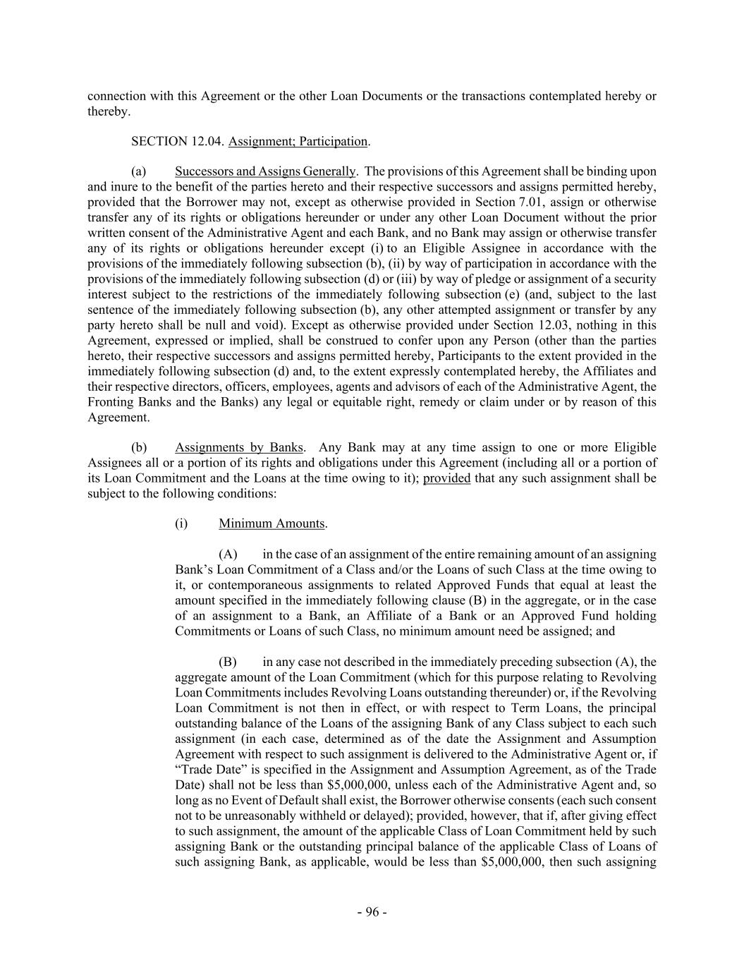 - 96 - connection with this Agreement or the other Loan Documents or the transactions contemplated hereby or thereby. SECTION 12.04. Assignment; Participation. (a) Successors and Assigns Generally. The provisions of this Agreement shall be binding upon and inure to the benefit of the parties hereto and their respective successors and assigns permitted hereby, provided that the Borrower may not, except as otherwise provided in Section 7.01, assign or otherwise transfer any of its rights or obligations hereunder or under any other Loan Document without the prior written consent of the Administrative Agent and each Bank, and no Bank may assign or otherwise transfer any of its rights or obligations hereunder except (i) to an Eligible Assignee in accordance with the provisions of the immediately following subsection (b), (ii) by way of participation in accordance with the provisions of the immediately following subsection (d) or (iii) by way of pledge or assignment of a security interest subject to the restrictions of the immediately following subsection (e) (and, subject to the last sentence of the immediately following subsection (b), any other attempted assignment or transfer by any party hereto shall be null and void). Except as otherwise provided under Section 12.03, nothing in this Agreement, expressed or implied, shall be construed to confer upon any Person (other than the parties hereto, their respective successors and assigns permitted hereby, Participants to the extent provided in the immediately following subsection (d) and, to the extent expressly contemplated hereby, the Affiliates and their respective directors, officers, employees, agents and advisors of each of the Administrative Agent, the Fronting Banks and the Banks) any legal or equitable right, remedy or claim under or by reason of this Agreement. (b) Assignments by Banks. Any Bank may at any time assign to one or more Eligible Assignees all or a portion of its rights and obligations under this Agreement (including all or a portion of its Loan Commitment and the Loans at the time owing to it); provided that any such assignment shall be subject to the following conditions: (i) Minimum Amounts. (A) in the case of an assignment of the entire remaining amount of an assigning Bank’s Loan Commitment of a Class and/or the Loans of such Class at the time owing to it, or contemporaneous assignments to related Approved Funds that equal at least the amount specified in the immediately following clause (B) in the aggregate, or in the case of an assignment to a Bank, an Affiliate of a Bank or an Approved Fund holding Commitments or Loans of such Class, no minimum amount need be assigned; and (B) in any case not described in the immediately preceding subsection (A), the aggregate amount of the Loan Commitment (which for this purpose relating to Revolving Loan Commitments includes Revolving Loans outstanding thereunder) or, if the Revolving Loan Commitment is not then in effect, or with respect to Term Loans, the principal outstanding balance of the Loans of the assigning Bank of any Class subject to each such assignment (in each case, determined as of the date the Assignment and Assumption Agreement with respect to such assignment is delivered to the Administrative Agent or, if “Trade Date” is specified in the Assignment and Assumption Agreement, as of the Trade Date) shall not be less than $5,000,000, unless each of the Administrative Agent and, so long as no Event of Default shall exist, the Borrower otherwise consents (each such consent not to be unreasonably withheld or delayed); provided, however, that if, after giving effect to such assignment, the amount of the applicable Class of Loan Commitment held by such assigning Bank or the outstanding principal balance of the applicable Class of Loans of such assigning Bank, as applicable, would be less than $5,000,000, then such assigning