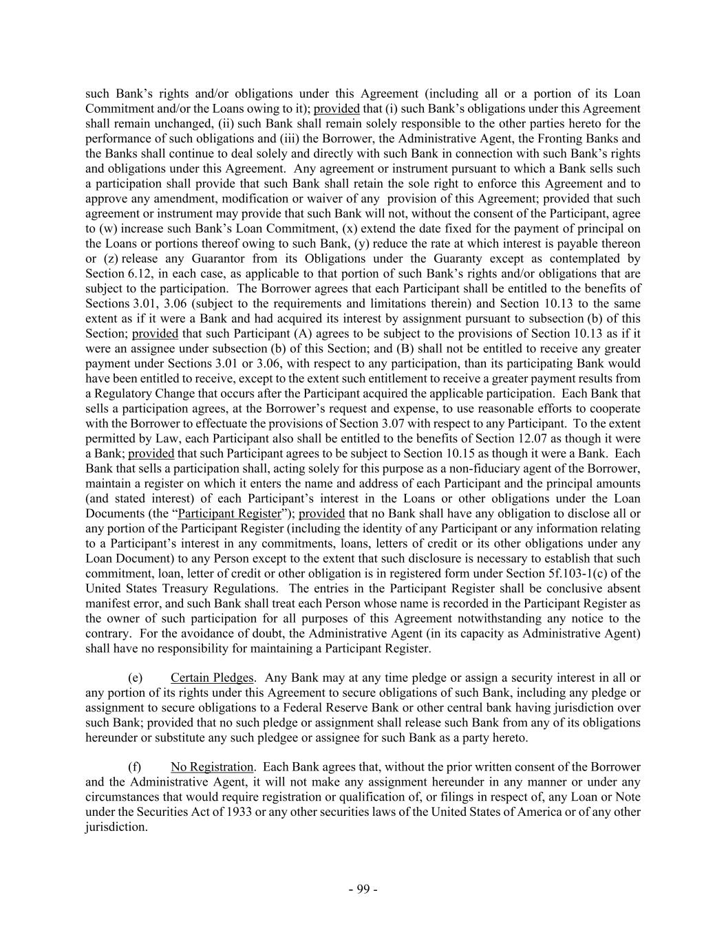 - 99 - such Bank’s rights and/or obligations under this Agreement (including all or a portion of its Loan Commitment and/or the Loans owing to it); provided that (i) such Bank’s obligations under this Agreement shall remain unchanged, (ii) such Bank shall remain solely responsible to the other parties hereto for the performance of such obligations and (iii) the Borrower, the Administrative Agent, the Fronting Banks and the Banks shall continue to deal solely and directly with such Bank in connection with such Bank’s rights and obligations under this Agreement. Any agreement or instrument pursuant to which a Bank sells such a participation shall provide that such Bank shall retain the sole right to enforce this Agreement and to approve any amendment, modification or waiver of any provision of this Agreement; provided that such agreement or instrument may provide that such Bank will not, without the consent of the Participant, agree to (w) increase such Bank’s Loan Commitment, (x) extend the date fixed for the payment of principal on the Loans or portions thereof owing to such Bank, (y) reduce the rate at which interest is payable thereon or (z) release any Guarantor from its Obligations under the Guaranty except as contemplated by Section 6.12, in each case, as applicable to that portion of such Bank’s rights and/or obligations that are subject to the participation. The Borrower agrees that each Participant shall be entitled to the benefits of Sections 3.01, 3.06 (subject to the requirements and limitations therein) and Section 10.13 to the same extent as if it were a Bank and had acquired its interest by assignment pursuant to subsection (b) of this Section; provided that such Participant (A) agrees to be subject to the provisions of Section 10.13 as if it were an assignee under subsection (b) of this Section; and (B) shall not be entitled to receive any greater payment under Sections 3.01 or 3.06, with respect to any participation, than its participating Bank would have been entitled to receive, except to the extent such entitlement to receive a greater payment results from a Regulatory Change that occurs after the Participant acquired the applicable participation. Each Bank that sells a participation agrees, at the Borrower’s request and expense, to use reasonable efforts to cooperate with the Borrower to effectuate the provisions of Section 3.07 with respect to any Participant. To the extent permitted by Law, each Participant also shall be entitled to the benefits of Section 12.07 as though it were a Bank; provided that such Participant agrees to be subject to Section 10.15 as though it were a Bank. Each Bank that sells a participation shall, acting solely for this purpose as a non-fiduciary agent of the Borrower, maintain a register on which it enters the name and address of each Participant and the principal amounts (and stated interest) of each Participant’s interest in the Loans or other obligations under the Loan Documents (the “Participant Register”); provided that no Bank shall have any obligation to disclose all or any portion of the Participant Register (including the identity of any Participant or any information relating to a Participant’s interest in any commitments, loans, letters of credit or its other obligations under any Loan Document) to any Person except to the extent that such disclosure is necessary to establish that such commitment, loan, letter of credit or other obligation is in registered form under Section 5f.103-1(c) of the United States Treasury Regulations. The entries in the Participant Register shall be conclusive absent manifest error, and such Bank shall treat each Person whose name is recorded in the Participant Register as the owner of such participation for all purposes of this Agreement notwithstanding any notice to the contrary. For the avoidance of doubt, the Administrative Agent (in its capacity as Administrative Agent) shall have no responsibility for maintaining a Participant Register. (e) Certain Pledges. Any Bank may at any time pledge or assign a security interest in all or any portion of its rights under this Agreement to secure obligations of such Bank, including any pledge or assignment to secure obligations to a Federal Reserve Bank or other central bank having jurisdiction over such Bank; provided that no such pledge or assignment shall release such Bank from any of its obligations hereunder or substitute any such pledgee or assignee for such Bank as a party hereto. (f) No Registration. Each Bank agrees that, without the prior written consent of the Borrower and the Administrative Agent, it will not make any assignment hereunder in any manner or under any circumstances that would require registration or qualification of, or filings in respect of, any Loan or Note under the Securities Act of 1933 or any other securities laws of the United States of America or of any other jurisdiction.
