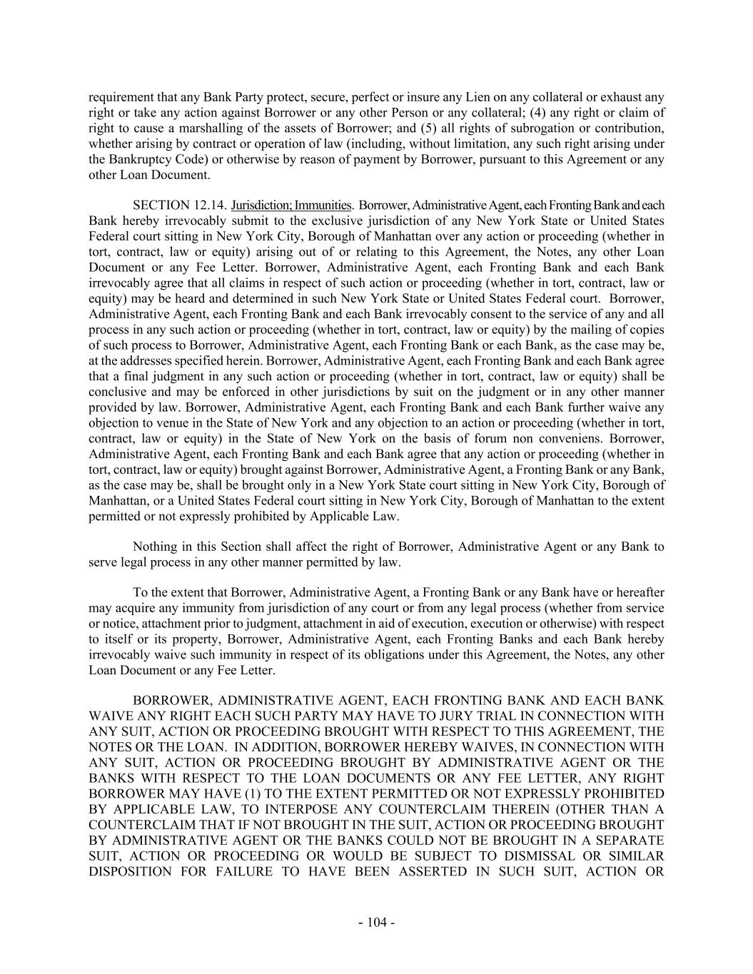 - 104 - requirement that any Bank Party protect, secure, perfect or insure any Lien on any collateral or exhaust any right or take any action against Borrower or any other Person or any collateral; (4) any right or claim of right to cause a marshalling of the assets of Borrower; and (5) all rights of subrogation or contribution, whether arising by contract or operation of law (including, without limitation, any such right arising under the Bankruptcy Code) or otherwise by reason of payment by Borrower, pursuant to this Agreement or any other Loan Document. SECTION 12.14. Jurisdiction; Immunities. Borrower, Administrative Agent, each Fronting Bank and each Bank hereby irrevocably submit to the exclusive jurisdiction of any New York State or United States Federal court sitting in New York City, Borough of Manhattan over any action or proceeding (whether in tort, contract, law or equity) arising out of or relating to this Agreement, the Notes, any other Loan Document or any Fee Letter. Borrower, Administrative Agent, each Fronting Bank and each Bank irrevocably agree that all claims in respect of such action or proceeding (whether in tort, contract, law or equity) may be heard and determined in such New York State or United States Federal court. Borrower, Administrative Agent, each Fronting Bank and each Bank irrevocably consent to the service of any and all process in any such action or proceeding (whether in tort, contract, law or equity) by the mailing of copies of such process to Borrower, Administrative Agent, each Fronting Bank or each Bank, as the case may be, at the addresses specified herein. Borrower, Administrative Agent, each Fronting Bank and each Bank agree that a final judgment in any such action or proceeding (whether in tort, contract, law or equity) shall be conclusive and may be enforced in other jurisdictions by suit on the judgment or in any other manner provided by law. Borrower, Administrative Agent, each Fronting Bank and each Bank further waive any objection to venue in the State of New York and any objection to an action or proceeding (whether in tort, contract, law or equity) in the State of New York on the basis of forum non conveniens. Borrower, Administrative Agent, each Fronting Bank and each Bank agree that any action or proceeding (whether in tort, contract, law or equity) brought against Borrower, Administrative Agent, a Fronting Bank or any Bank, as the case may be, shall be brought only in a New York State court sitting in New York City, Borough of Manhattan, or a United States Federal court sitting in New York City, Borough of Manhattan to the extent permitted or not expressly prohibited by Applicable Law. Nothing in this Section shall affect the right of Borrower, Administrative Agent or any Bank to serve legal process in any other manner permitted by law. To the extent that Borrower, Administrative Agent, a Fronting Bank or any Bank have or hereafter may acquire any immunity from jurisdiction of any court or from any legal process (whether from service or notice, attachment prior to judgment, attachment in aid of execution, execution or otherwise) with respect to itself or its property, Borrower, Administrative Agent, each Fronting Banks and each Bank hereby irrevocably waive such immunity in respect of its obligations under this Agreement, the Notes, any other Loan Document or any Fee Letter. BORROWER, ADMINISTRATIVE AGENT, EACH FRONTING BANK AND EACH BANK WAIVE ANY RIGHT EACH SUCH PARTY MAY HAVE TO JURY TRIAL IN CONNECTION WITH ANY SUIT, ACTION OR PROCEEDING BROUGHT WITH RESPECT TO THIS AGREEMENT, THE NOTES OR THE LOAN. IN ADDITION, BORROWER HEREBY WAIVES, IN CONNECTION WITH ANY SUIT, ACTION OR PROCEEDING BROUGHT BY ADMINISTRATIVE AGENT OR THE BANKS WITH RESPECT TO THE LOAN DOCUMENTS OR ANY FEE LETTER, ANY RIGHT BORROWER MAY HAVE (1) TO THE EXTENT PERMITTED OR NOT EXPRESSLY PROHIBITED BY APPLICABLE LAW, TO INTERPOSE ANY COUNTERCLAIM THEREIN (OTHER THAN A COUNTERCLAIM THAT IF NOT BROUGHT IN THE SUIT, ACTION OR PROCEEDING BROUGHT BY ADMINISTRATIVE AGENT OR THE BANKS COULD NOT BE BROUGHT IN A SEPARATE SUIT, ACTION OR PROCEEDING OR WOULD BE SUBJECT TO DISMISSAL OR SIMILAR DISPOSITION FOR FAILURE TO HAVE BEEN ASSERTED IN SUCH SUIT, ACTION OR
