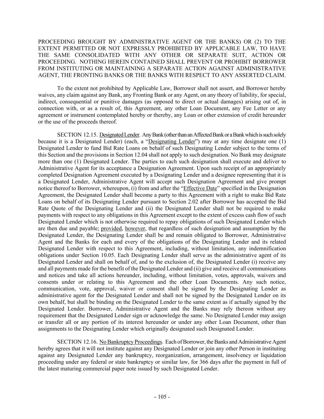 - 105 - PROCEEDING BROUGHT BY ADMINISTRATIVE AGENT OR THE BANKS) OR (2) TO THE EXTENT PERMITTED OR NOT EXPRESSLY PROHIBITED BY APPLICABLE LAW, TO HAVE THE SAME CONSOLIDATED WITH ANY OTHER OR SEPARATE SUIT, ACTION OR PROCEEDING. NOTHING HEREIN CONTAINED SHALL PREVENT OR PROHIBIT BORROWER FROM INSTITUTING OR MAINTAINING A SEPARATE ACTION AGAINST ADMINISTRATIVE AGENT, THE FRONTING BANKS OR THE BANKS WITH RESPECT TO ANY ASSERTED CLAIM. To the extent not prohibited by Applicable Law, Borrower shall not assert, and Borrower hereby waives, any claim against any Bank, any Fronting Bank or any Agent, on any theory of liability, for special, indirect, consequential or punitive damages (as opposed to direct or actual damages) arising out of, in connection with, or as a result of, this Agreement, any other Loan Document, any Fee Letter or any agreement or instrument contemplated hereby or thereby, any Loan or other extension of credit hereunder or the use of the proceeds thereof. SECTION 12.15. Designated Lender. Any Bank (other than an Affected Bank or a Bank which is such solely because it is a Designated Lender) (each, a “Designating Lender”) may at any time designate one (1) Designated Lender to fund Bid Rate Loans on behalf of such Designating Lender subject to the terms of this Section and the provisions in Section 12.04 shall not apply to such designation. No Bank may designate more than one (1) Designated Lender. The parties to each such designation shall execute and deliver to Administrative Agent for its acceptance a Designation Agreement. Upon such receipt of an appropriately completed Designation Agreement executed by a Designating Lender and a designee representing that it is a Designated Lender, Administrative Agent will accept such Designation Agreement and give prompt notice thereof to Borrower, whereupon, (i) from and after the “Effective Date” specified in the Designation Agreement, the Designated Lender shall become a party to this Agreement with a right to make Bid Rate Loans on behalf of its Designating Lender pursuant to Section 2.02 after Borrower has accepted the Bid Rate Quote of the Designating Lender and (ii) the Designated Lender shall not be required to make payments with respect to any obligations in this Agreement except to the extent of excess cash flow of such Designated Lender which is not otherwise required to repay obligations of such Designated Lender which are then due and payable; provided, however, that regardless of such designation and assumption by the Designated Lender, the Designating Lender shall be and remain obligated to Borrower, Administrative Agent and the Banks for each and every of the obligations of the Designating Lender and its related Designated Lender with respect to this Agreement, including, without limitation, any indemnification obligations under Section 10.05. Each Designating Lender shall serve as the administrative agent of its Designated Lender and shall on behalf of, and to the exclusion of, the Designated Lender (i) receive any and all payments made for the benefit of the Designated Lender and (ii) give and receive all communications and notices and take all actions hereunder, including, without limitation, votes, approvals, waivers and consents under or relating to this Agreement and the other Loan Documents. Any such notice, communication, vote, approval, waiver or consent shall be signed by the Designating Lender as administrative agent for the Designated Lender and shall not be signed by the Designated Lender on its own behalf, but shall be binding on the Designated Lender to the same extent as if actually signed by the Designated Lender. Borrower, Administrative Agent and the Banks may rely thereon without any requirement that the Designated Lender sign or acknowledge the same. No Designated Lender may assign or transfer all or any portion of its interest hereunder or under any other Loan Document, other than assignments to the Designating Lender which originally designated such Designated Lender. SECTION 12.16. No Bankruptcy Proceedings. Each of Borrower, the Banks and Administrative Agent hereby agrees that it will not institute against any Designated Lender or join any other Person in instituting against any Designated Lender any bankruptcy, reorganization, arrangement, insolvency or liquidation proceeding under any federal or state bankruptcy or similar law, for 366 days after the payment in full of the latest maturing commercial paper note issued by such Designated Lender.