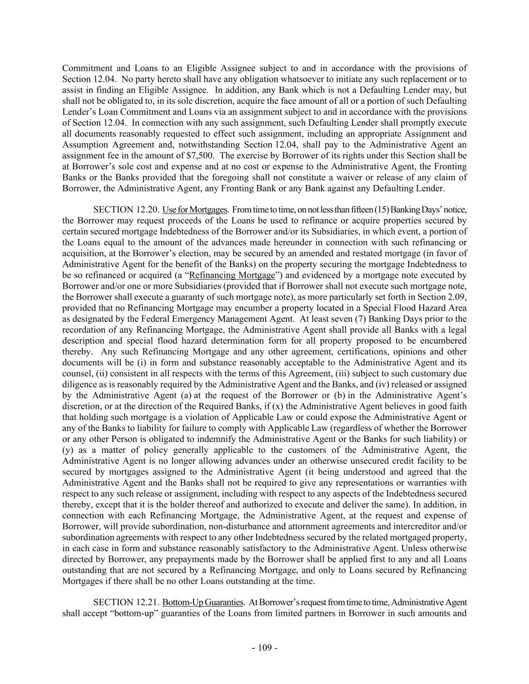 - 109 - Commitment and Loans to an Eligible Assignee subject to and in accordance with the provisions of Section 12.04. No party hereto shall have any obligation whatsoever to initiate any such replacement or to assist in finding an Eligible Assignee. In addition, any Bank which is not a Defaulting Lender may, but shall not be obligated to, in its sole discretion, acquire the face amount of all or a portion of such Defaulting Lender’s Loan Commitment and Loans via an assignment subject to and in accordance with the provisions of Section 12.04. In connection with any such assignment, such Defaulting Lender shall promptly execute all documents reasonably requested to effect such assignment, including an appropriate Assignment and Assumption Agreement and, notwithstanding Section 12.04, shall pay to the Administrative Agent an assignment fee in the amount of $7,500. The exercise by Borrower of its rights under this Section shall be at Borrower’s sole cost and expense and at no cost or expense to the Administrative Agent, the Fronting Banks or the Banks provided that the foregoing shall not constitute a waiver or release of any claim of Borrower, the Administrative Agent, any Fronting Bank or any Bank against any Defaulting Lender. SECTION 12.20. Use for Mortgages. From time to time, on not less than fifteen (15) Banking Days’ notice, the Borrower may request proceeds of the Loans be used to refinance or acquire properties secured by certain secured mortgage Indebtedness of the Borrower and/or its Subsidiaries, in which event, a portion of the Loans equal to the amount of the advances made hereunder in connection with such refinancing or acquisition, at the Borrower’s election, may be secured by an amended and restated mortgage (in favor of Administrative Agent for the benefit of the Banks) on the property securing the mortgage Indebtedness to be so refinanced or acquired (a “Refinancing Mortgage”) and evidenced by a mortgage note executed by Borrower and/or one or more Subsidiaries (provided that if Borrower shall not execute such mortgage note, the Borrower shall execute a guaranty of such mortgage note), as more particularly set forth in Section 2.09, provided that no Refinancing Mortgage may encumber a property located in a Special Flood Hazard Area as designated by the Federal Emergency Management Agent. At least seven (7) Banking Days prior to the recordation of any Refinancing Mortgage, the Administrative Agent shall provide all Banks with a legal description and special flood hazard determination form for all property proposed to be encumbered thereby. Any such Refinancing Mortgage and any other agreement, certifications, opinions and other documents will be (i) in form and substance reasonably acceptable to the Administrative Agent and its counsel, (ii) consistent in all respects with the terms of this Agreement, (iii) subject to such customary due diligence as is reasonably required by the Administrative Agent and the Banks, and (iv) released or assigned by the Administrative Agent (a) at the request of the Borrower or (b) in the Administrative Agent’s discretion, or at the direction of the Required Banks, if (x) the Administrative Agent believes in good faith that holding such mortgage is a violation of Applicable Law or could expose the Administrative Agent or any of the Banks to liability for failure to comply with Applicable Law (regardless of whether the Borrower or any other Person is obligated to indemnify the Administrative Agent or the Banks for such liability) or (y) as a matter of policy generally applicable to the customers of the Administrative Agent, the Administrative Agent is no longer allowing advances under an otherwise unsecured credit facility to be secured by mortgages assigned to the Administrative Agent (it being understood and agreed that the Administrative Agent and the Banks shall not be required to give any representations or warranties with respect to any such release or assignment, including with respect to any aspects of the Indebtedness secured thereby, except that it is the holder thereof and authorized to execute and deliver the same). In addition, in connection with each Refinancing Mortgage, the Administrative Agent, at the request and expense of Borrower, will provide subordination, non-disturbance and attornment agreements and intercreditor and/or subordination agreements with respect to any other Indebtedness secured by the related mortgaged property, in each case in form and substance reasonably satisfactory to the Administrative Agent. Unless otherwise directed by Borrower, any prepayments made by the Borrower shall be applied first to any and all Loans outstanding that are not secured by a Refinancing Mortgage, and only to Loans secured by Refinancing Mortgages if there shall be no other Loans outstanding at the time. SECTION 12.21. Bottom-Up Guaranties. At Borrower’s request from time to time, Administrative Agent shall accept “bottom-up” guaranties of the Loans from limited partners in Borrower in such amounts and