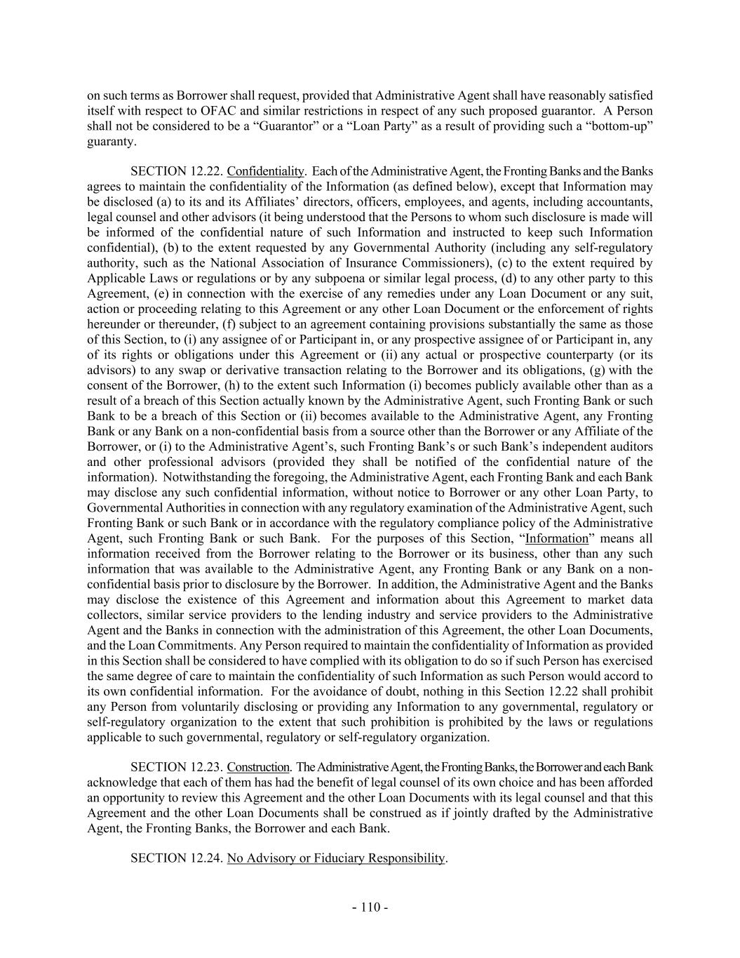 - 110 - on such terms as Borrower shall request, provided that Administrative Agent shall have reasonably satisfied itself with respect to OFAC and similar restrictions in respect of any such proposed guarantor. A Person shall not be considered to be a “Guarantor” or a “Loan Party” as a result of providing such a “bottom-up” guaranty. SECTION 12.22. Confidentiality. Each of the Administrative Agent, the Fronting Banks and the Banks agrees to maintain the confidentiality of the Information (as defined below), except that Information may be disclosed (a) to its and its Affiliates’ directors, officers, employees, and agents, including accountants, legal counsel and other advisors (it being understood that the Persons to whom such disclosure is made will be informed of the confidential nature of such Information and instructed to keep such Information confidential), (b) to the extent requested by any Governmental Authority (including any self-regulatory authority, such as the National Association of Insurance Commissioners), (c) to the extent required by Applicable Laws or regulations or by any subpoena or similar legal process, (d) to any other party to this Agreement, (e) in connection with the exercise of any remedies under any Loan Document or any suit, action or proceeding relating to this Agreement or any other Loan Document or the enforcement of rights hereunder or thereunder, (f) subject to an agreement containing provisions substantially the same as those of this Section, to (i) any assignee of or Participant in, or any prospective assignee of or Participant in, any of its rights or obligations under this Agreement or (ii) any actual or prospective counterparty (or its advisors) to any swap or derivative transaction relating to the Borrower and its obligations, (g) with the consent of the Borrower, (h) to the extent such Information (i) becomes publicly available other than as a result of a breach of this Section actually known by the Administrative Agent, such Fronting Bank or such Bank to be a breach of this Section or (ii) becomes available to the Administrative Agent, any Fronting Bank or any Bank on a non-confidential basis from a source other than the Borrower or any Affiliate of the Borrower, or (i) to the Administrative Agent’s, such Fronting Bank’s or such Bank’s independent auditors and other professional advisors (provided they shall be notified of the confidential nature of the information). Notwithstanding the foregoing, the Administrative Agent, each Fronting Bank and each Bank may disclose any such confidential information, without notice to Borrower or any other Loan Party, to Governmental Authorities in connection with any regulatory examination of the Administrative Agent, such Fronting Bank or such Bank or in accordance with the regulatory compliance policy of the Administrative Agent, such Fronting Bank or such Bank. For the purposes of this Section, “Information” means all information received from the Borrower relating to the Borrower or its business, other than any such information that was available to the Administrative Agent, any Fronting Bank or any Bank on a non- confidential basis prior to disclosure by the Borrower. In addition, the Administrative Agent and the Banks may disclose the existence of this Agreement and information about this Agreement to market data collectors, similar service providers to the lending industry and service providers to the Administrative Agent and the Banks in connection with the administration of this Agreement, the other Loan Documents, and the Loan Commitments. Any Person required to maintain the confidentiality of Information as provided in this Section shall be considered to have complied with its obligation to do so if such Person has exercised the same degree of care to maintain the confidentiality of such Information as such Person would accord to its own confidential information. For the avoidance of doubt, nothing in this Section 12.22 shall prohibit any Person from voluntarily disclosing or providing any Information to any governmental, regulatory or self-regulatory organization to the extent that such prohibition is prohibited by the laws or regulations applicable to such governmental, regulatory or self-regulatory organization. SECTION 12.23. Construction. The Administrative Agent, the Fronting Banks, the Borrower and each Bank acknowledge that each of them has had the benefit of legal counsel of its own choice and has been afforded an opportunity to review this Agreement and the other Loan Documents with its legal counsel and that this Agreement and the other Loan Documents shall be construed as if jointly drafted by the Administrative Agent, the Fronting Banks, the Borrower and each Bank. SECTION 12.24. No Advisory or Fiduciary Responsibility.