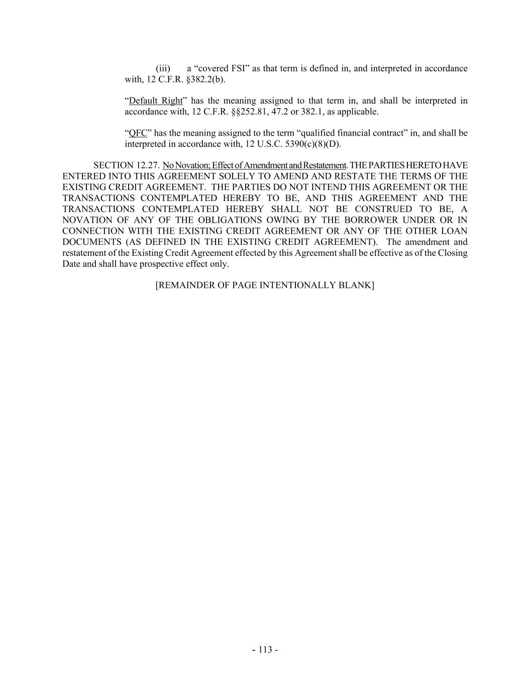 - 113 - (iii) a “covered FSI” as that term is defined in, and interpreted in accordance with, 12 C.F.R. §382.2(b). “Default Right” has the meaning assigned to that term in, and shall be interpreted in accordance with, 12 C.F.R. §§252.81, 47.2 or 382.1, as applicable. “QFC” has the meaning assigned to the term “qualified financial contract” in, and shall be interpreted in accordance with, 12 U.S.C. 5390(c)(8)(D). SECTION 12.27. No Novation; Effect of Amendment and Restatement. THE PARTIES HERETO HAVE ENTERED INTO THIS AGREEMENT SOLELY TO AMEND AND RESTATE THE TERMS OF THE EXISTING CREDIT AGREEMENT. THE PARTIES DO NOT INTEND THIS AGREEMENT OR THE TRANSACTIONS CONTEMPLATED HEREBY TO BE, AND THIS AGREEMENT AND THE TRANSACTIONS CONTEMPLATED HEREBY SHALL NOT BE CONSTRUED TO BE, A NOVATION OF ANY OF THE OBLIGATIONS OWING BY THE BORROWER UNDER OR IN CONNECTION WITH THE EXISTING CREDIT AGREEMENT OR ANY OF THE OTHER LOAN DOCUMENTS (AS DEFINED IN THE EXISTING CREDIT AGREEMENT). The amendment and restatement of the Existing Credit Agreement effected by this Agreement shall be effective as of the Closing Date and shall have prospective effect only. [REMAINDER OF PAGE INTENTIONALLY BLANK]