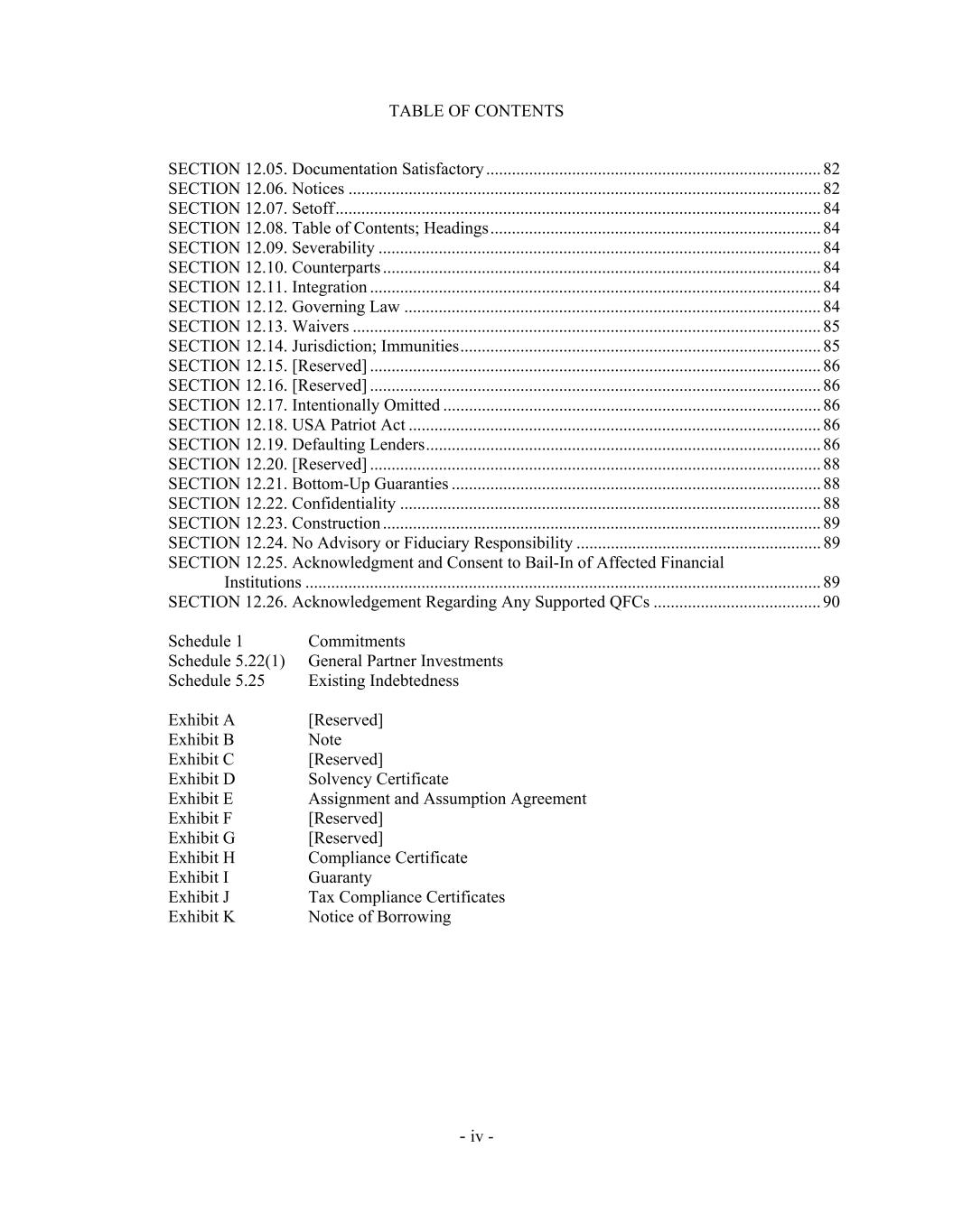 TABLE OF CONTENTS - iv - SECTION 12.05. Documentation Satisfactory .............................................................................. 82 SECTION 12.06. Notices .............................................................................................................. 82 SECTION 12.07. Setoff ................................................................................................................. 84 SECTION 12.08. Table of Contents; Headings ............................................................................. 84 SECTION 12.09. Severability ....................................................................................................... 84 SECTION 12.10. Counterparts ...................................................................................................... 84 SECTION 12.11. Integration ......................................................................................................... 84 SECTION 12.12. Governing Law ................................................................................................. 84 SECTION 12.13. Waivers ............................................................................................................. 85 SECTION 12.14. Jurisdiction; Immunities .................................................................................... 85 SECTION 12.15. [Reserved] ......................................................................................................... 86 SECTION 12.16. [Reserved] ......................................................................................................... 86 SECTION 12.17. Intentionally Omitted ........................................................................................ 86 SECTION 12.18. USA Patriot Act ................................................................................................ 86 SECTION 12.19. Defaulting Lenders ............................................................................................ 86 SECTION 12.20. [Reserved] ......................................................................................................... 88 SECTION 12.21. Bottom-Up Guaranties ...................................................................................... 88 SECTION 12.22. Confidentiality .................................................................................................. 88 SECTION 12.23. Construction ...................................................................................................... 89 SECTION 12.24. No Advisory or Fiduciary Responsibility ......................................................... 89 SECTION 12.25. Acknowledgment and Consent to Bail-In of Affected Financial Institutions ........................................................................................................................ 89 SECTION 12.26. Acknowledgement Regarding Any Supported QFCs ....................................... 90 Schedule 1 Commitments Schedule 5.22(1) General Partner Investments Schedule 5.25 Existing Indebtedness Exhibit A [Reserved] Exhibit B Note Exhibit C [Reserved] Exhibit D Solvency Certificate Exhibit E Assignment and Assumption Agreement Exhibit F [Reserved] Exhibit G [Reserved] Exhibit H Compliance Certificate Exhibit I Guaranty Exhibit J Tax Compliance Certificates Exhibit K Notice of Borrowing