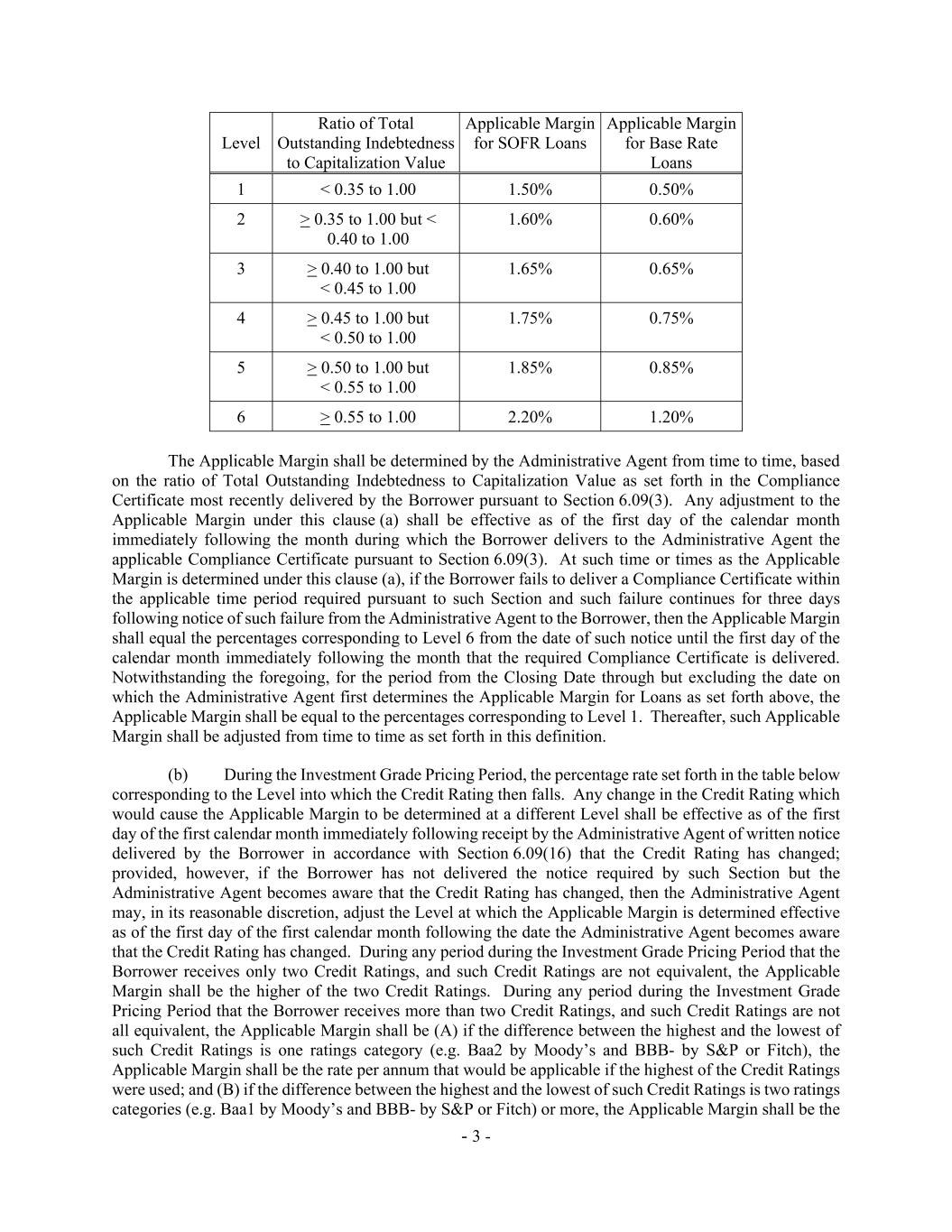 - 3 - Level Ratio of Total Outstanding Indebtedness to Capitalization Value Applicable Margin for SOFR Loans Applicable Margin for Base Rate Loans 1 < 0.35 to 1.00 1.50% 0.50% 2 > 0.35 to 1.00 but < 0.40 to 1.00 1.60% 0.60% 3 > 0.40 to 1.00 but < 0.45 to 1.00 1.65% 0.65% 4 > 0.45 to 1.00 but < 0.50 to 1.00 1.75% 0.75% 5 > 0.50 to 1.00 but < 0.55 to 1.00 1.85% 0.85% 6 > 0.55 to 1.00 2.20% 1.20% The Applicable Margin shall be determined by the Administrative Agent from time to time, based on the ratio of Total Outstanding Indebtedness to Capitalization Value as set forth in the Compliance Certificate most recently delivered by the Borrower pursuant to Section 6.09(3). Any adjustment to the Applicable Margin under this clause (a) shall be effective as of the first day of the calendar month immediately following the month during which the Borrower delivers to the Administrative Agent the applicable Compliance Certificate pursuant to Section 6.09(3). At such time or times as the Applicable Margin is determined under this clause (a), if the Borrower fails to deliver a Compliance Certificate within the applicable time period required pursuant to such Section and such failure continues for three days following notice of such failure from the Administrative Agent to the Borrower, then the Applicable Margin shall equal the percentages corresponding to Level 6 from the date of such notice until the first day of the calendar month immediately following the month that the required Compliance Certificate is delivered. Notwithstanding the foregoing, for the period from the Closing Date through but excluding the date on which the Administrative Agent first determines the Applicable Margin for Loans as set forth above, the Applicable Margin shall be equal to the percentages corresponding to Level 1. Thereafter, such Applicable Margin shall be adjusted from time to time as set forth in this definition. (b) During the Investment Grade Pricing Period, the percentage rate set forth in the table below corresponding to the Level into which the Credit Rating then falls. Any change in the Credit Rating which would cause the Applicable Margin to be determined at a different Level shall be effective as of the first day of the first calendar month immediately following receipt by the Administrative Agent of written notice delivered by the Borrower in accordance with Section 6.09(16) that the Credit Rating has changed; provided, however, if the Borrower has not delivered the notice required by such Section but the Administrative Agent becomes aware that the Credit Rating has changed, then the Administrative Agent may, in its reasonable discretion, adjust the Level at which the Applicable Margin is determined effective as of the first day of the first calendar month following the date the Administrative Agent becomes aware that the Credit Rating has changed. During any period during the Investment Grade Pricing Period that the Borrower receives only two Credit Ratings, and such Credit Ratings are not equivalent, the Applicable Margin shall be the higher of the two Credit Ratings. During any period during the Investment Grade Pricing Period that the Borrower receives more than two Credit Ratings, and such Credit Ratings are not all equivalent, the Applicable Margin shall be (A) if the difference between the highest and the lowest of such Credit Ratings is one ratings category (e.g. Baa2 by Moody’s and BBB- by S&P or Fitch), the Applicable Margin shall be the rate per annum that would be applicable if the highest of the Credit Ratings were used; and (B) if the difference between the highest and the lowest of such Credit Ratings is two ratings categories (e.g. Baa1 by Moody’s and BBB- by S&P or Fitch) or more, the Applicable Margin shall be the